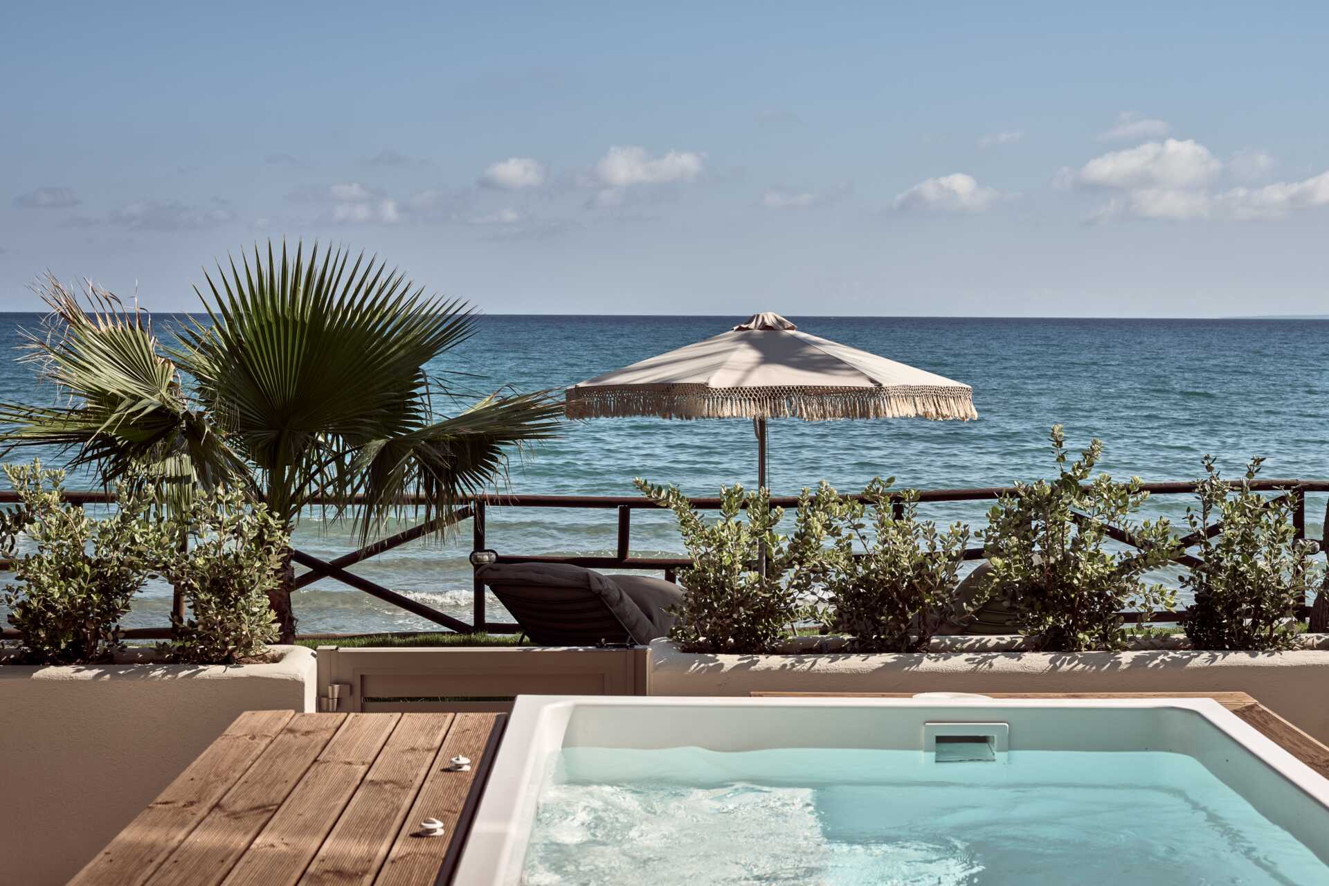 Junior-suite deluxe med jacuzzi og to komfortable lænestole og en sofa på terrassen i stueplan. Soveværelsesdel med dobbeltseng og opholdsrum med sovesofa og lænestol. Gratis wifi, aircondition og deponering. Køleskab. El-kedel og kaffe/te. Kaffemaskine Nespresso. Tv med internationale kanaler. Tøfler. Hårtørrer. Badeværelse med bruser og toilet. Rengøring 7 gange om ugen.