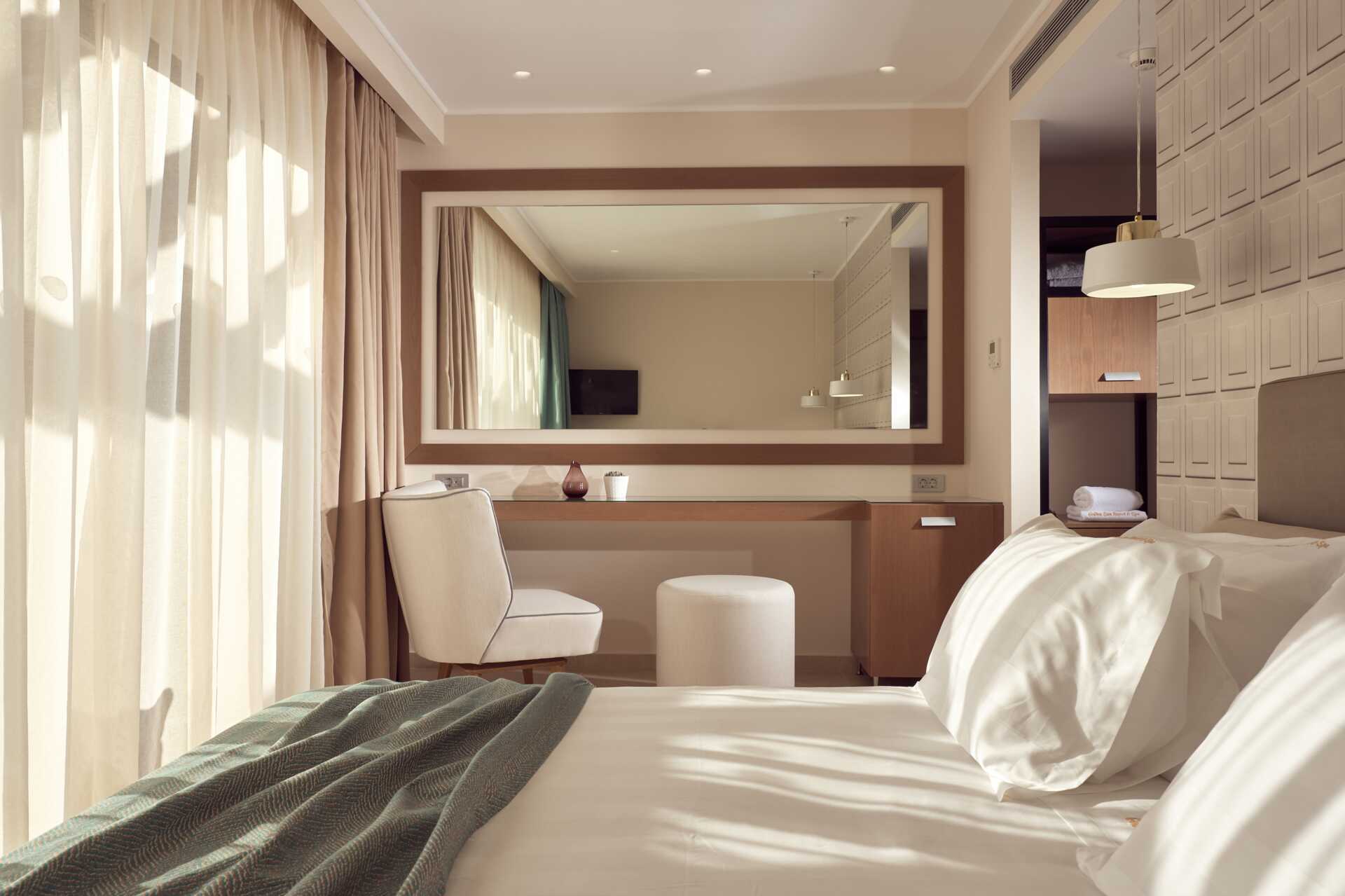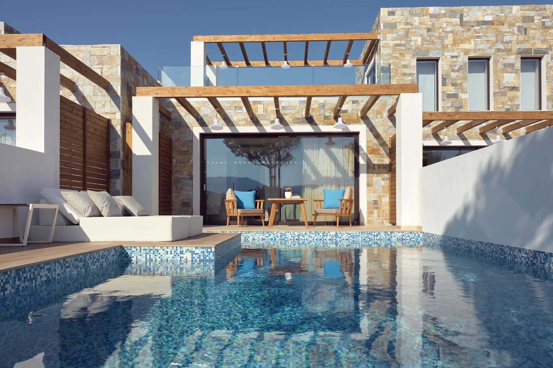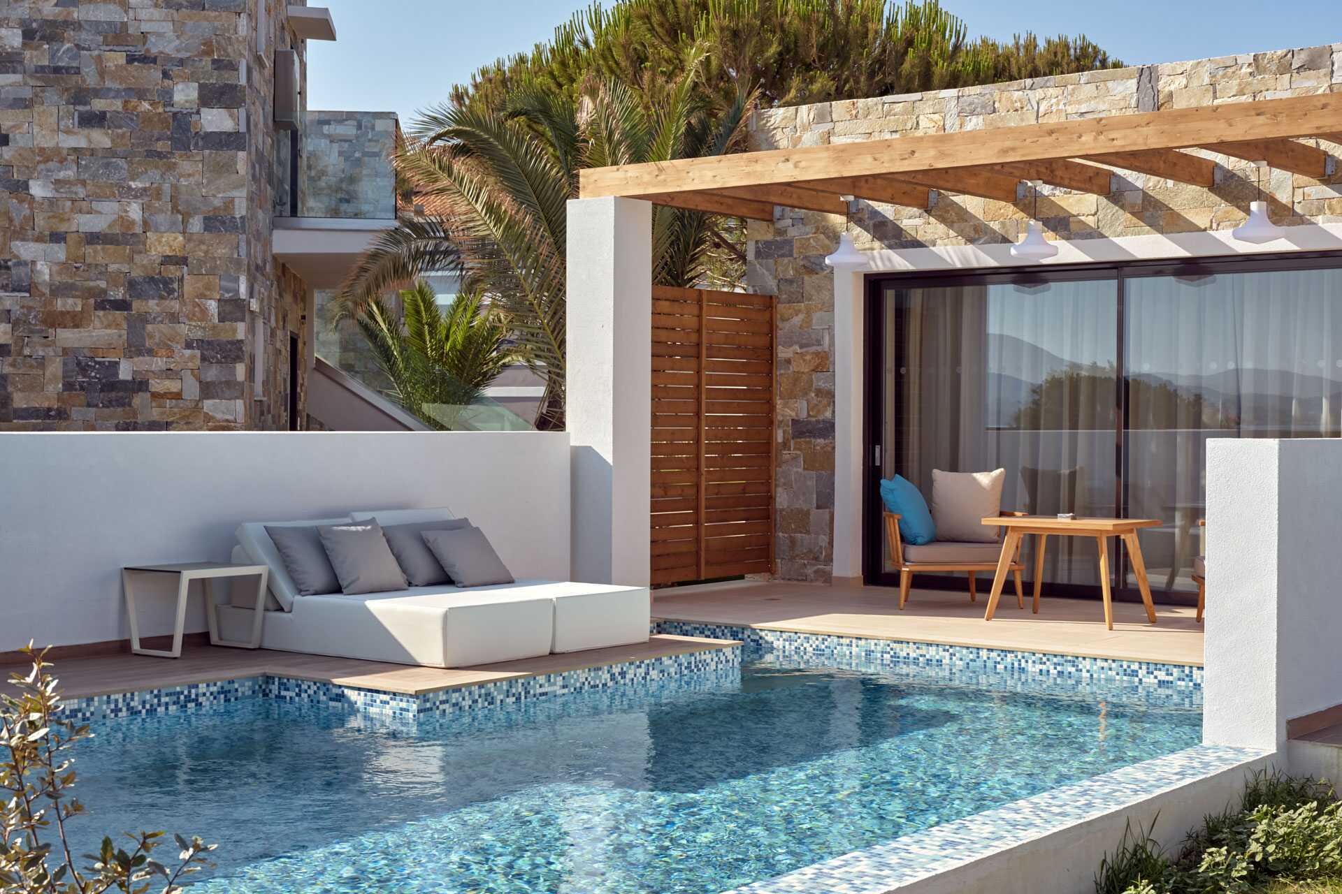 Dobbeltværelser med stor udeplads og privat pool, som ligger i mindre bygninger på hotellets område. På udepladsen er der borde og stole og behagelige solstole. En dobbeltseng. Gratis wifi, aircondition og deponering. Minibar. El-kedel, kaffe og te. Tv med internationale kanaler. Strygefaciliteter. Strygebræt kan lånes. Badekåber og tøfler. Badeværelse med bruser og toilet. Rengøring 7 gange om ugen. Børn under to år er tæller med i det maksimale antal personer på værelset.
