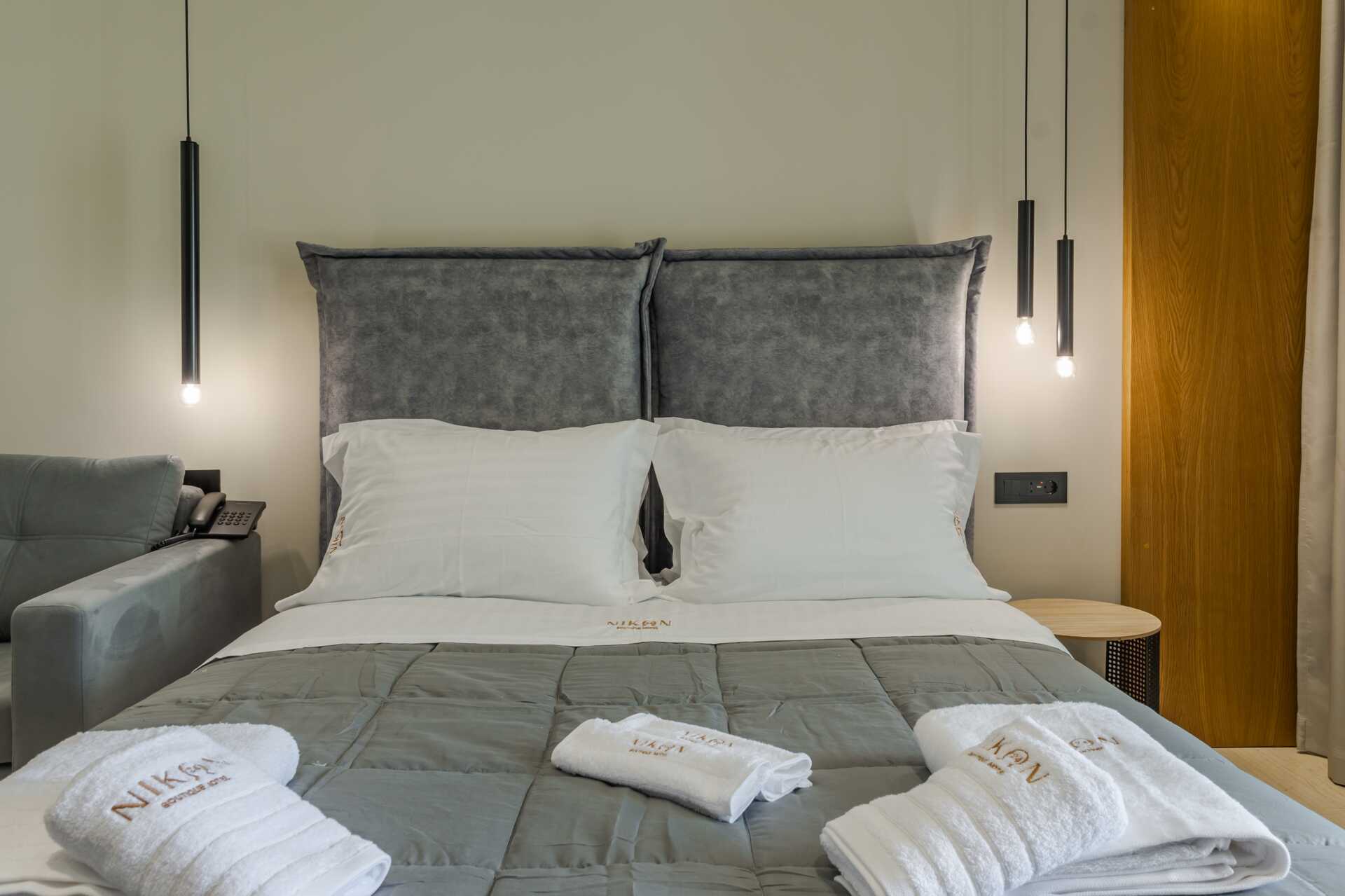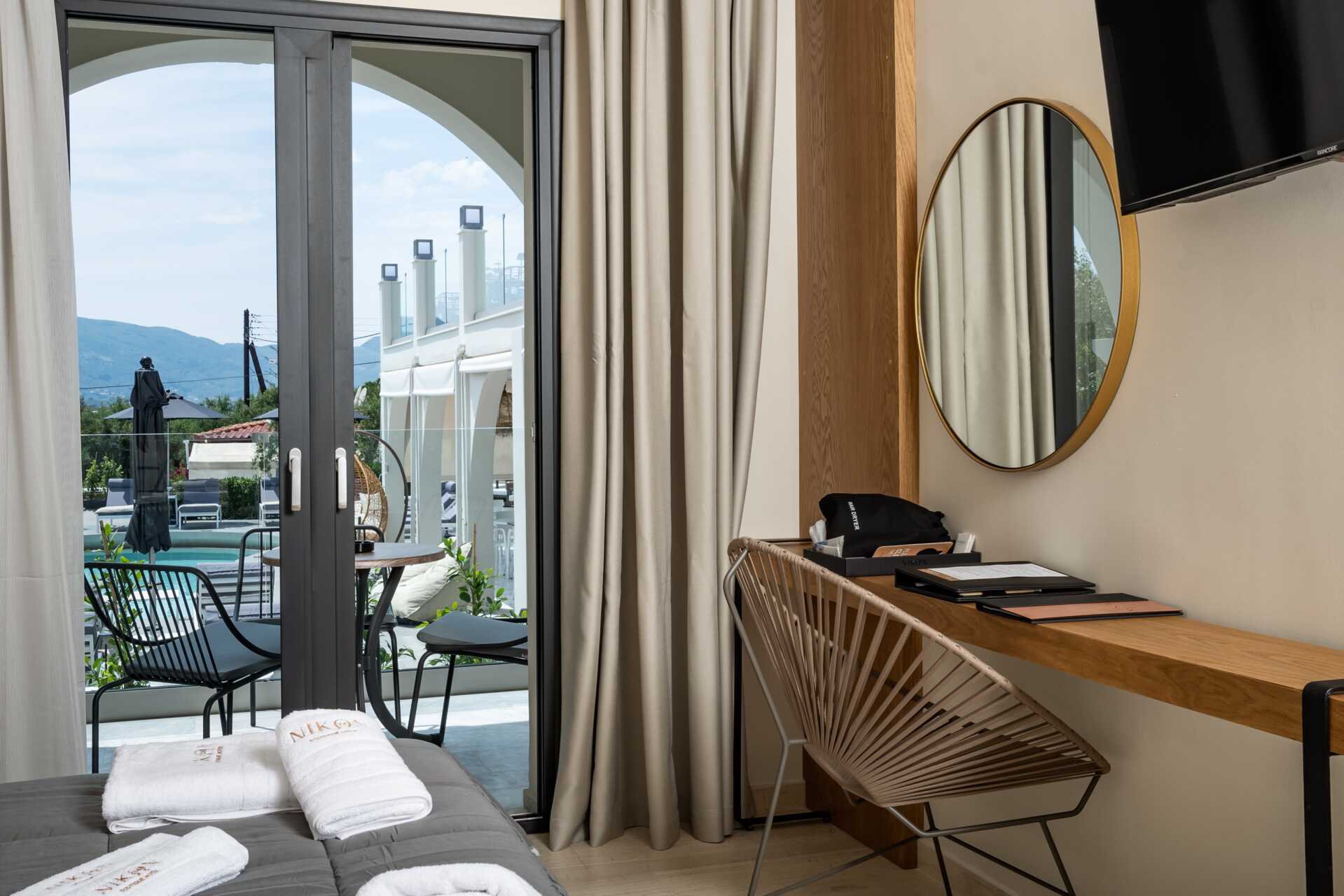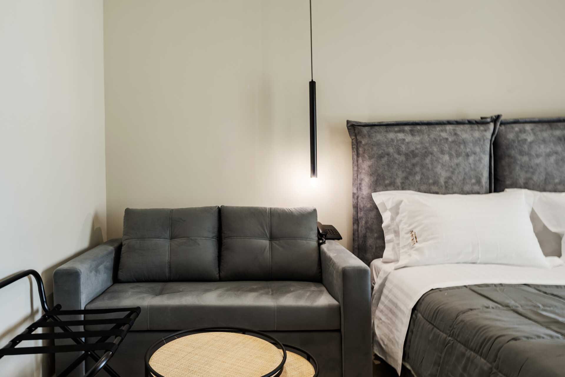 Junior-suite med balkon i stueplan. En dobbeltseng. Mulighed for ekstra opredning i sovesofa. Gratis wifi, aircondition og deponering. Køleskab. El-kedel og kaffe/te. Tv med internationale kanaler. Badekåber og tøfler. Hårtørrer. Badeværelse med bruser og toilet. Rengøring 7 gange om ugen.