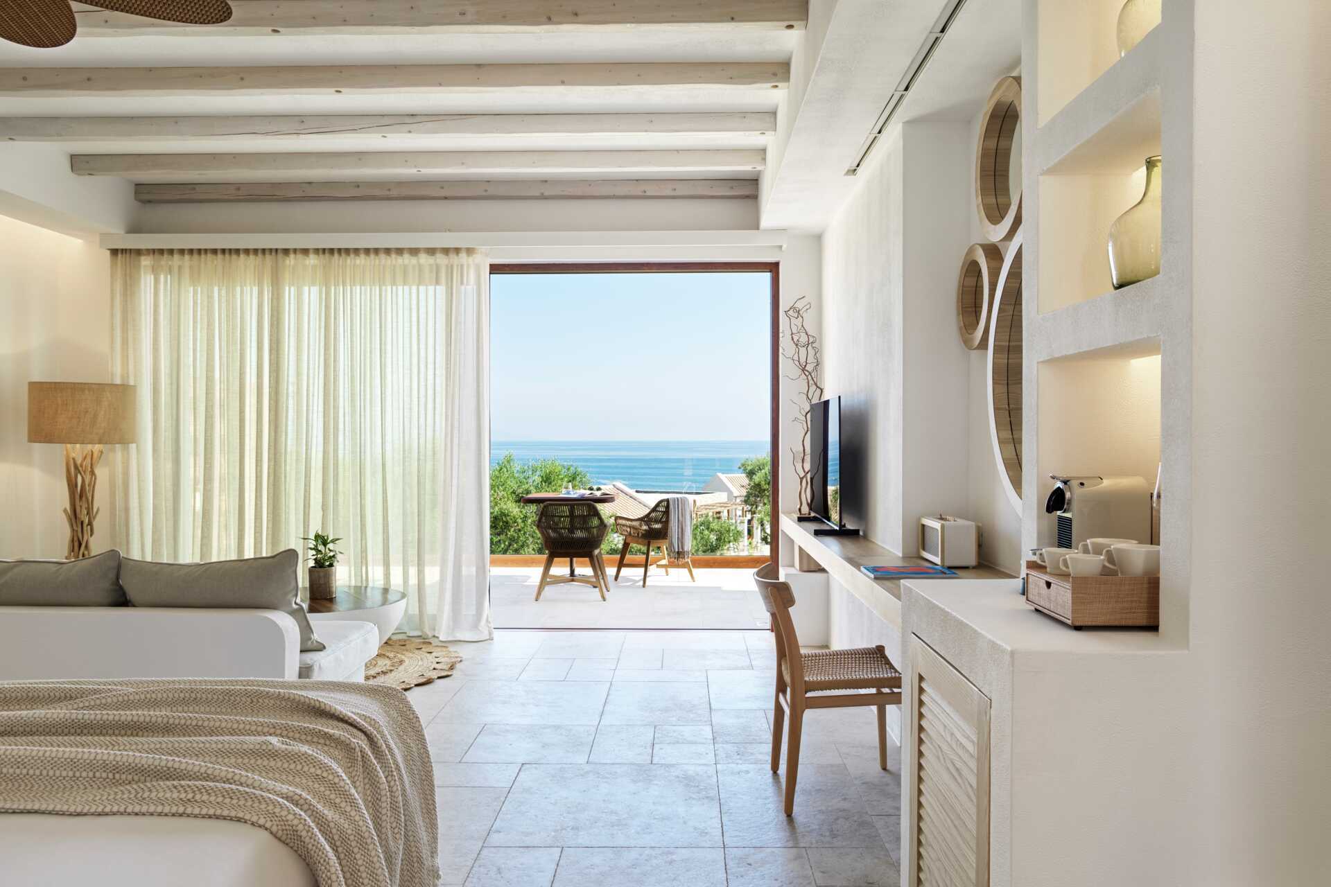 Suiter med terrasse med privat pool, nogle med havudsigt. På terrassen er der pool på ca. 20 kvm., borde og stole samt solstole og parasol. En dobbeltseng. Mulighed for ekstra opredning i sovesofa. Gratis wifi, aircondition og deponering. Minibar. El-kedel og kaffe/te. Bluetooth højttaler. Tv med internationale kanaler. Badekåber og tøfler. Hårtørrer. Badeværelse med to håndvaske, badekar, separat bruser og toilet. Rengøring 7 gange om ugen.