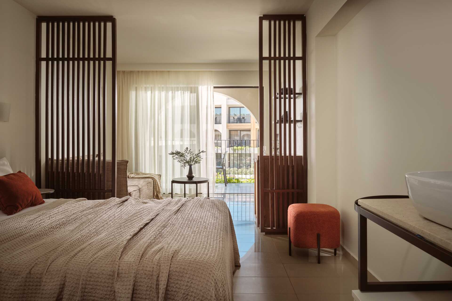 Junior-suite med balkon eller terrasse. Junior-suiterne består af et soveværelse og et opholdsområde, der kan adskilles med en skydedør. En dobbeltseng eller to enkeltsenge. Mulighed for ekstra opredninger i to sovesofaer. Gratis wifi og aircondition. Deponering mod betaling. Køleskab. El-kedel og kaffe/te. Tv med internationale kanaler. Hårtørrer. Badeværelse med bruser og toilet. Rengøring 7 gange om ugen.