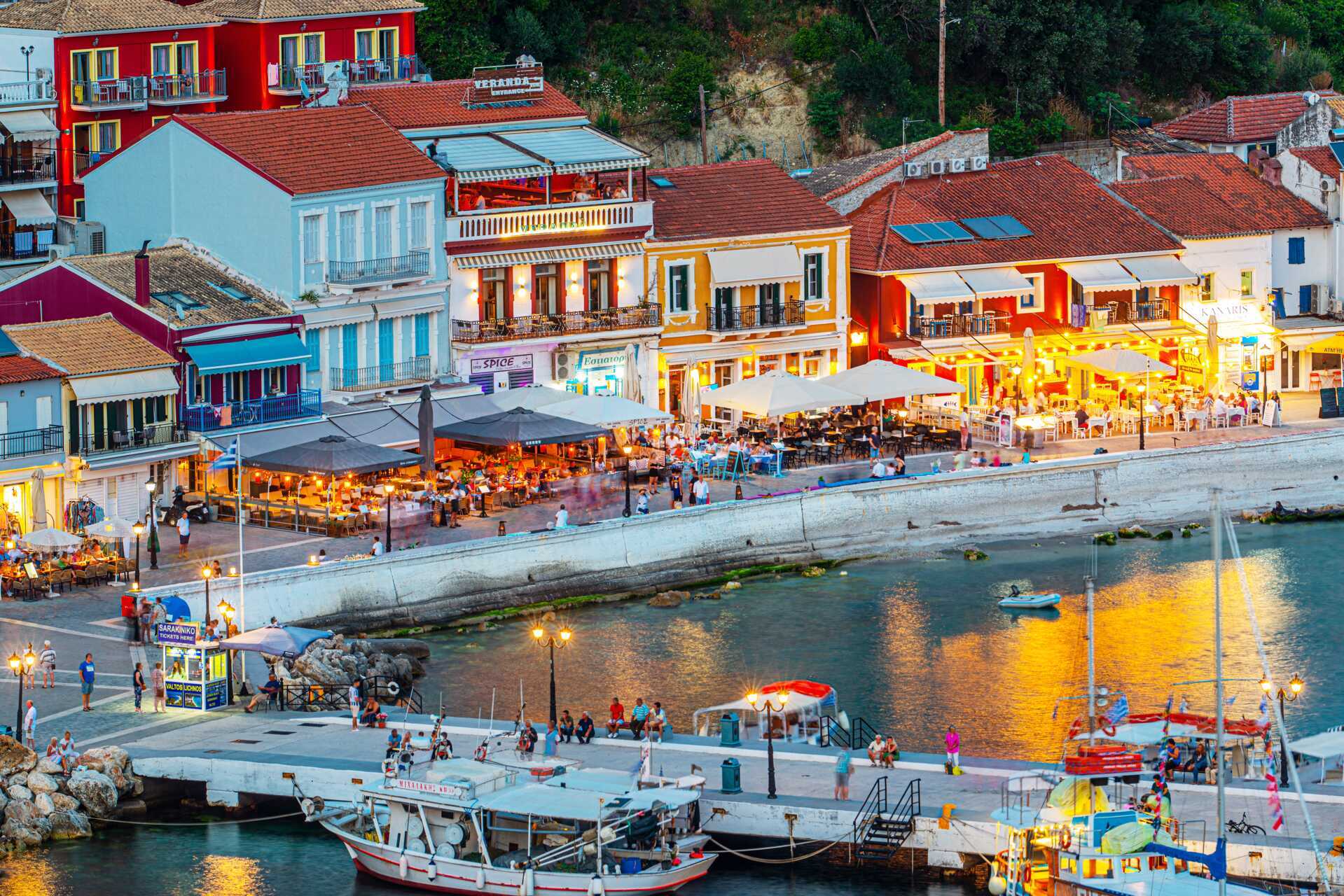 Parga ligger som et smukt amfiteater ved havnen. Om aftenen summer havnen af aktivitet, med hyggelig belysning fra de populære tavernaer, der ligger tæt sammen. Det dufter af grillmad og ferierende par slentrer rundt i den varme aftenbrise.