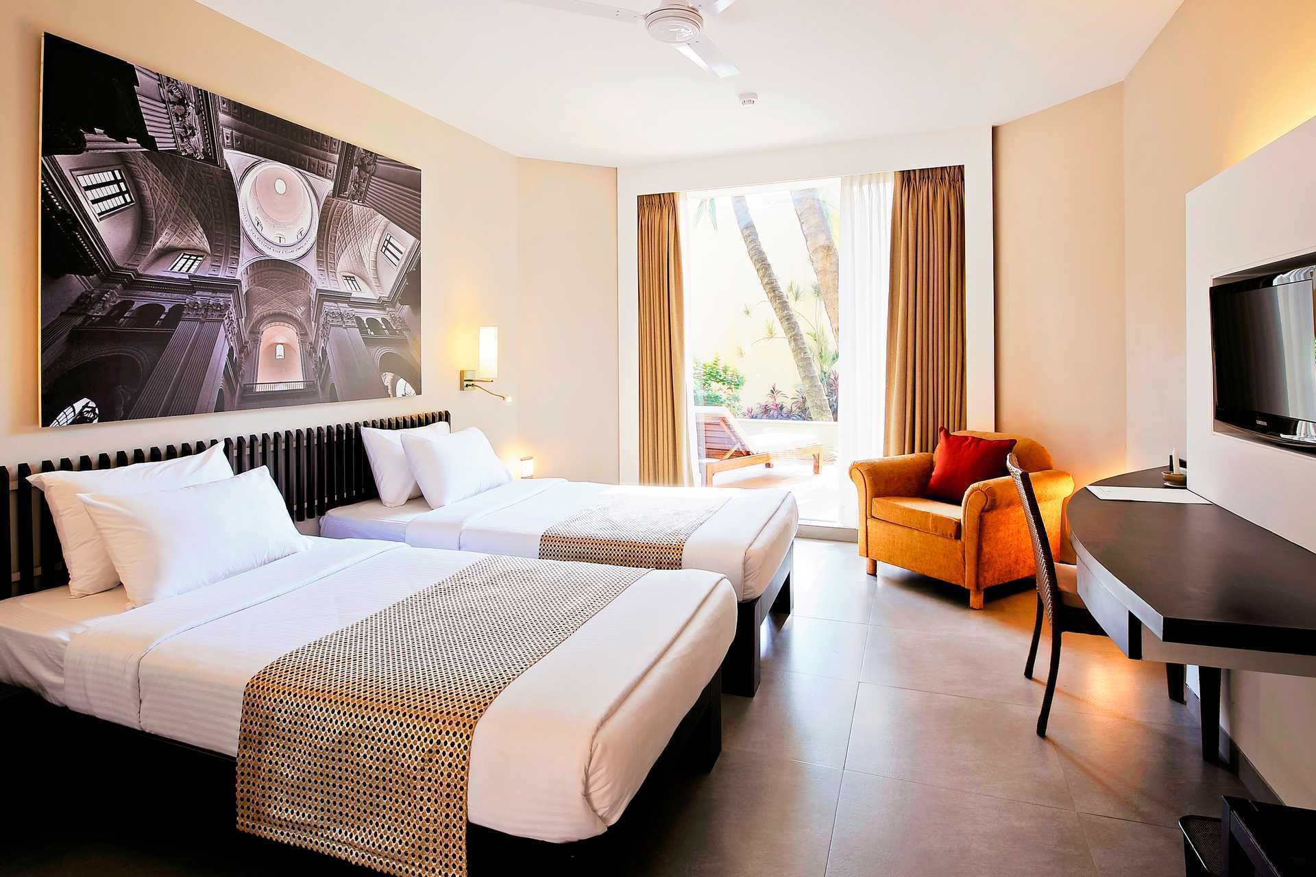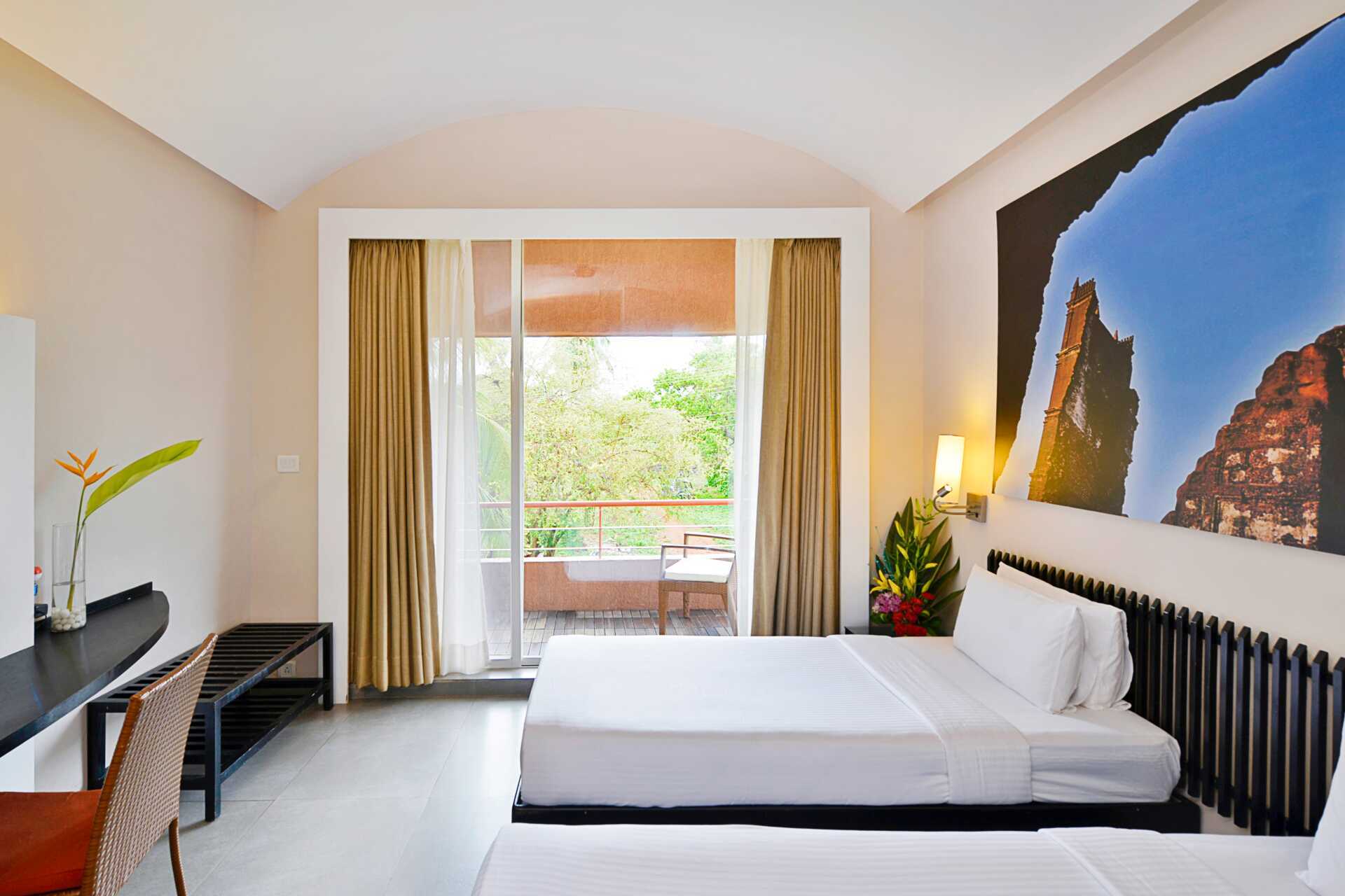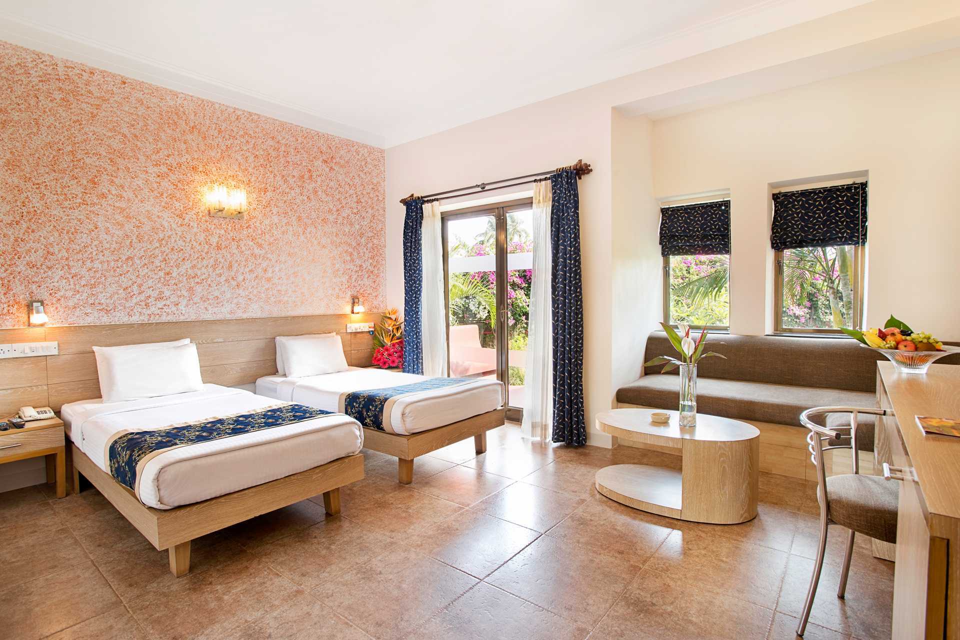 Deluxe-værelse med delt udeplads. En dobbeltseng eller to enkeltsenge. Mulighed for opredning i enkeltseng eller fold ud-seng. Sofagruppe. Gratis wifi, aircondition og deponering. Minibaren indgår en flaske vand - andre drikkevarer og snacks er tilgængelige mod betaling. El-kedel. Tv med internationale kanaler. Hårtørrer. Badeværelse med bruser og toilet. Rengøring 7 gange om ugen. Børn under to år tæller med i det maksimale antal personer på værelset.