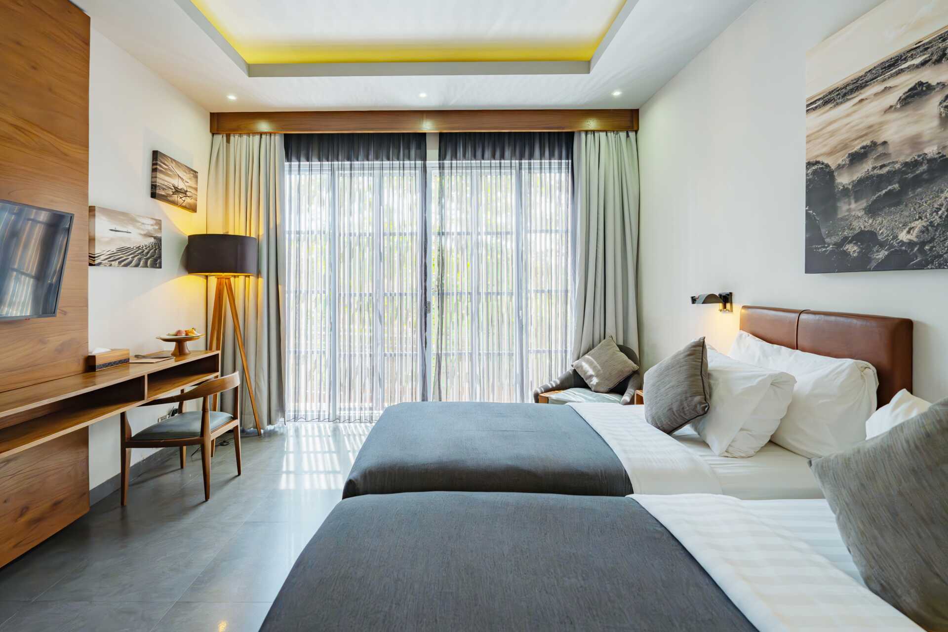 Deluxe-værelser med balkon eller terrasse og pooludsigt. En dobbeltseng eller to enkeltsenge. Mulighed for en ekstra seng til en tredje person. Gratis wifi, aircondition og deponering. El-kedel og kaffe/te. Tv med internationale kanaler. Hårtørrer. Badeværelse med bruser og toilet. Rengøring 7 gange om ugen.
