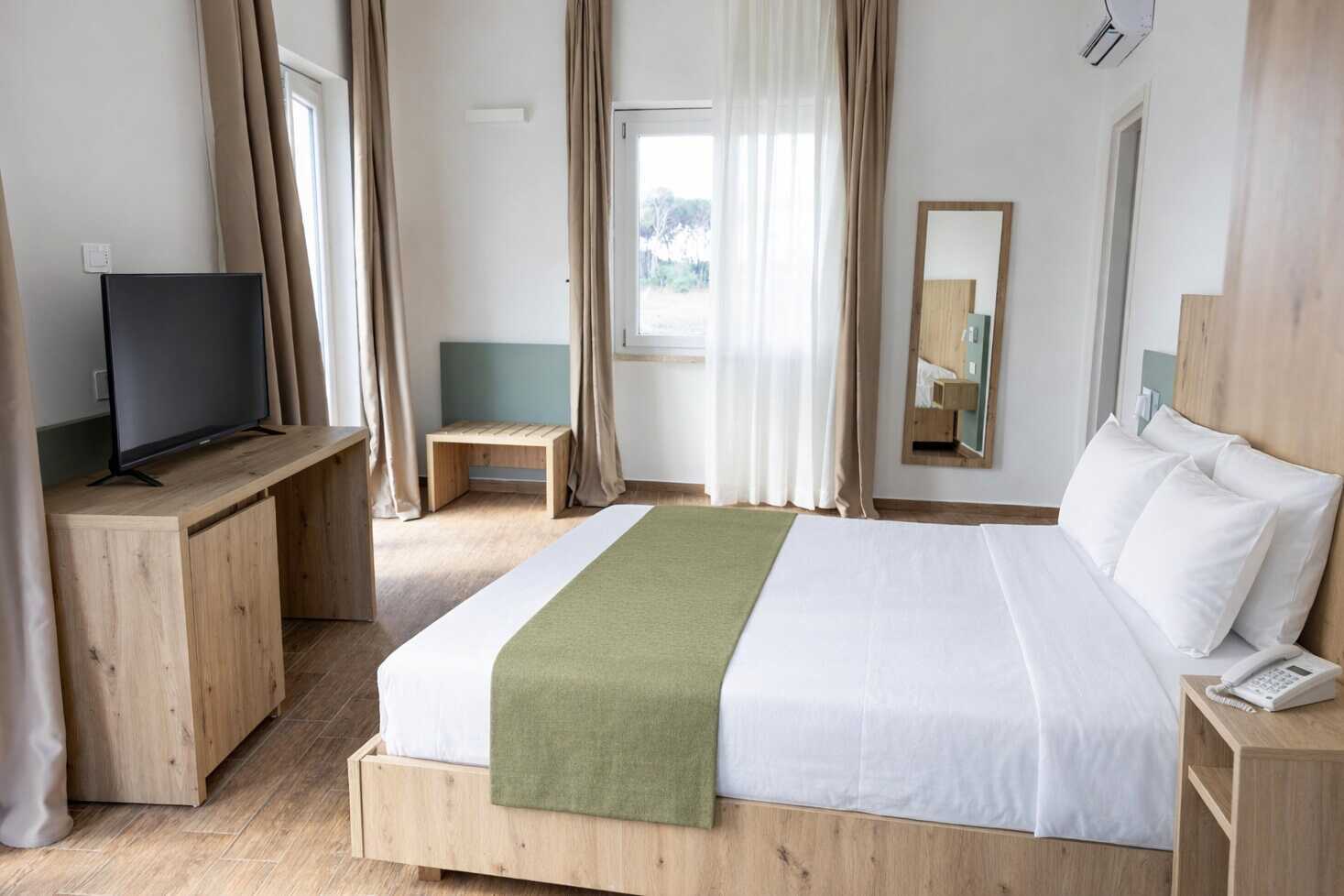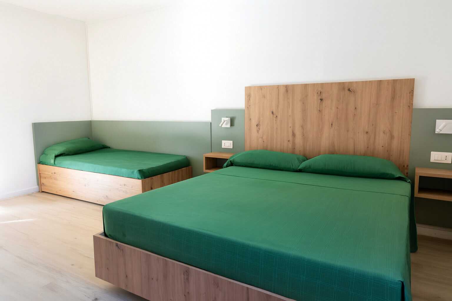 Dobbeltværelse med balkon eller terrasse. En dobbeltseng. Mulighed for ekstra opredning i enkeltseng. Gratis wifi, aircondition og deponering. Køleskab. El-kedel og kaffe/te. Tv med internationale kanaler. Hårtørrer. Badeværelse med bruser og toilet. Rengøring 7 gange om ugen. Dobbeltværelserne er placeret i bygningerne Sole, Oasi og Niso.