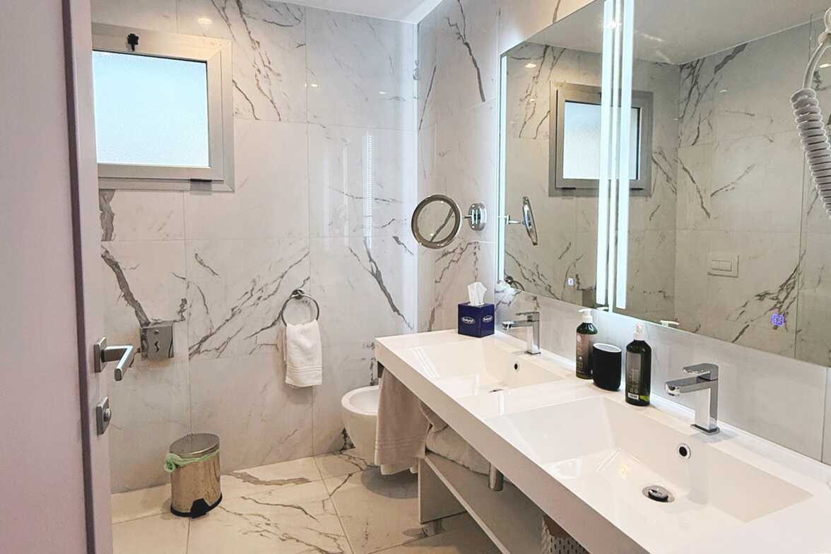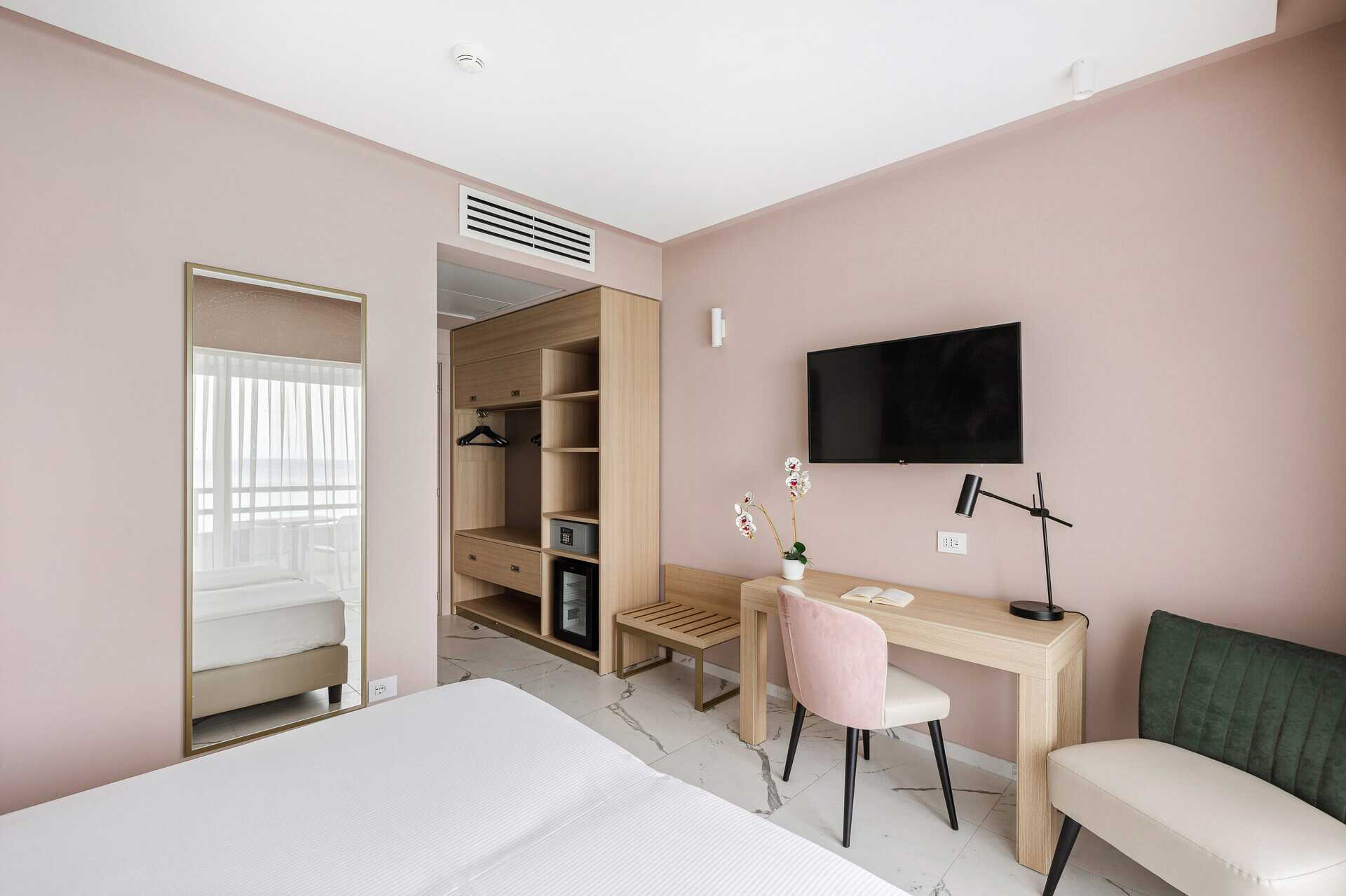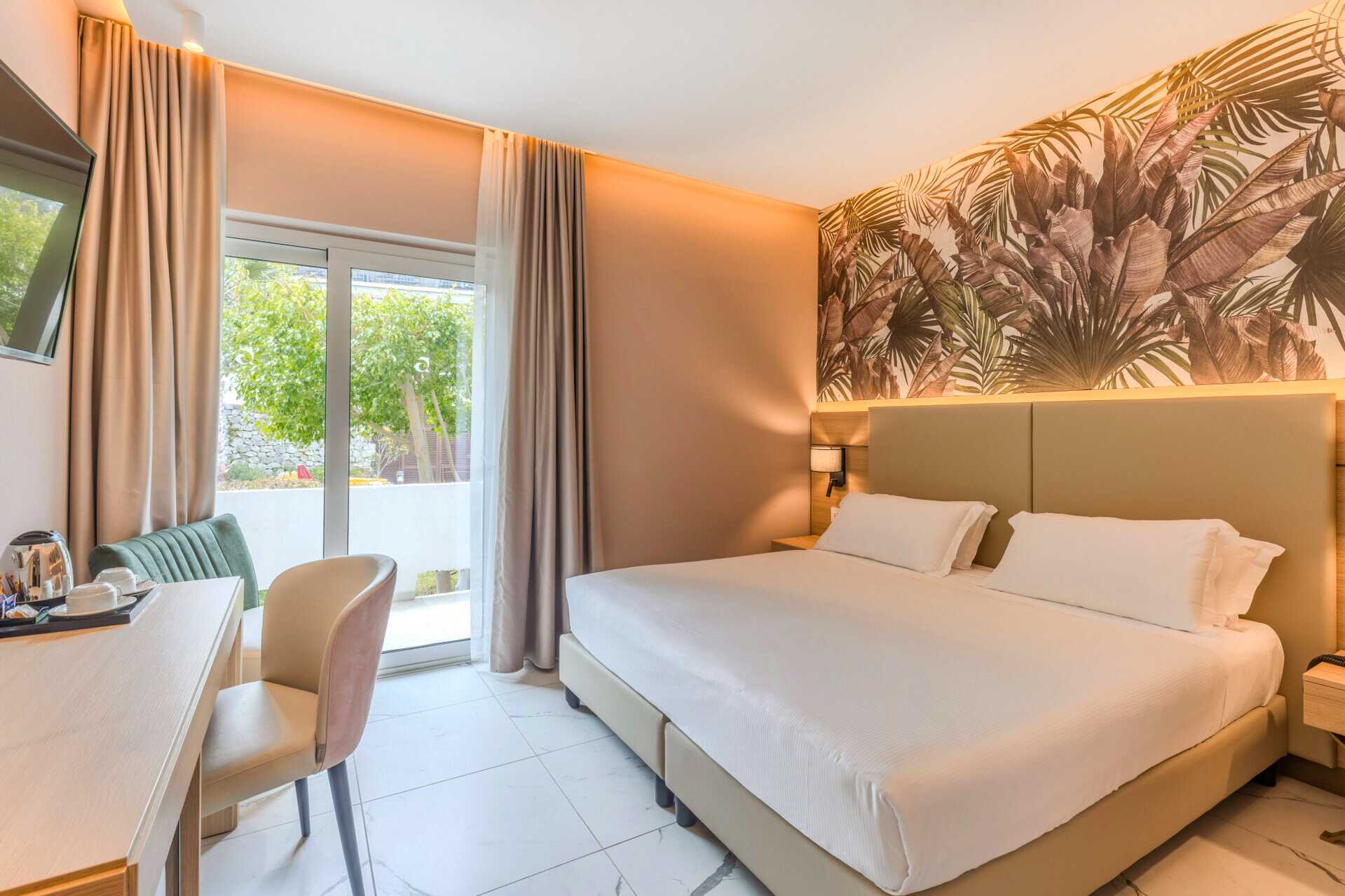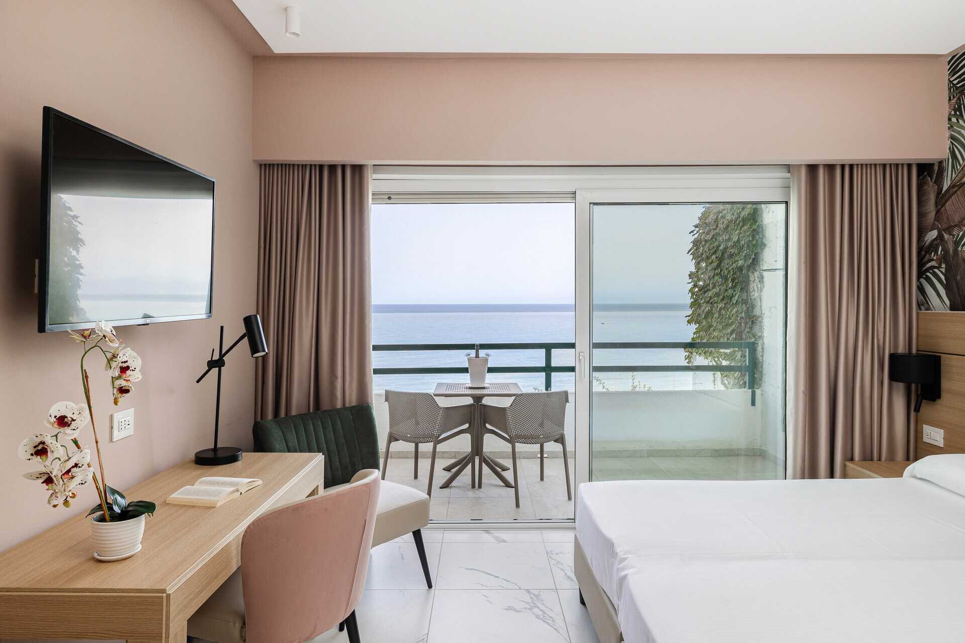 Dobbeltværelse med balkon eller terrasse. En dobbeltseng eller to enkeltsenge. Mulighed for ekstra opredning. Gratis wifi, aircondition og deponering. Lille køleskab. Tv med internationale kanaler. Hårtørrer. Badeværelse med bruser og toilet. Rengøring 3 gange om ugen.