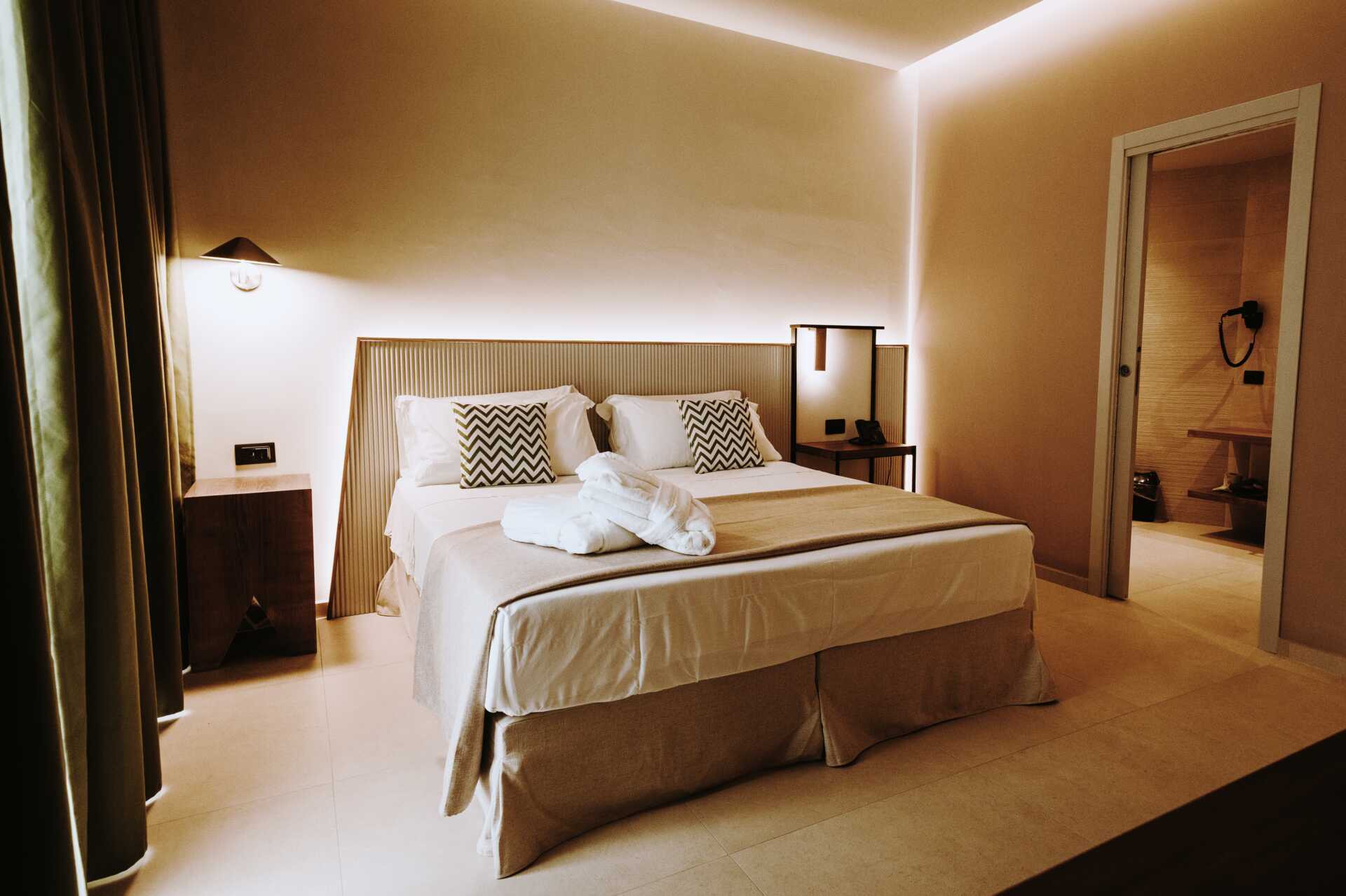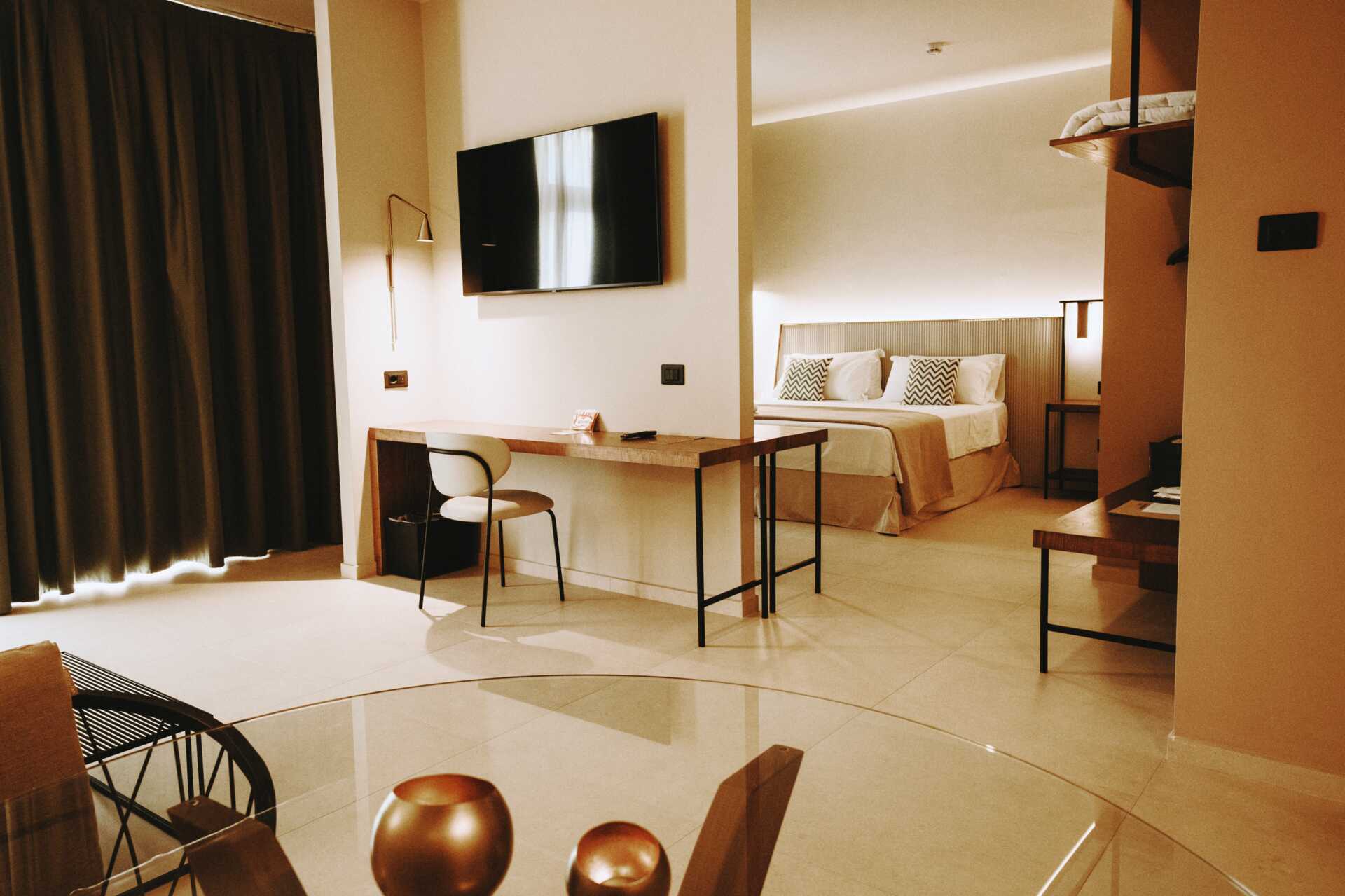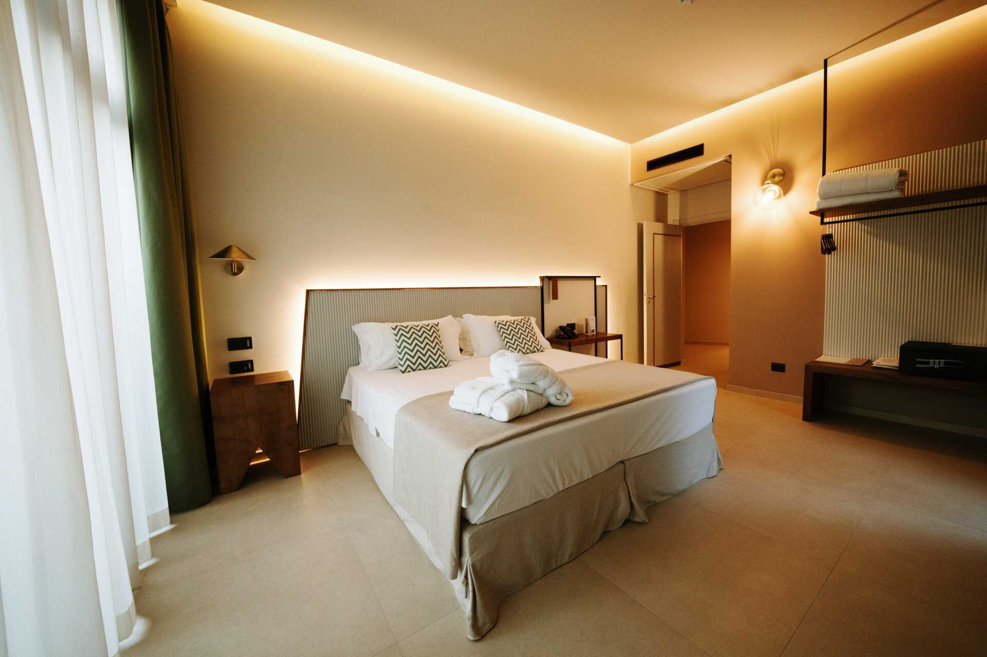 Junior-suiter med balkon. En dobbeltseng eller to enkeltsenge. Sovesofa. Gratis wifi, aircondition og deponering. Tv. Minibar. Hårtørrer. Badeværelse med bruser og toilet. Rengøring 7 gange om ugen.