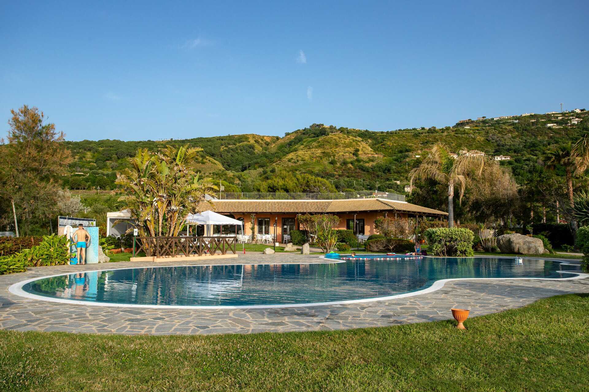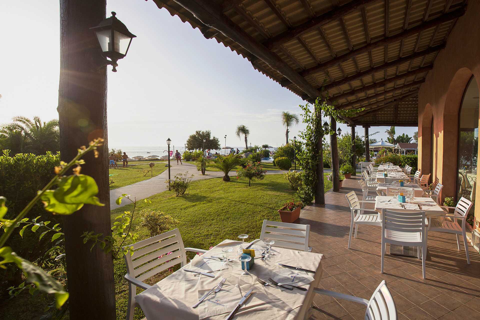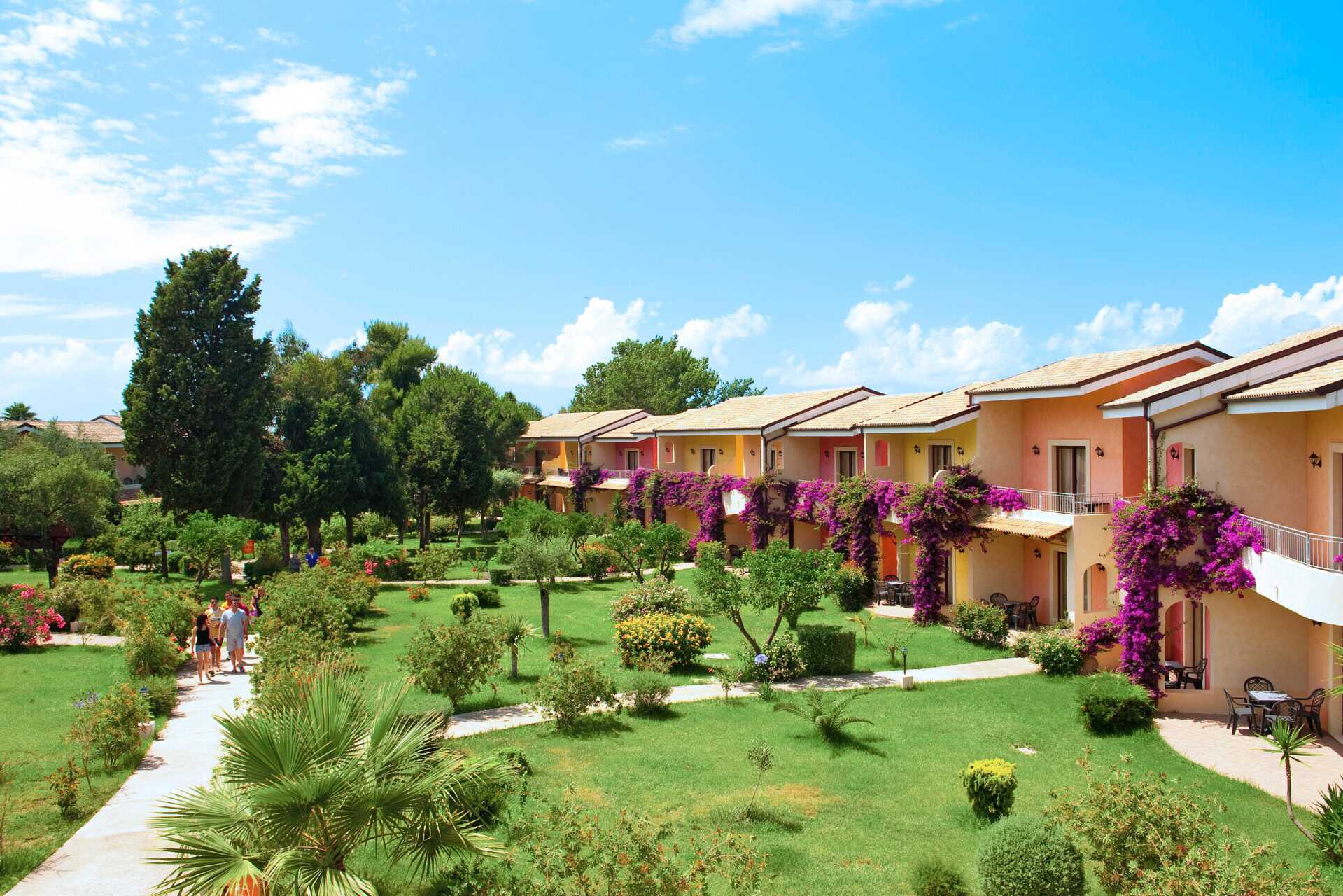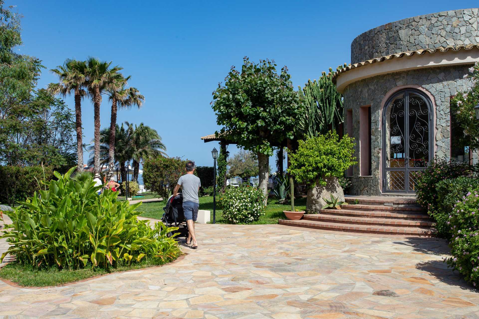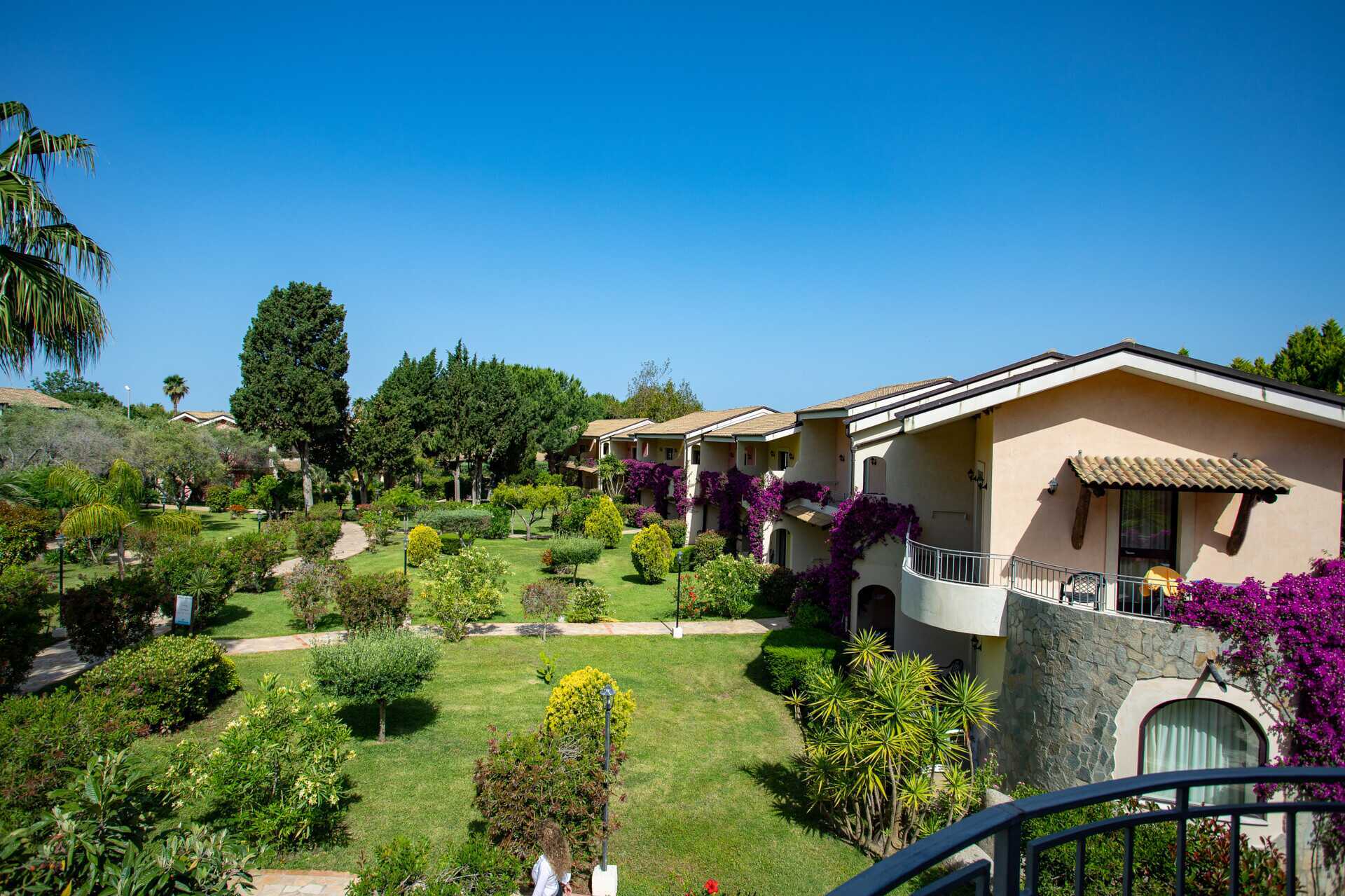Hotellet er bygget som en hyggelig italiensk borgo, et lille landsbylignende miljø med lave bygninger og en frodig have, hvor palmer, bougainvillea og middelhavsblomster skaber en afslappet og autentisk italiensk atmosfære.