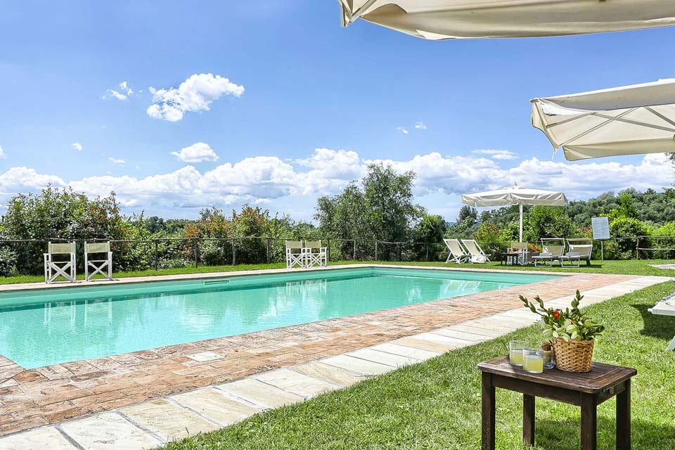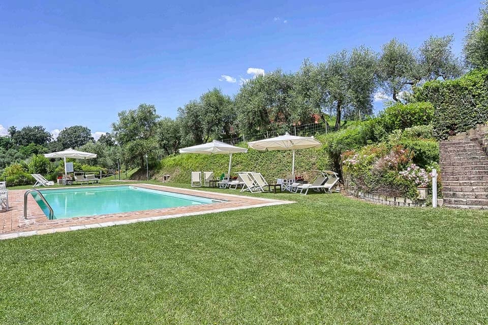 Udenfor strækker en stor have sig under den toscanske sol, ideel til afslappende eftermiddage. Villaen har en glitrende pool med håndklæder, ideel til afkøling efter at have udforsket den fantastiske italienske region. Aircondition sikrer komfort i sommermånederne, og en bil er nødvendig for at udforske de charmerende landsbyer og vinmarker i nærheden.
