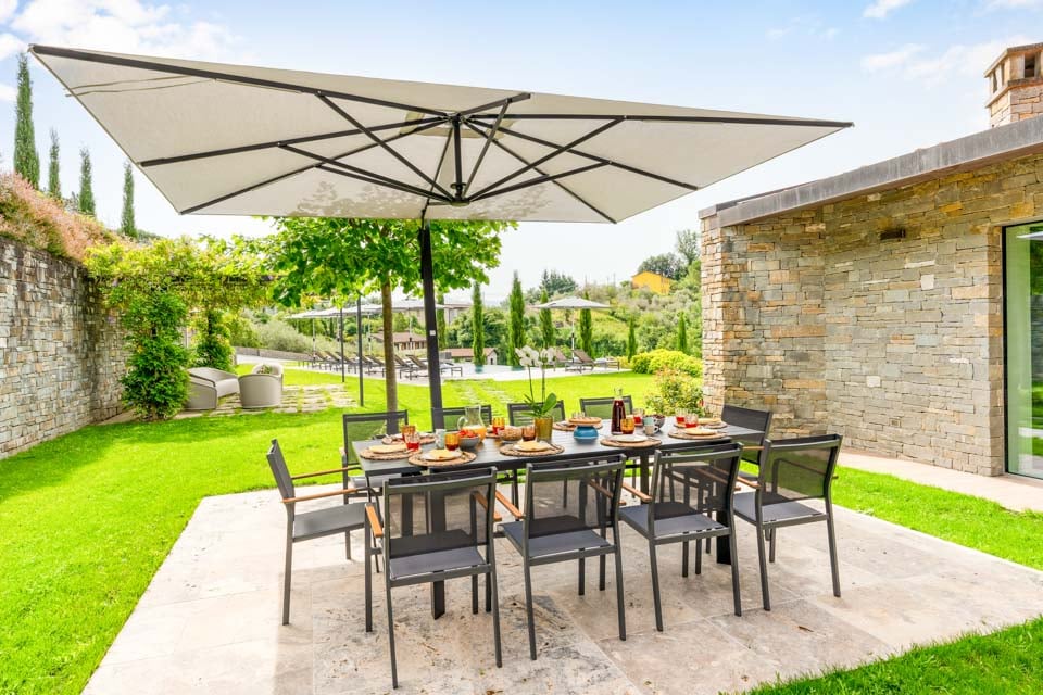 Udenfor glitrer en stor overløbspool i solen, omgivet af liggestole og en velholdt græsplæne og have. Der er poolhåndklæder, så du kan komme direkte i ferietilstand. Uanset om du nyder en malerisk morgenkaffe eller et aftenspil pool i spilleområdet, er hvert hjørne af villaen designet til komfort og forbindelse.