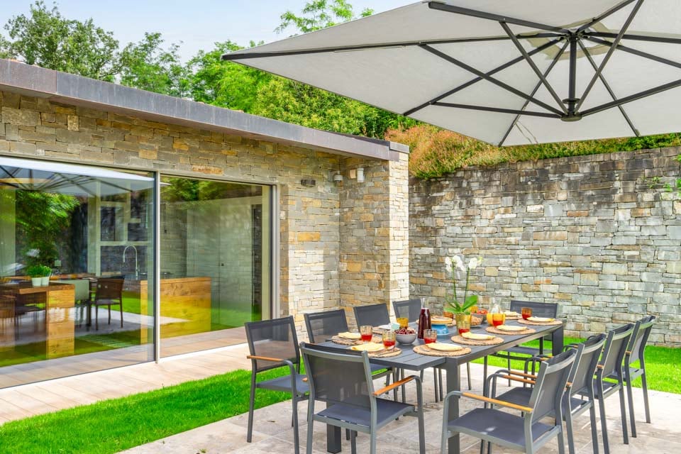 Overdækket terrasse, Åben terrasse, Udendørs servering, Udendørs spisefaciliteter, Spisefaciliteter, Grill, Gasgrill, Havemøbler, Liggestole, Parasol, Græsplæne