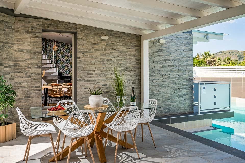 Villaens hjerte er dens åbne stue og køkken – et lyst og hyggeligt rum designet til nem ophold. Selvom der ikke er nogen ovn, finder du et stort kogeplade, en mikrobølgeovn og et køleskab med fryser, der er klar til dine kulinariske kreationer. Aircondition holder interiøret køligt, mens wellness-rummet inviterer dig til at slappe af med spabad, sauna og et ekstra brusebad.