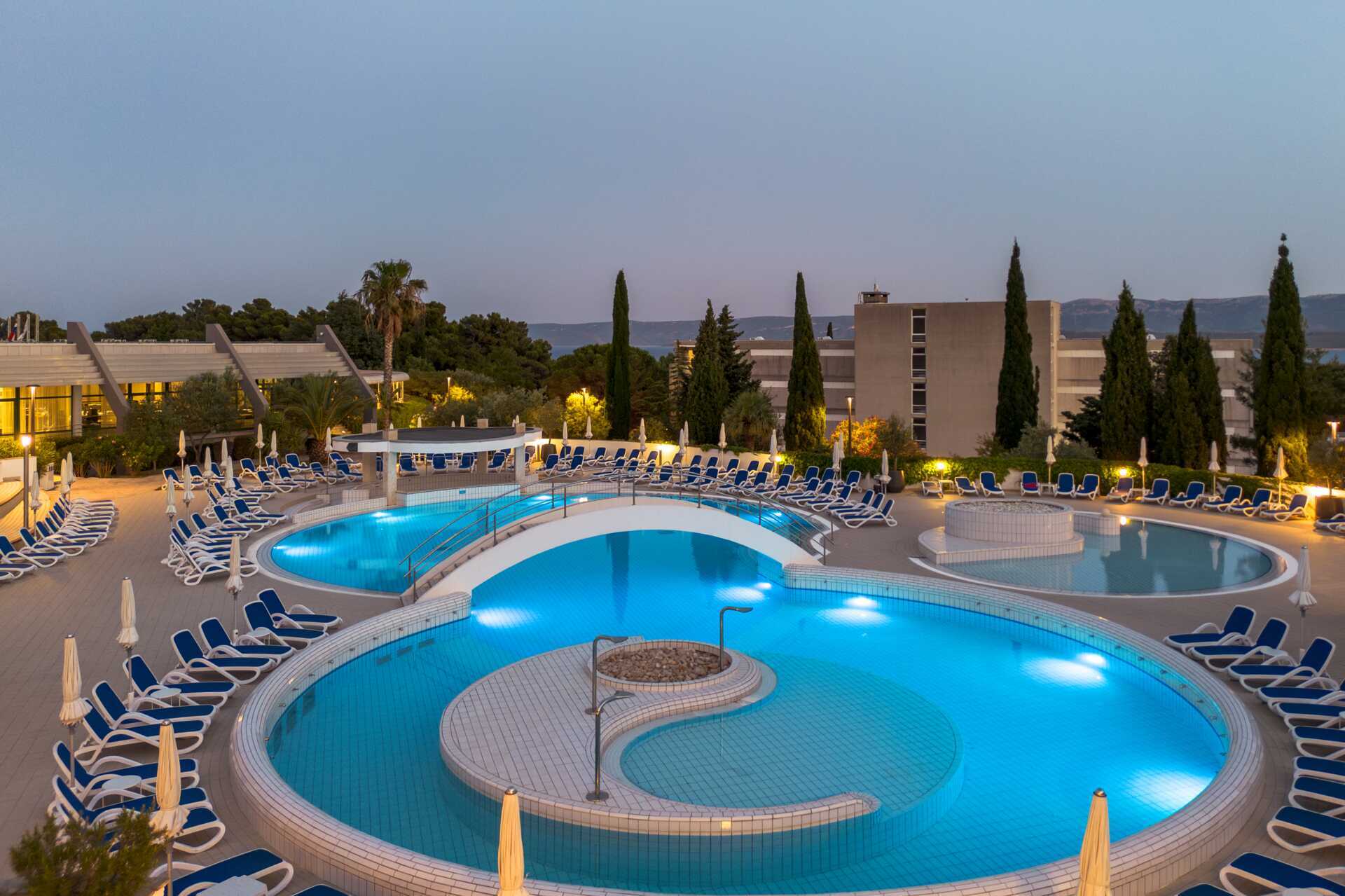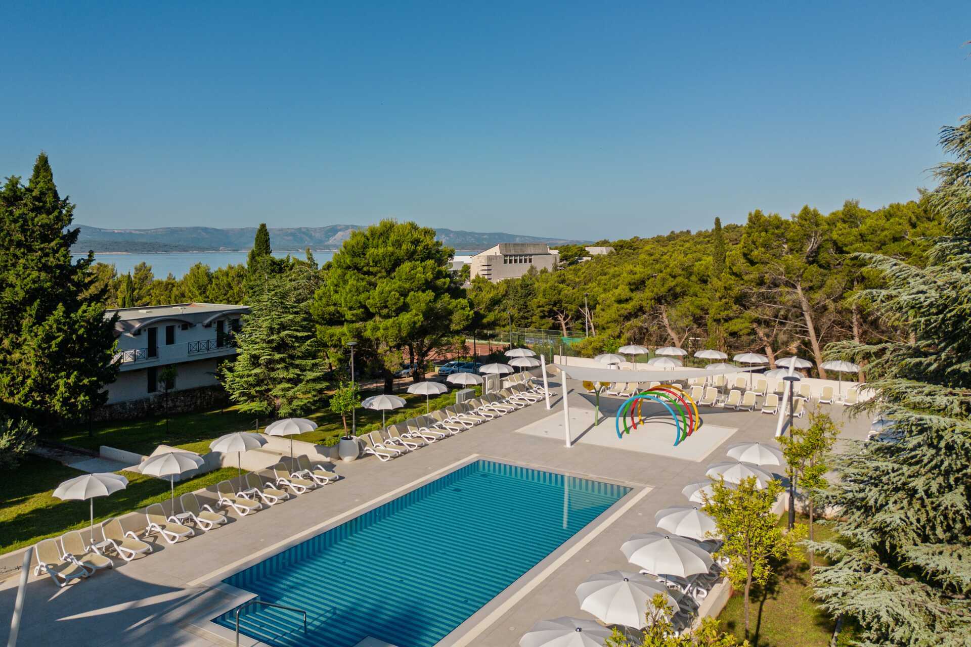 Stort poolområde med tre pools. Separat børnepool. Solstole og parasoller er inkluderet ved pools. Pool- og strandhåndklæder. Poolbar, der serverer snacks og drikkevarer i løbet af dagen. Der er kun en kort gåtur til sten- og grusstranden, og både Zlatni Rat og Bol ligger ca. 10 minutters gang derfra. Strandpromenaden mod Bol er skyggefuld takket være fyrretræerne og er perfekt til en behagelig gåtur.