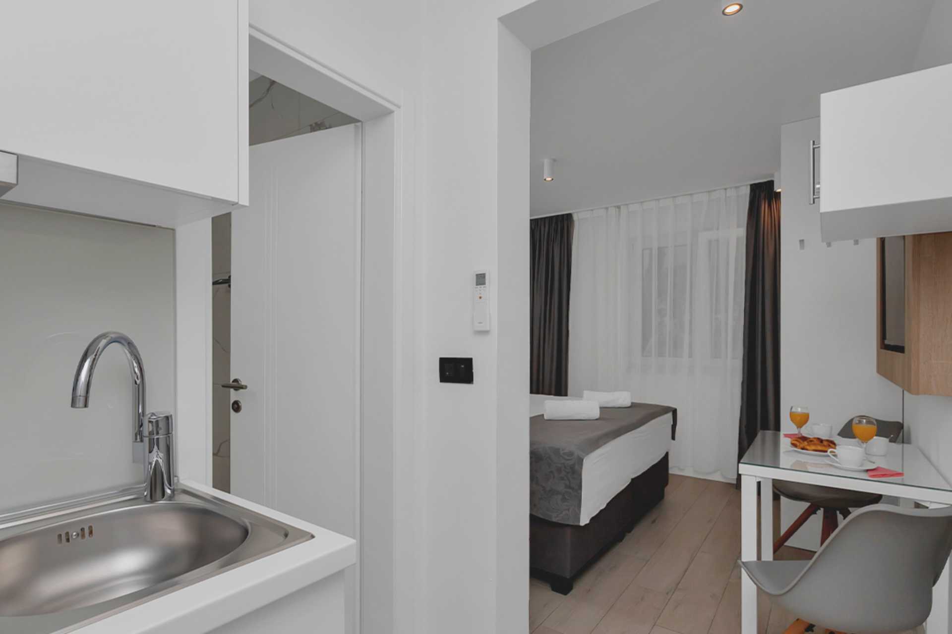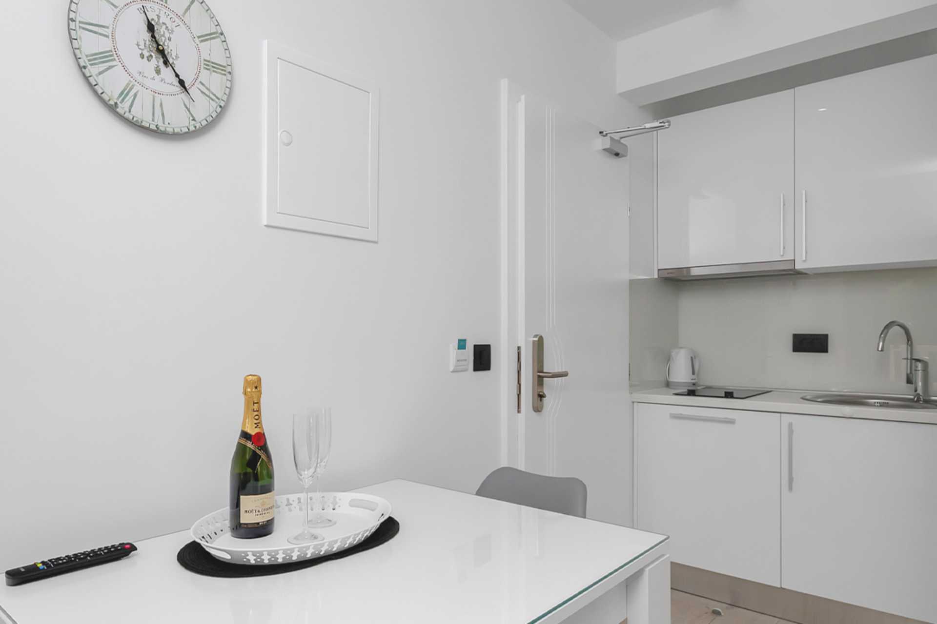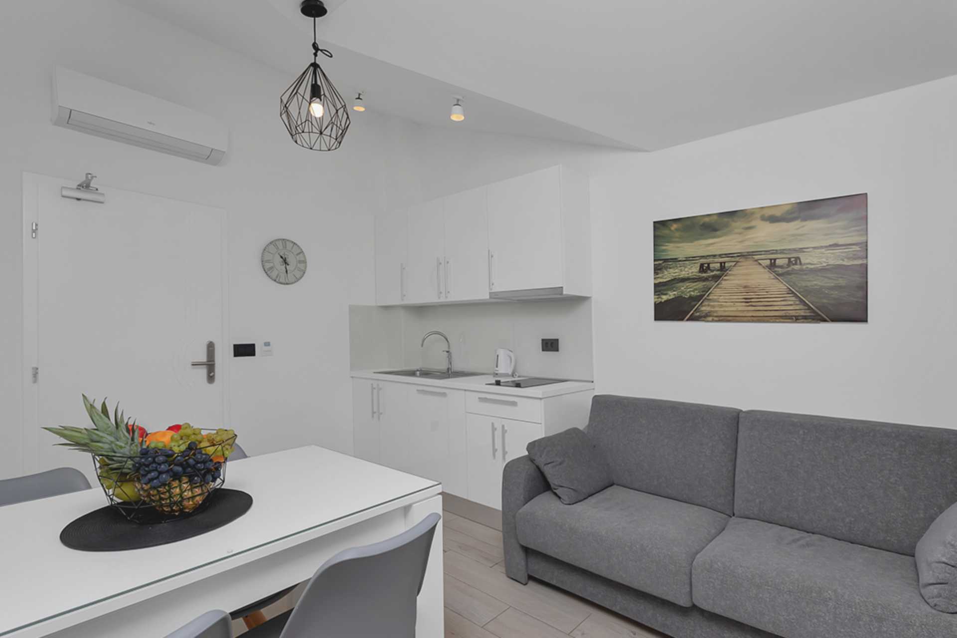 1-værelses lejlighed uden udeplads. Kombineret soveværelse og minikøkken. En dobbeltseng eller to enkeltsenge. Minikøkken med kogeplader, køleskab, mikroovn og enkelt køkkenudstyr. Kaffemaskine - fire kapsler medfølger. Gratis wifi, aircondition og deponering. Tv med internationale kanaler. Hårtørrer. Badeværelse med bruser og toilet. Rengøring 3 gange om ugen.