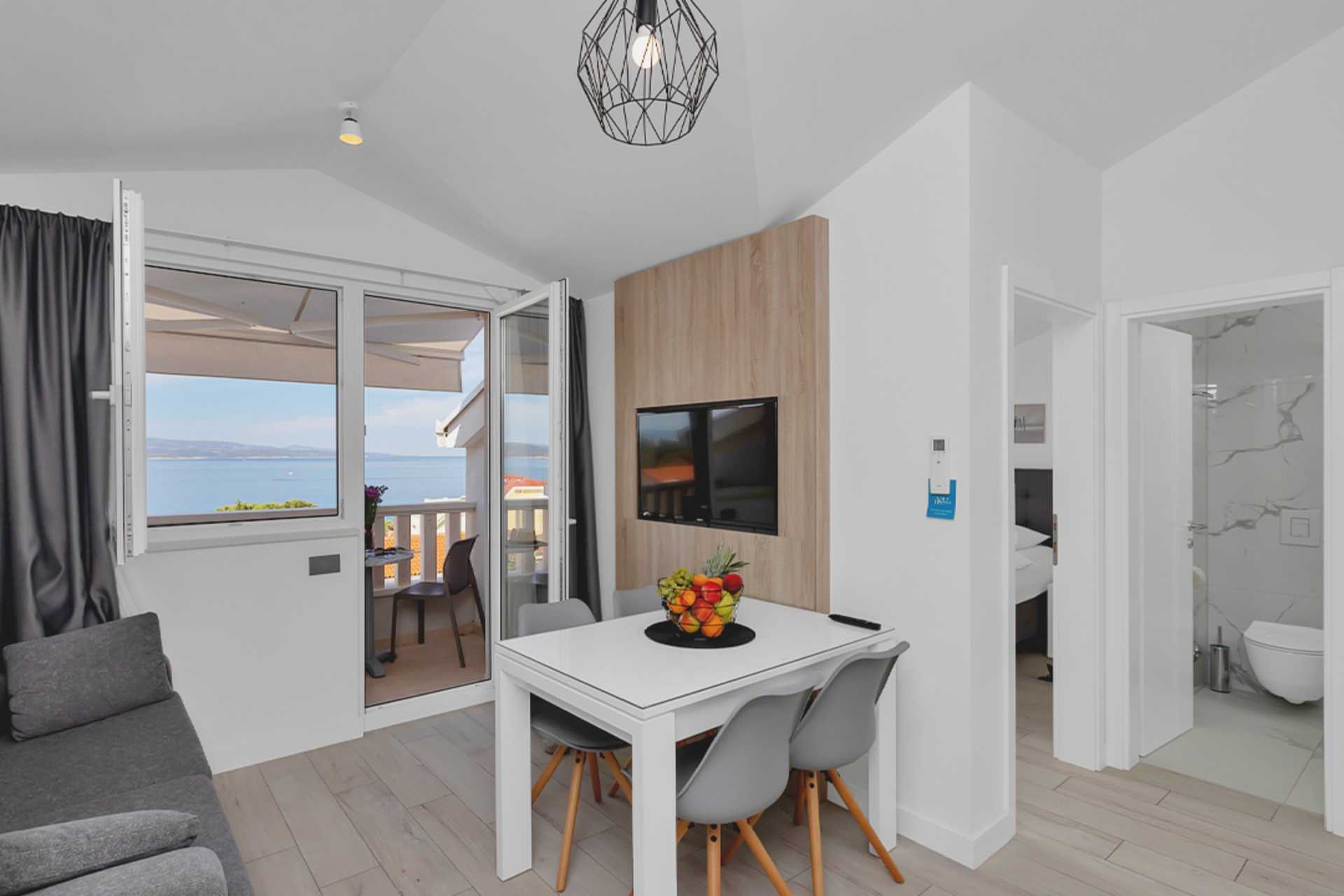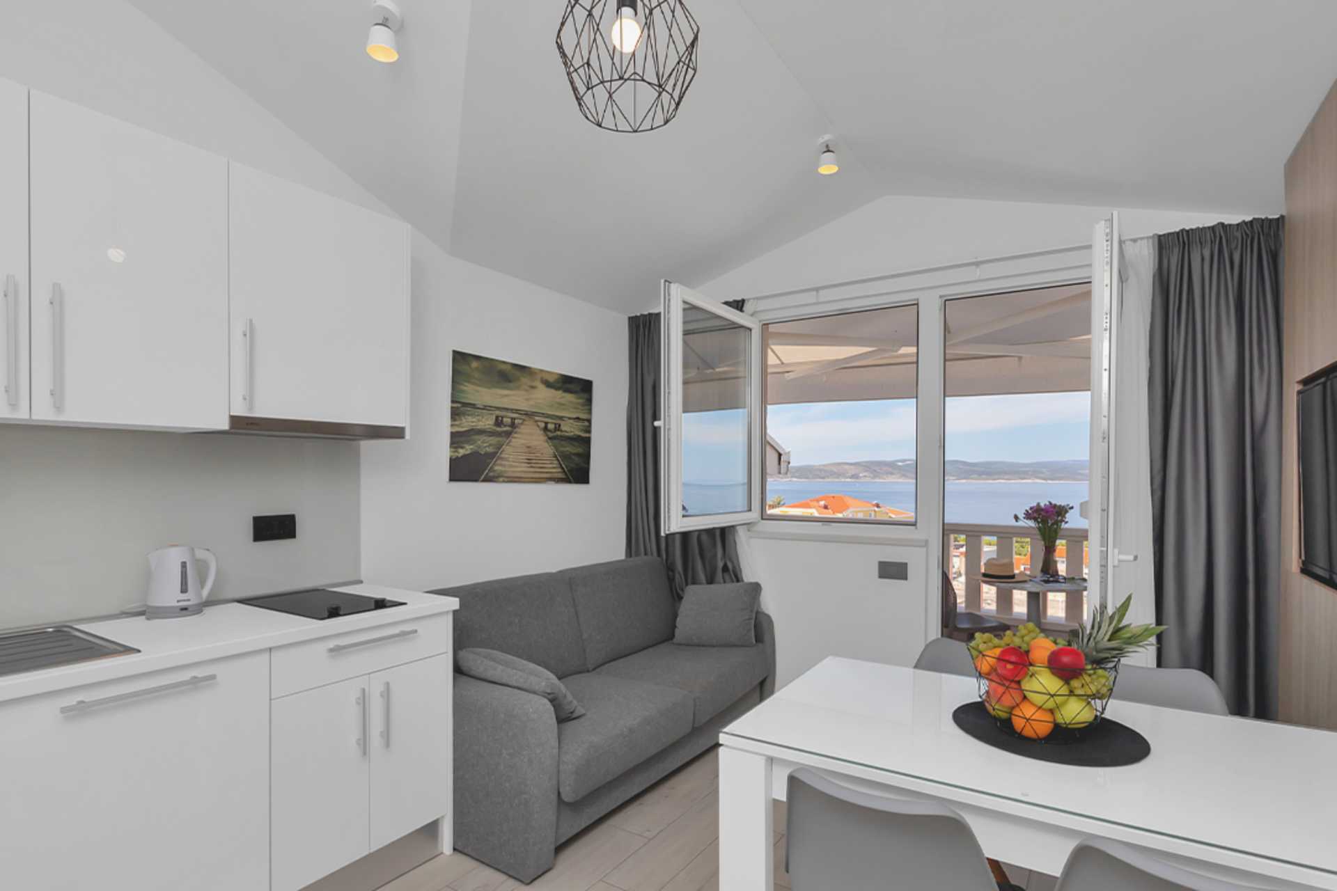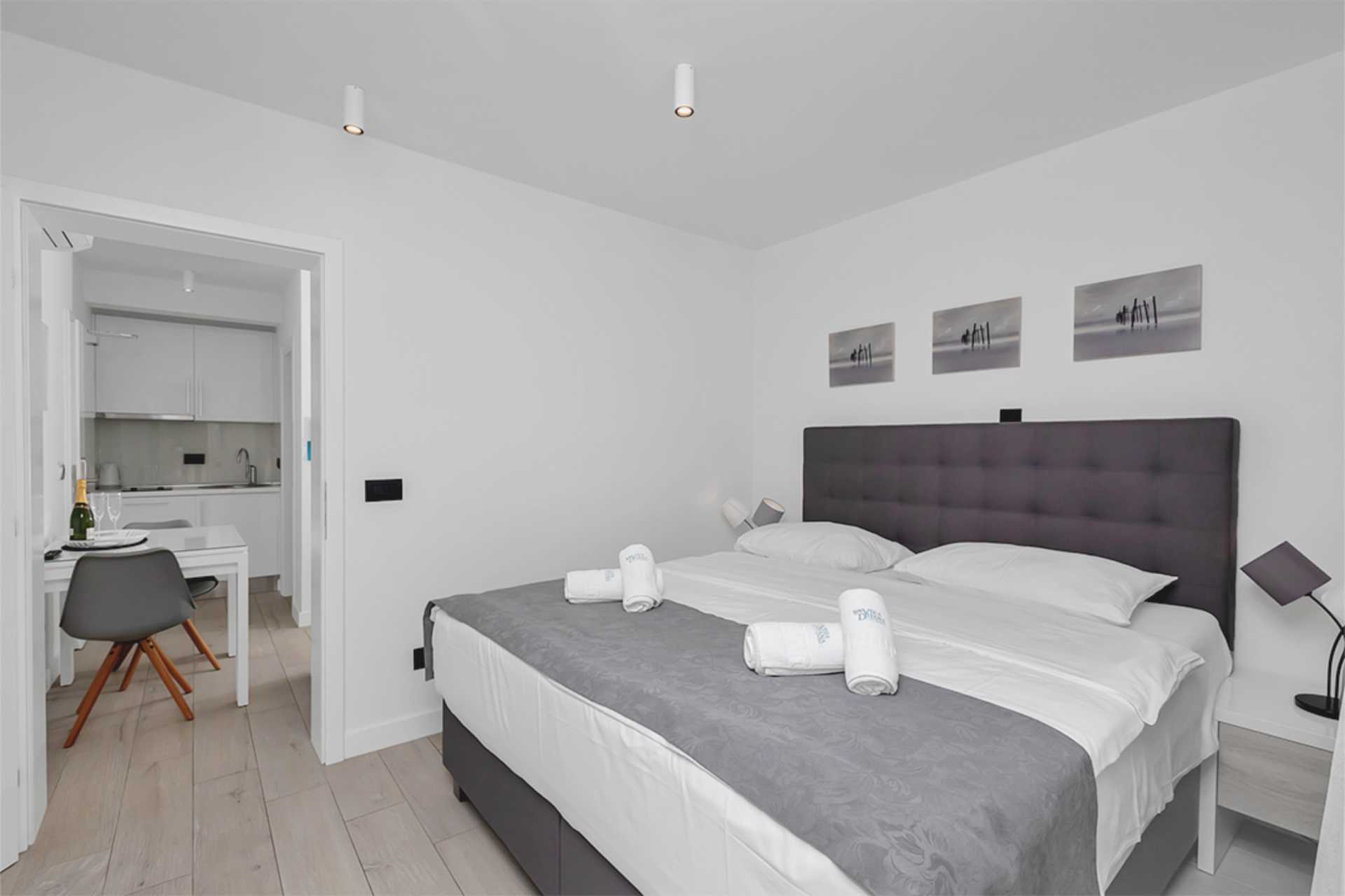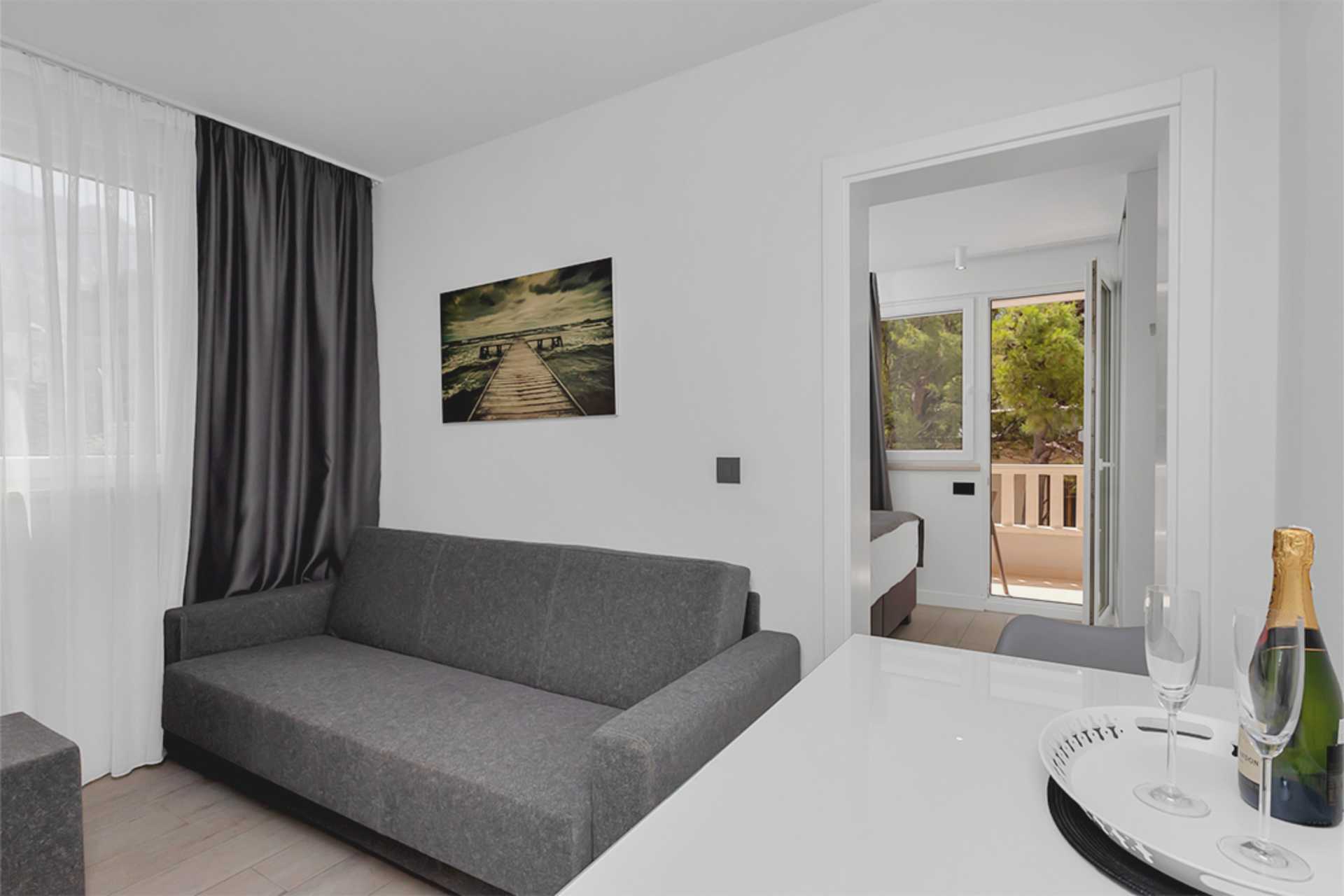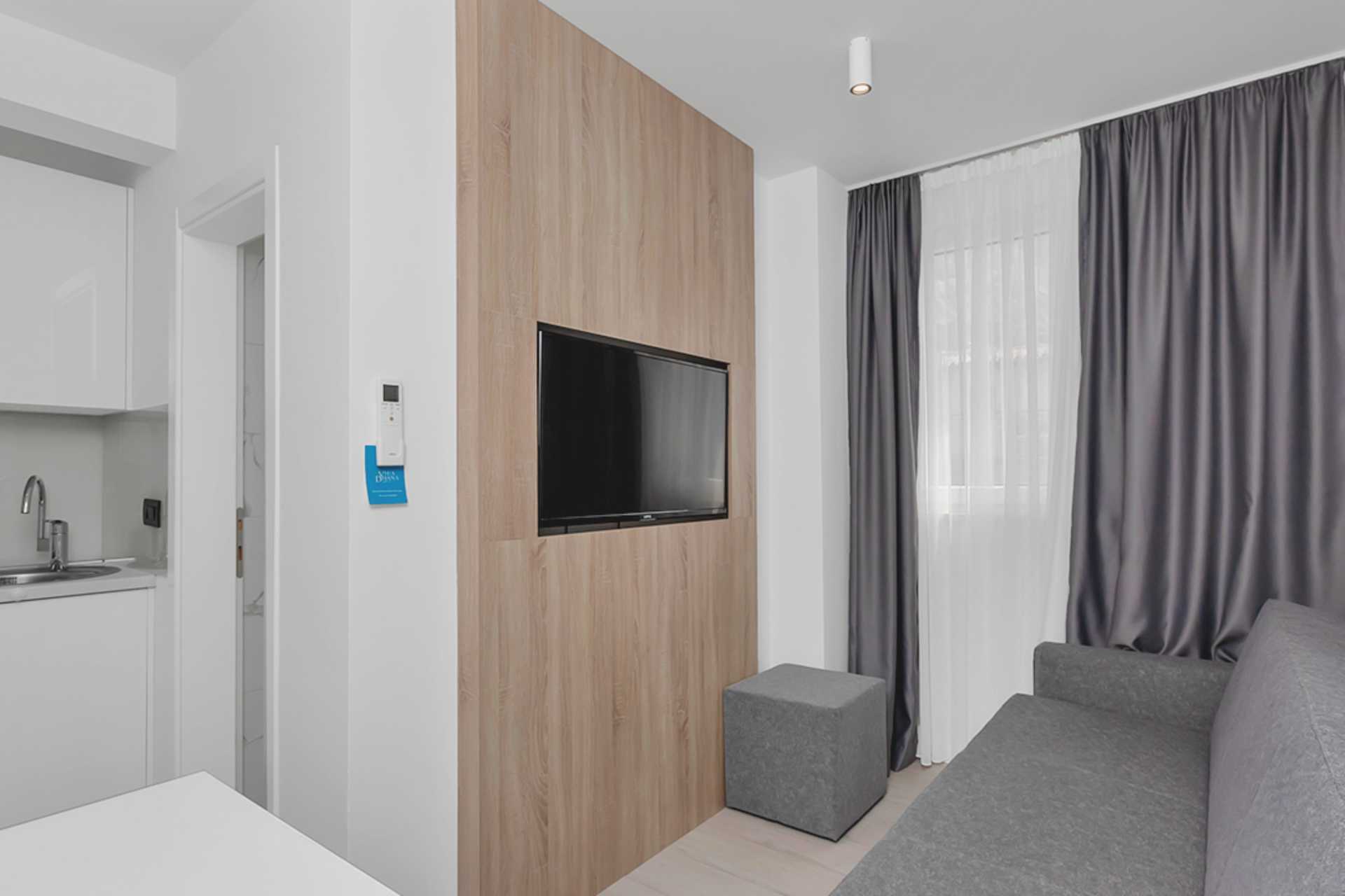 2-værelses lejlighed med balkon eller balkon i stueplan. Nogle balkoner har havudsigt eller delvis havudsigt. Lejlighederne placeret i toppen af bygningen med balkon har en lidt lavere loftshøjde. Et soveværelse og et kombineret opholdsrum med minikøkken. En dobbeltseng eller to enkeltsenge. Mulighed for ekstra opredninger i sovesofa. Minikøkken med kogeplader, køleskab, mikroovn, opvaskemaskine og enkelt køkkenudstyr. Kaffemaskine - 4 kapsler medfølger. Gratis wifi, aircondition og deponering. Tv med internationale kanaler. Hårtørrer. Badeværelse med bruser og toilet. Rengøring 3 gange om ugen.