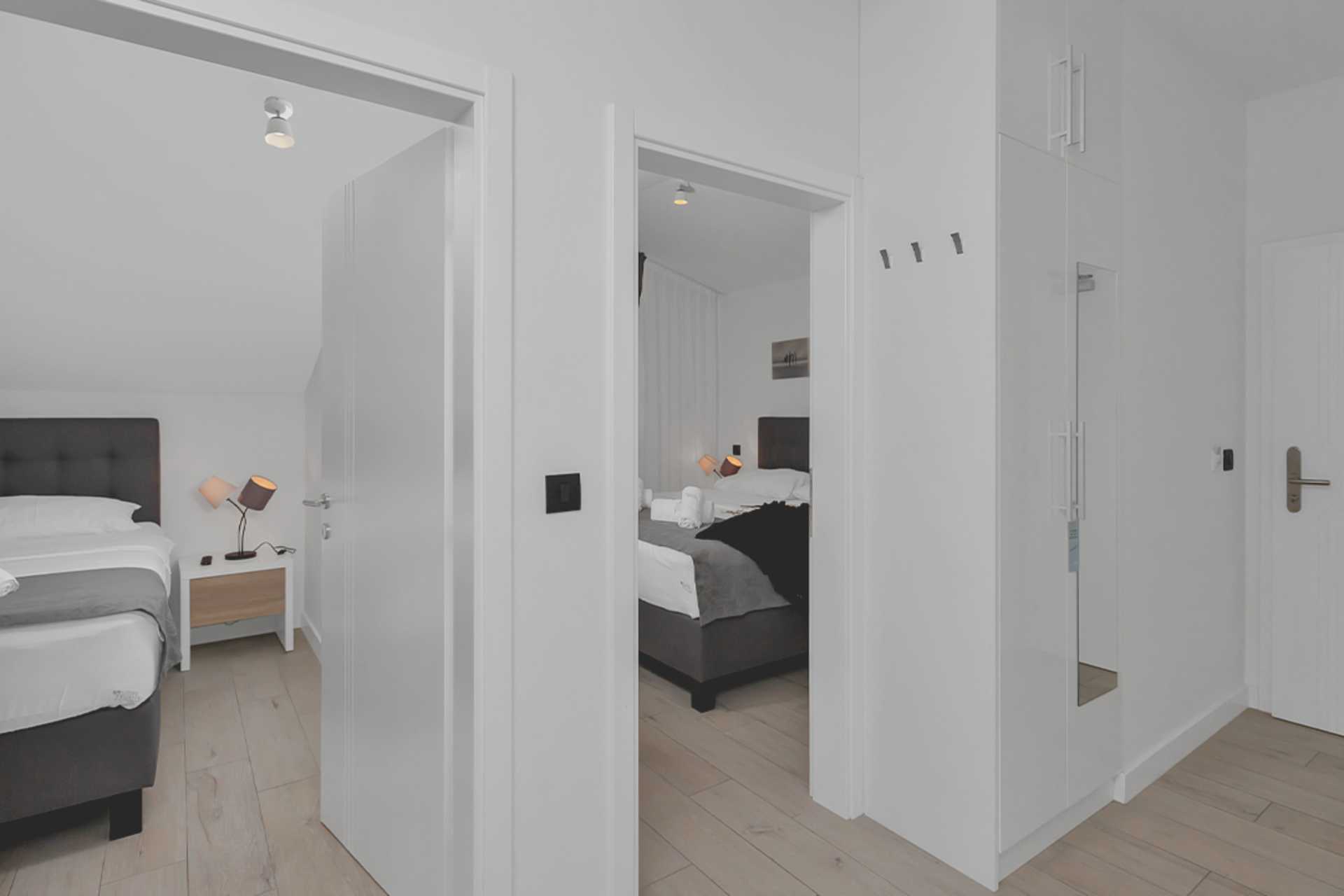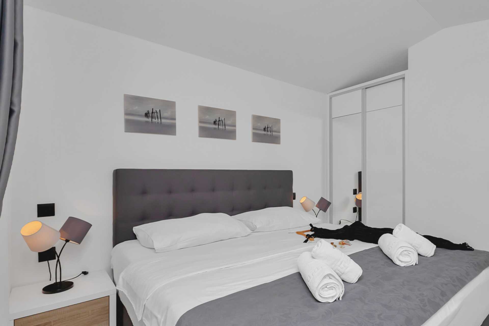 3-værelses lejlighed med balkon eller balkon i stueplan, nogle balkoner har havudsigt eller delvis havudsigt. Lejligheder beliggende i toppen af bygningen har lidt lavere loftshøjde. To soveværelser og kombineret opholdsrum med minikøkken. En dobbeltseng eller to enkeltsenge. Mulighed for ekstra opredninger i sovesofa. Minikøkken med kogeplader, køleskab, opvaskemaskine, mikrobølgeovn og enkelt køkkenudstyr. Kaffemaskine - 4 kapsler medfølger. Gratis wifi, aircondition og deponering. Tv med internationale kanaler. Hårtørrer. Badeværelse med bruser og toilet. Rengøring 3 gange om ugen.