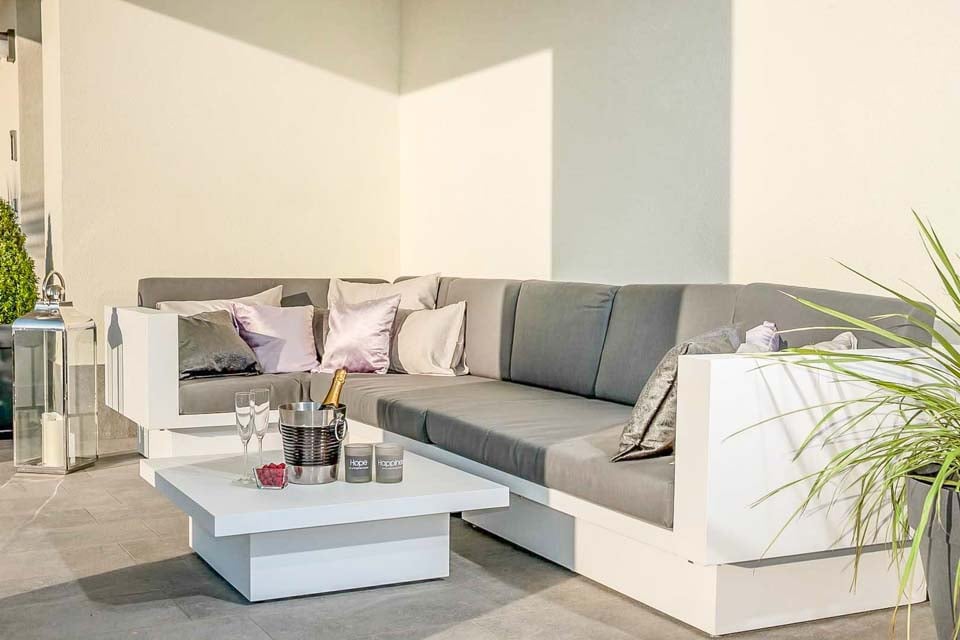 Overdækket terrasse, Komfortabelt siddeområde, Udendørs spiseplads, Murstensgrill, Åben terrasse, Liggestole, Havemøbler, Spabad