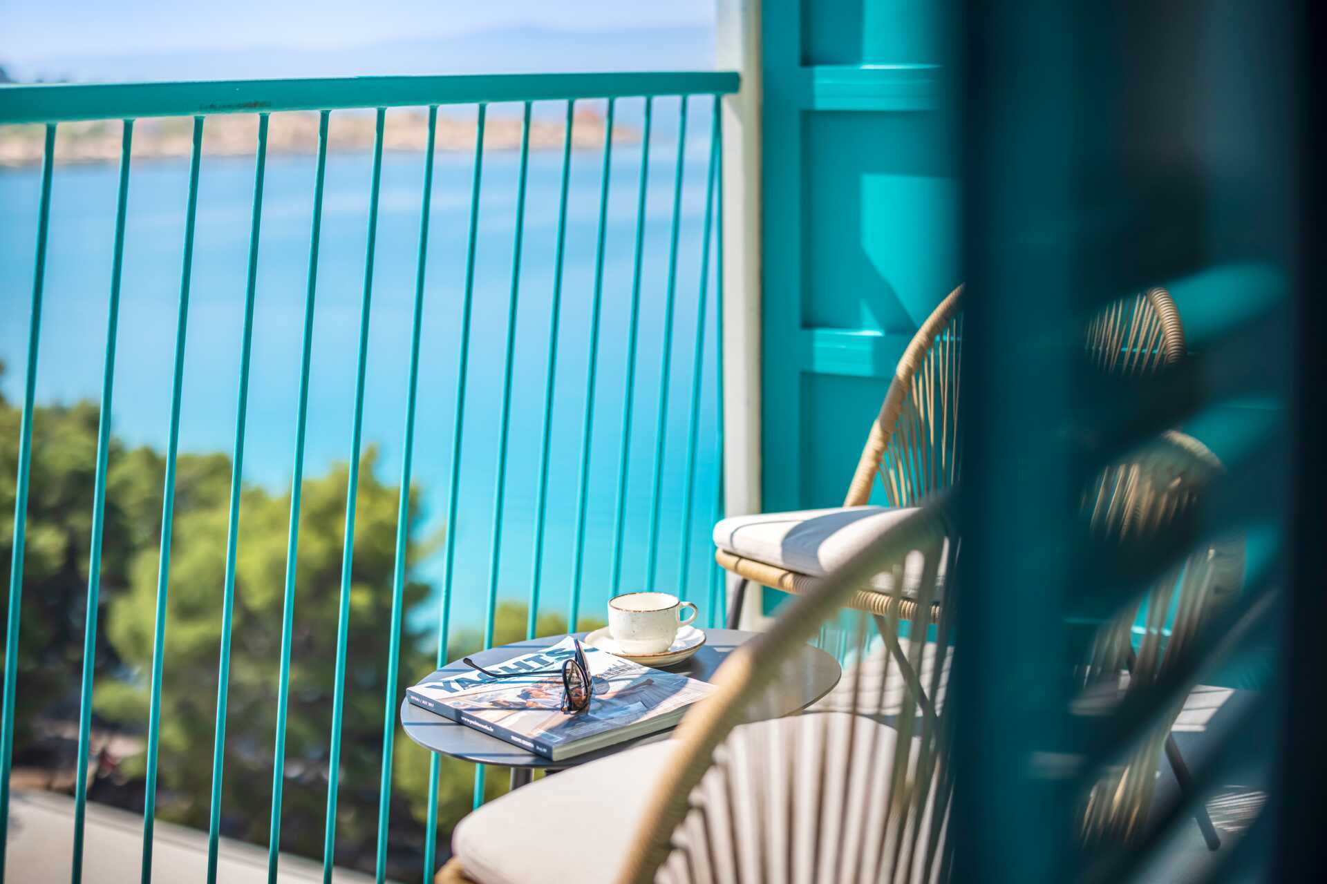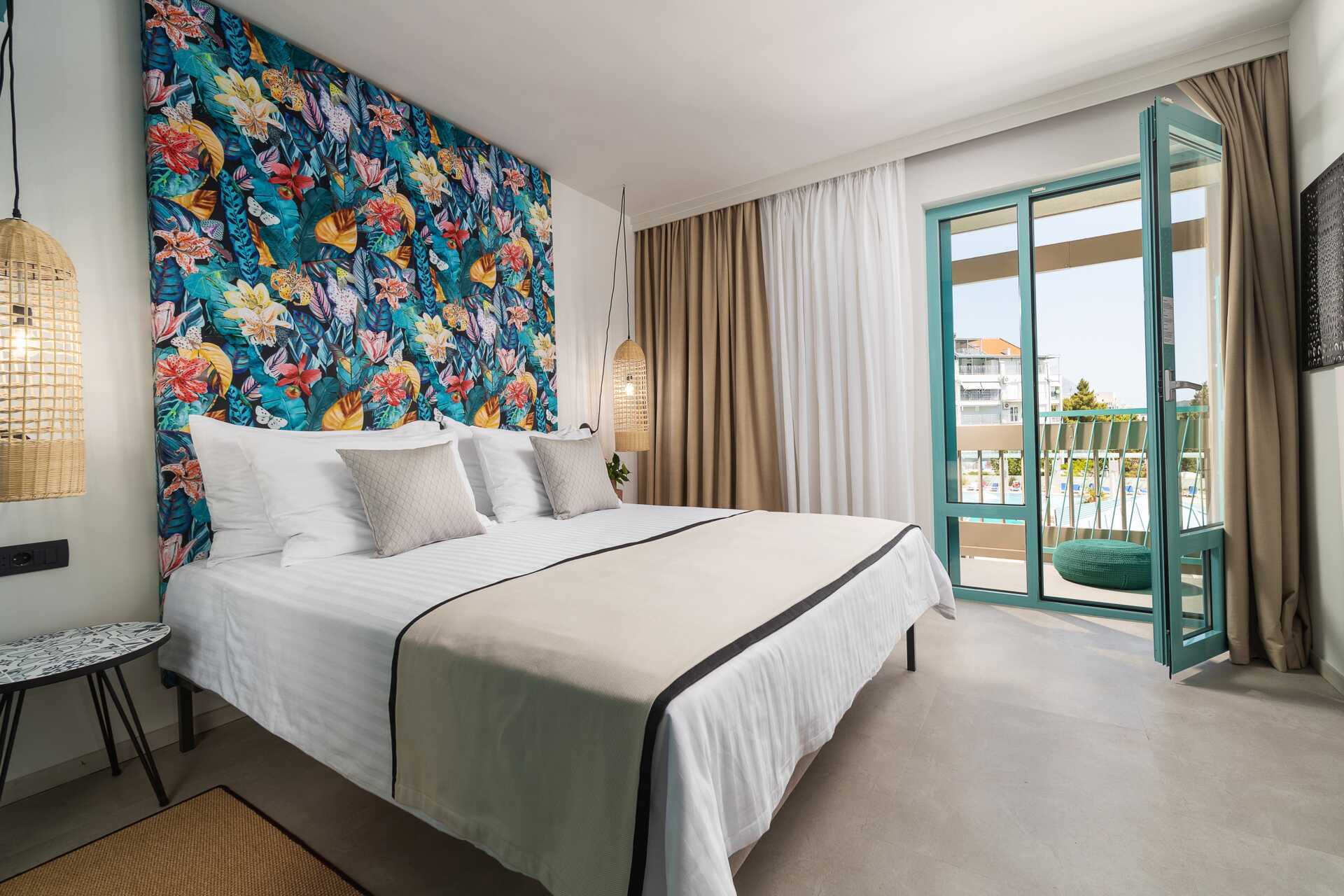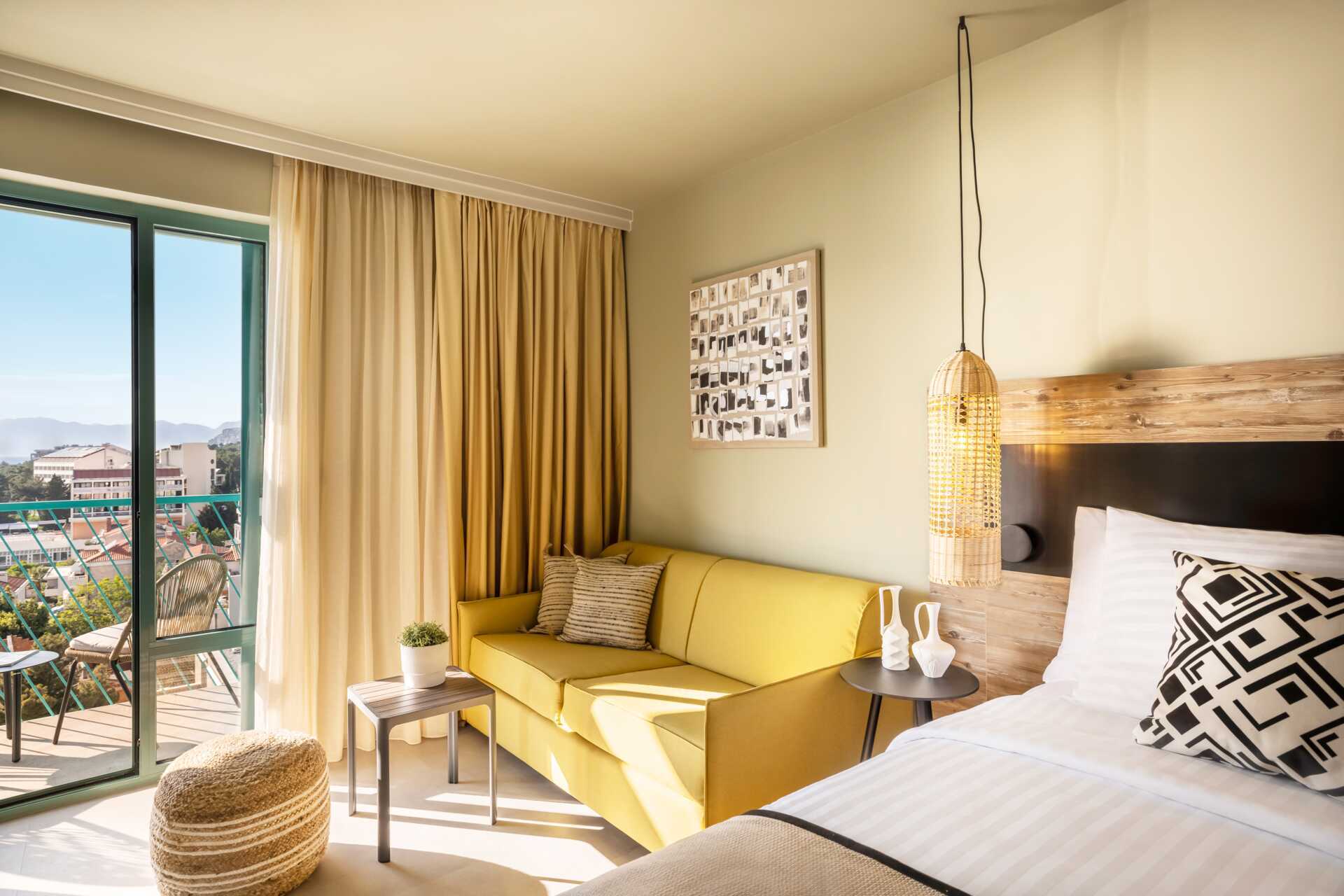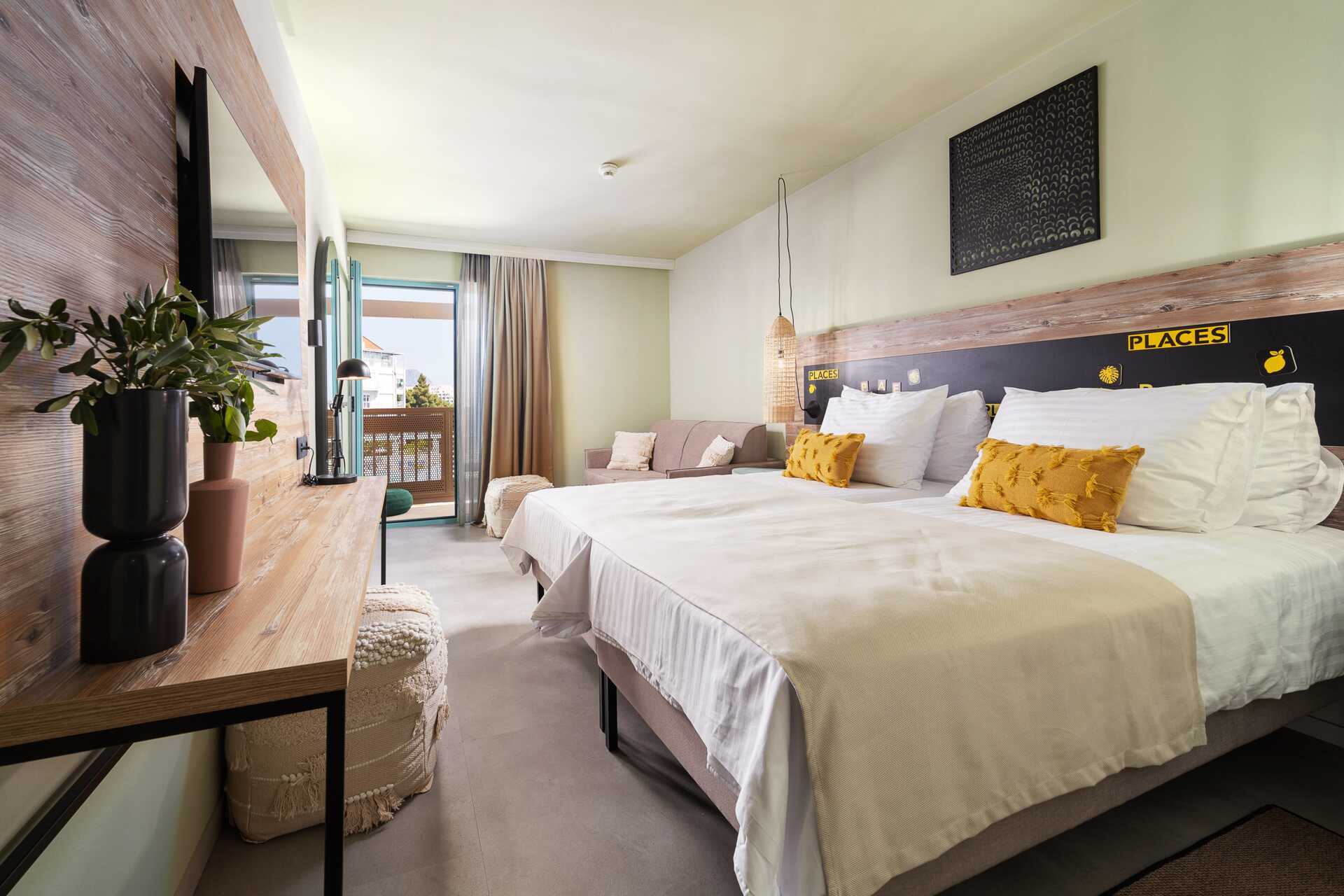 Større dobbeltværelse med balkon og delvis havudsigt. En dobbeltseng eller to enkeltsenge. Mulighed for ekstra opredning i enkeltseng eller i sovesofa. Gratis wifi, aircondition og deponering. Tv med internationale kanaler. Køleskab. Hårtørrer. Badeværelse med bruser og toilet. Rengøring 7 gange om ugen.