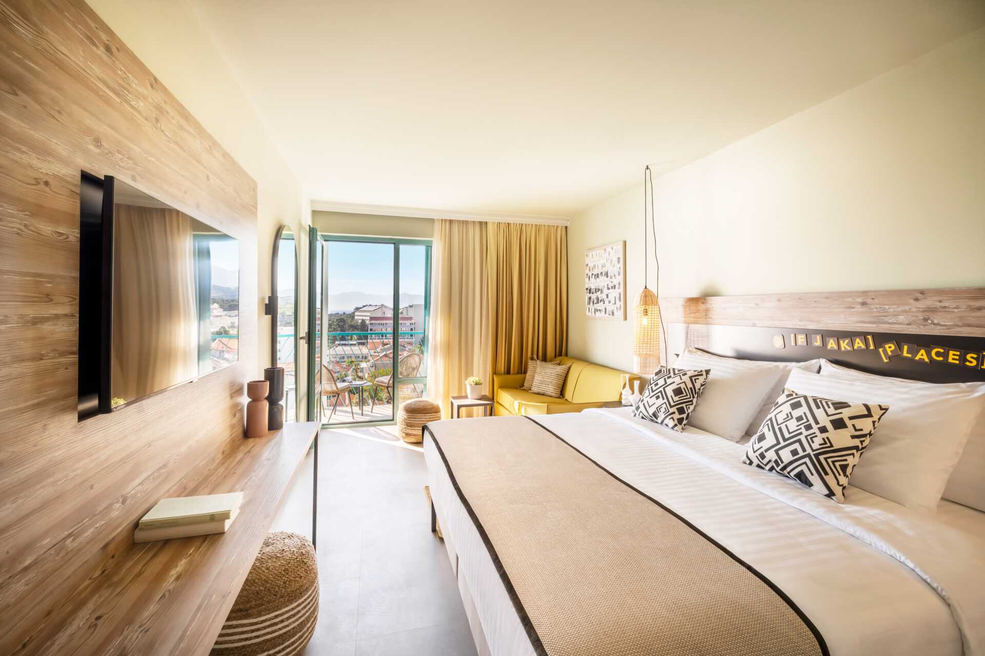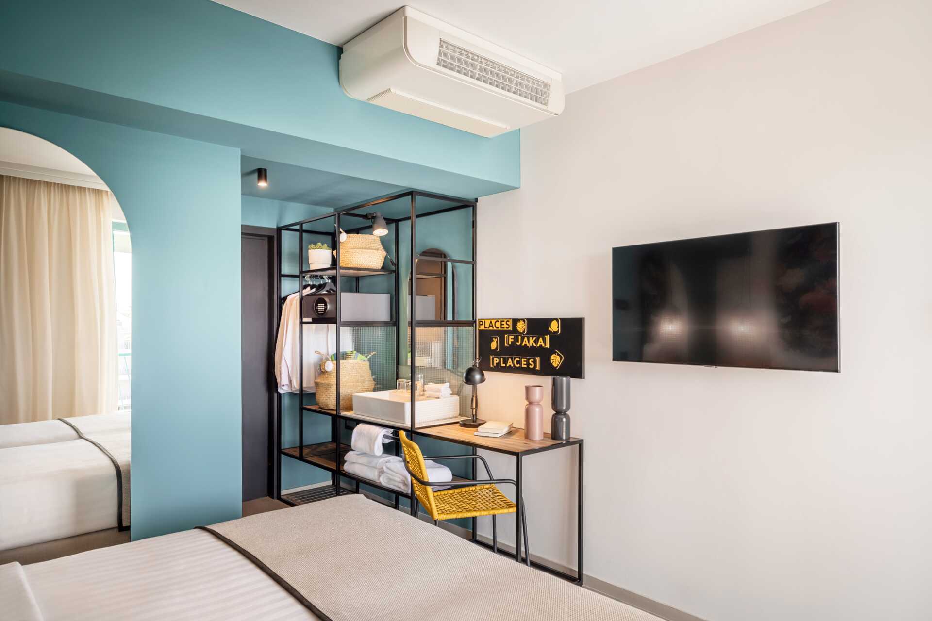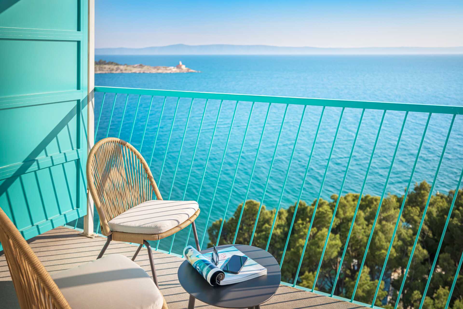 Større dobbeltværelse med balkon og delvis havudsigt. En dobbeltseng eller to enkeltsenge. Mulighed for ekstra opredning i enkeltseng eller i sovesofa. Gratis wifi, aircondition og deponering. Tv med internationale kanaler. Køleskab. Hårtørrer. Badeværelse med bruser og toilet. Rengøring 7 gange om ugen.