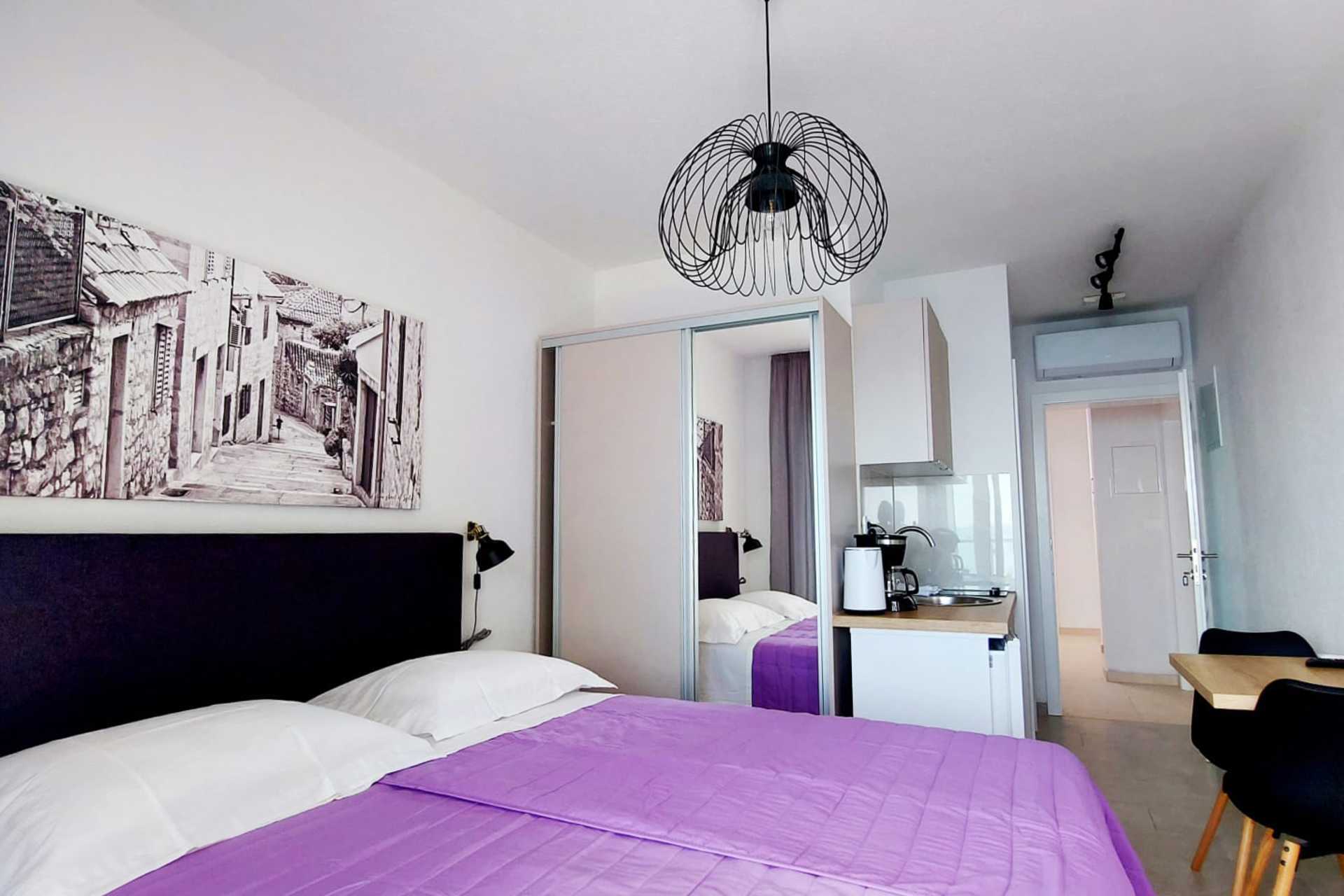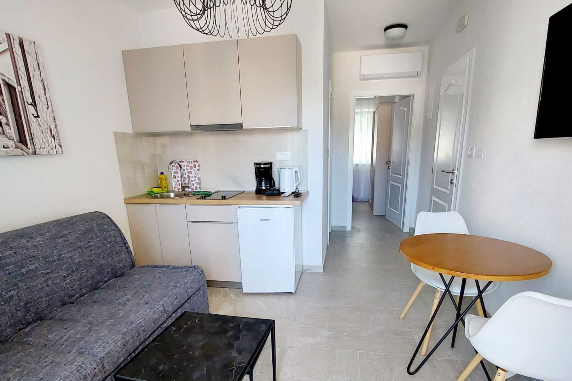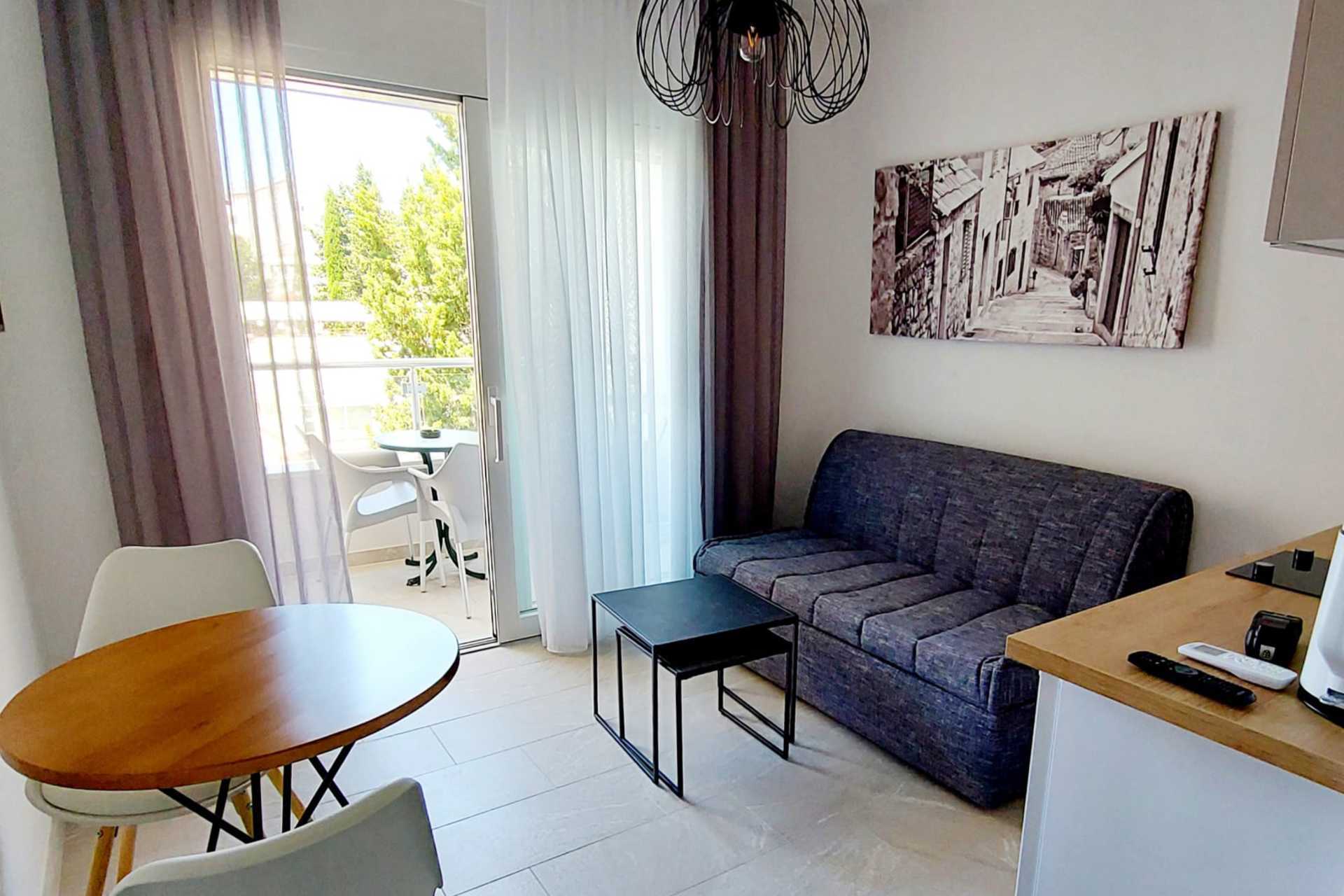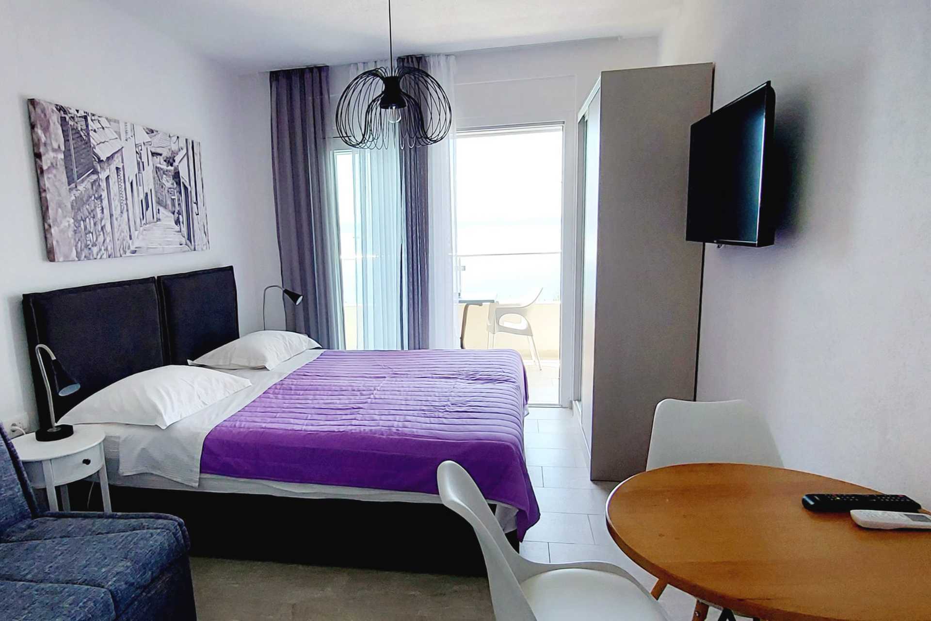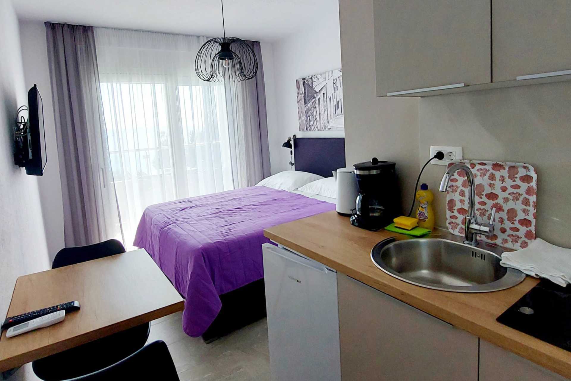 1-værelses lejligheder med balkon ud mod havet - udsigten er delvist skjult af træer. Kombineret soveværelse og minikøkken. En dobbeltseng eller to enkeltsenge. Mulighed for ekstra opredning i sovesofa. Minikøkken med kogeplader, køleskab, kaffemaskine og enkelt køkkenudstyr. Gratis wifi, aircondition og deponering. Tv med internationale kanaler. Hårtørrer. Badeværelse med bruser og toilet. Rengøring 7 gange om ugen.