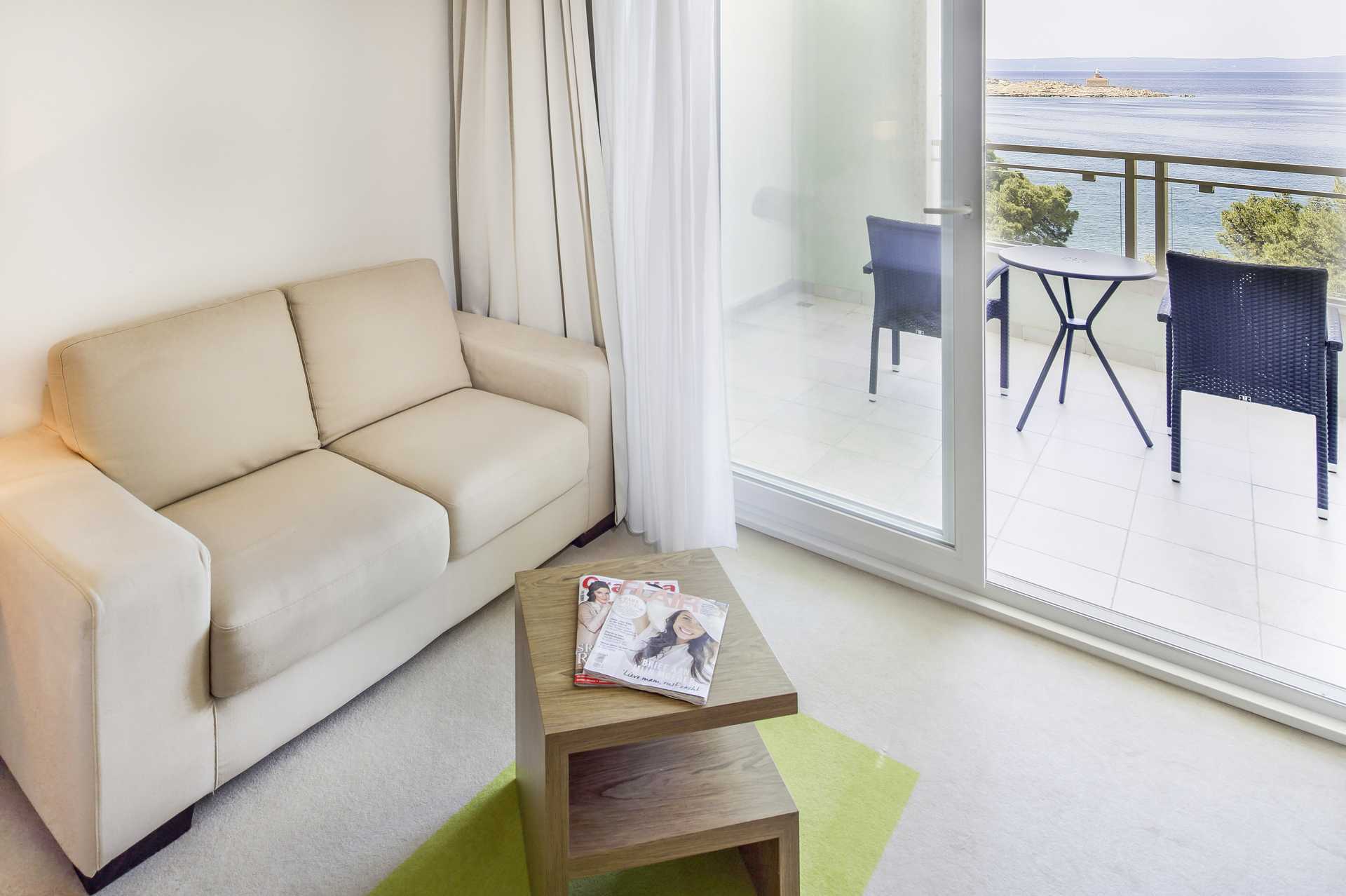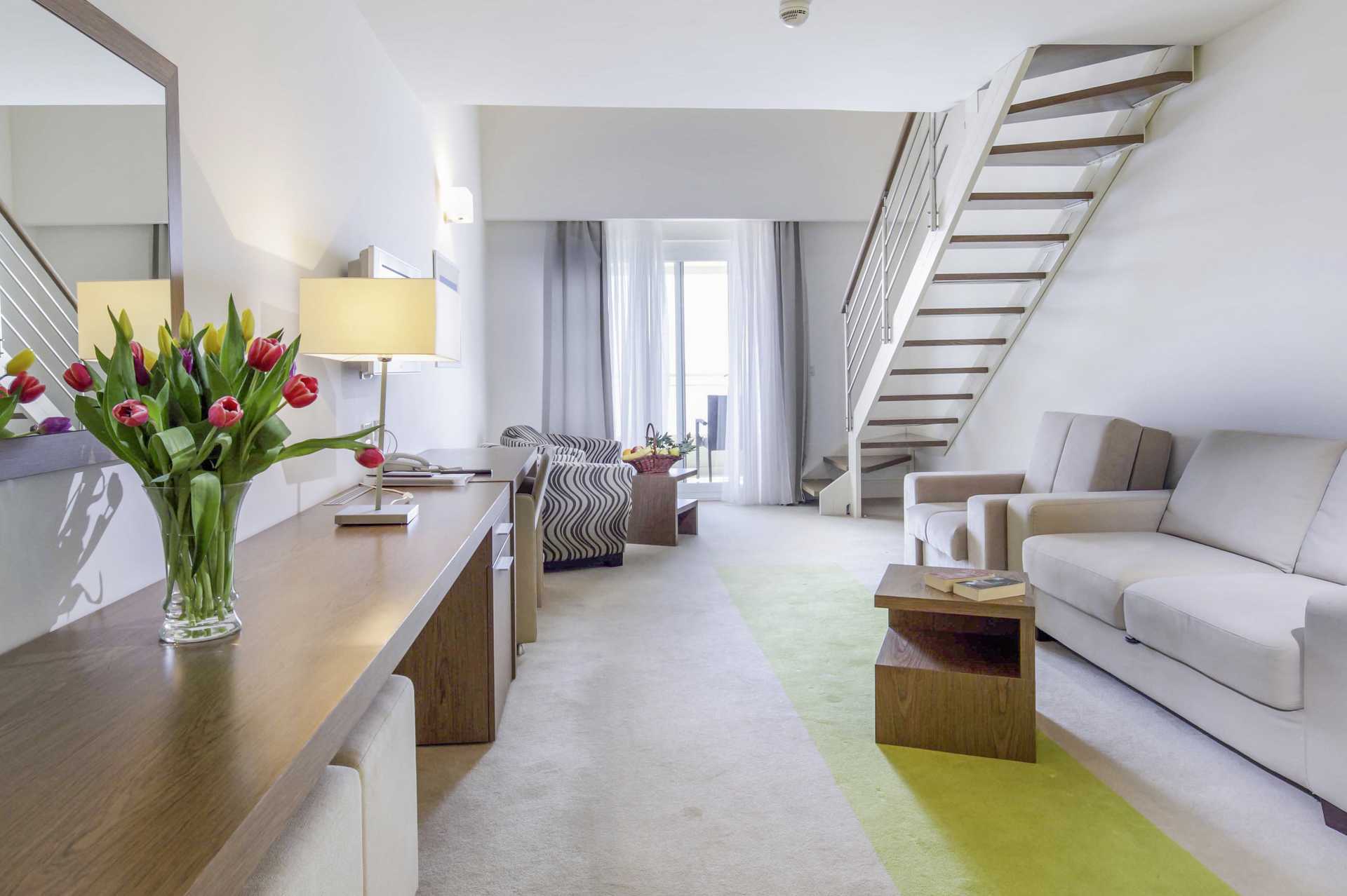 Suiter i etage med balkon og havudsigt. Ovenpå er der en dobbeltseng og nedenunder er der et opholdsrum med mulighed for en ekstra seng i en sovesofa. Åben planløsning mellem etagerne. Gratis wifi, aircondition og deponering. Minibar. El-kedel og kaffe/te. Tv med internationale kanaler. Væg til væg-tæppe. Hårtørrer. Et badeværelse på hver etage, hvoraf det ene har badekar. Toilet. Rengøring 7 gange om ugen.