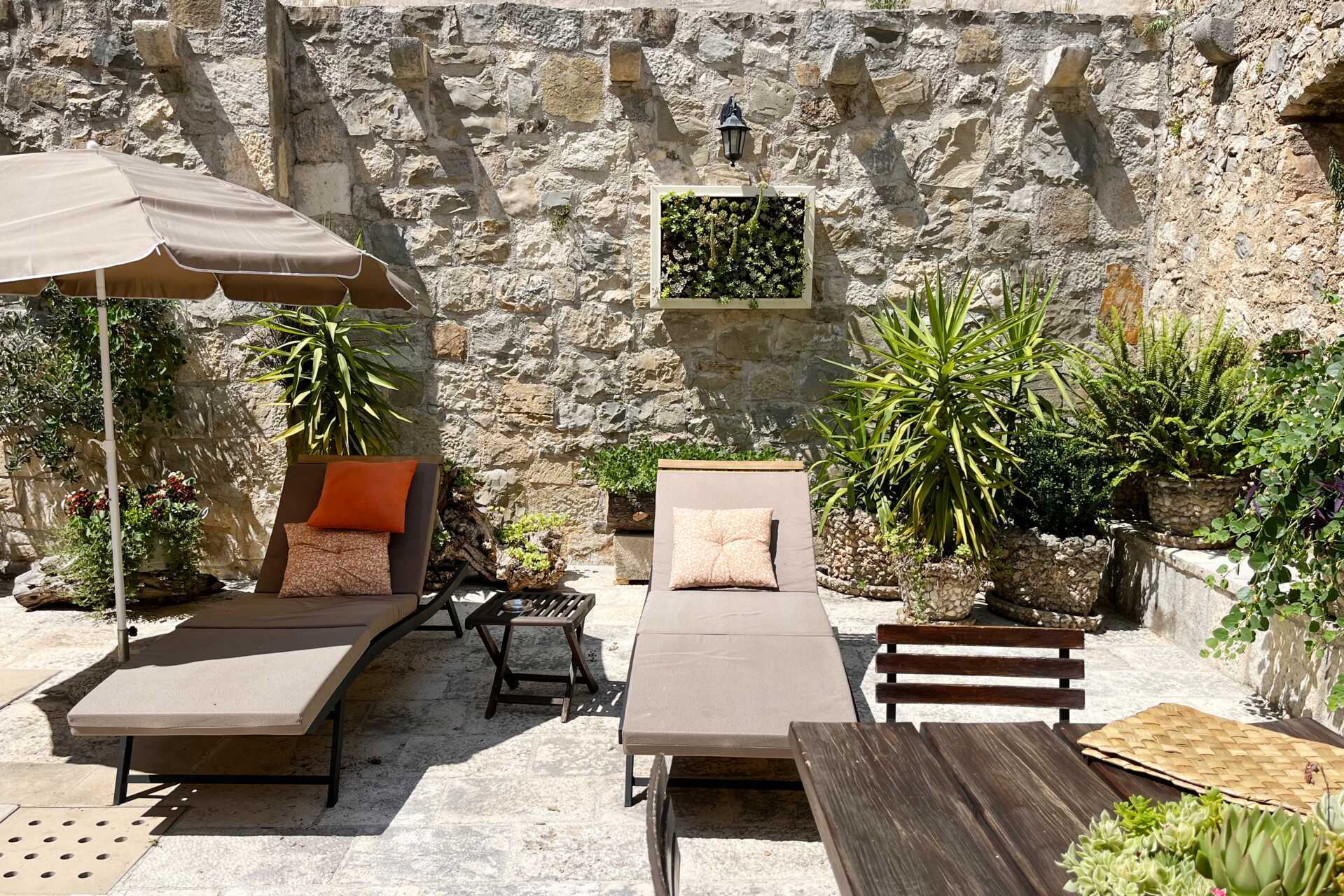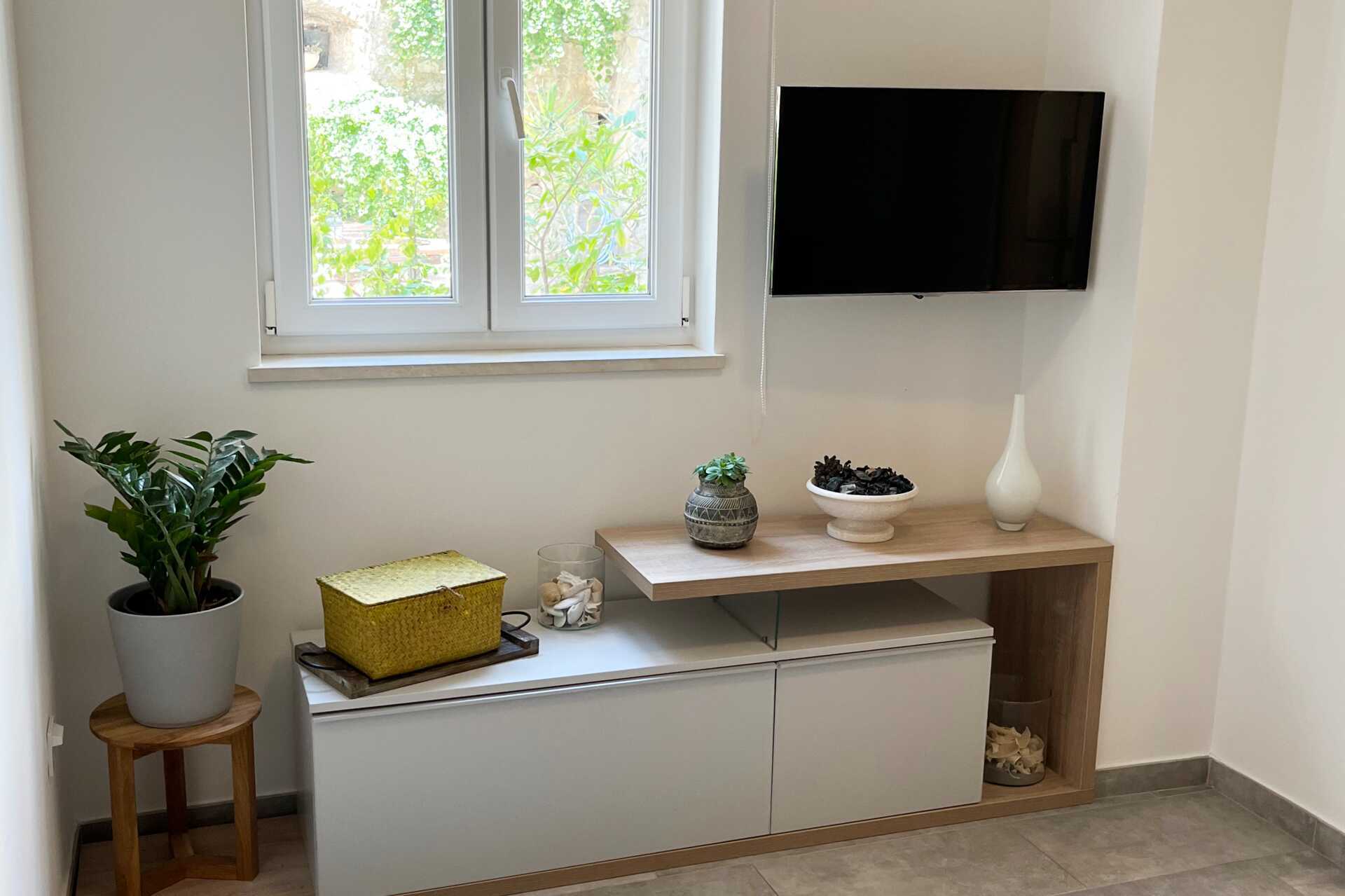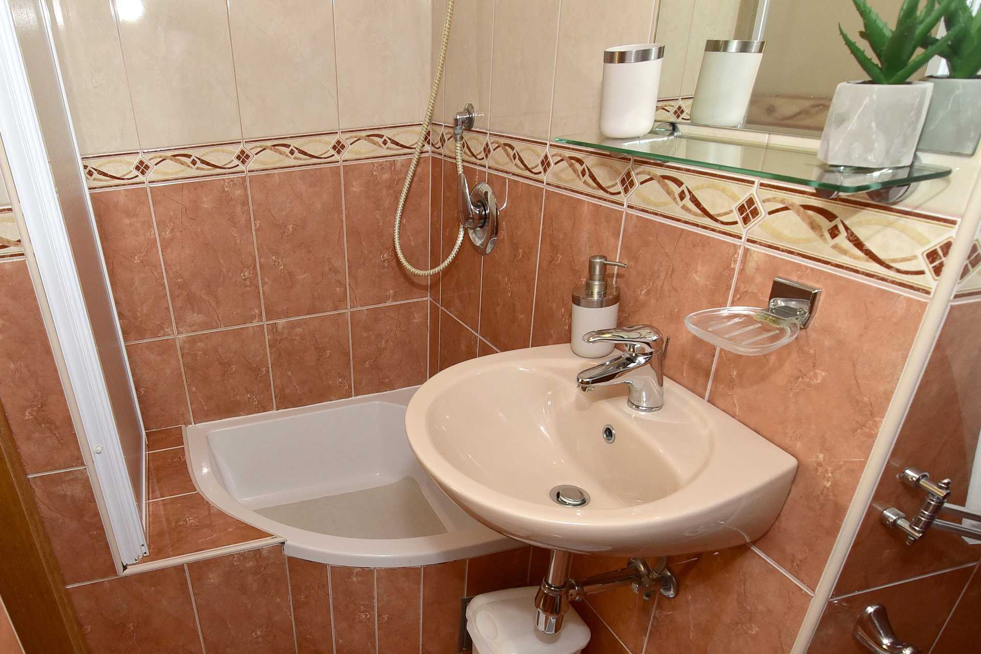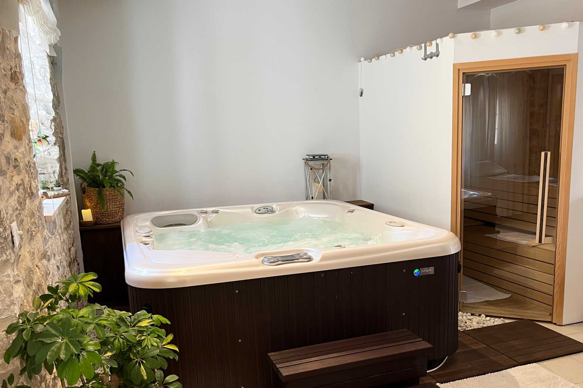 2-værelses lejlighed med jacuzzi og sauna i lejligheden og en terrasse i stueplan med solstole lige udenfor. Et soveværelse med dobbeltseng og kombineret opholdsrum/køkken med mulighed for ekstra sovepladser på en sovesofa. Køkken med kogeplader, ovn, køleskab, mikrobølgeovn, kaffemaskine, brødrister og enkelt køkkenudstyr. Gratis wifi, aircondition og deponering. Tv med internationale kanaler. Vaskemaskine i lejligheden. Hårtørrer. Badeværelse med bruser og separat toilet. Rengøring 7 gange om ugen.