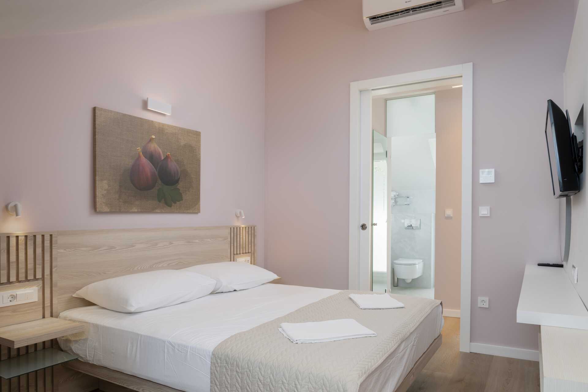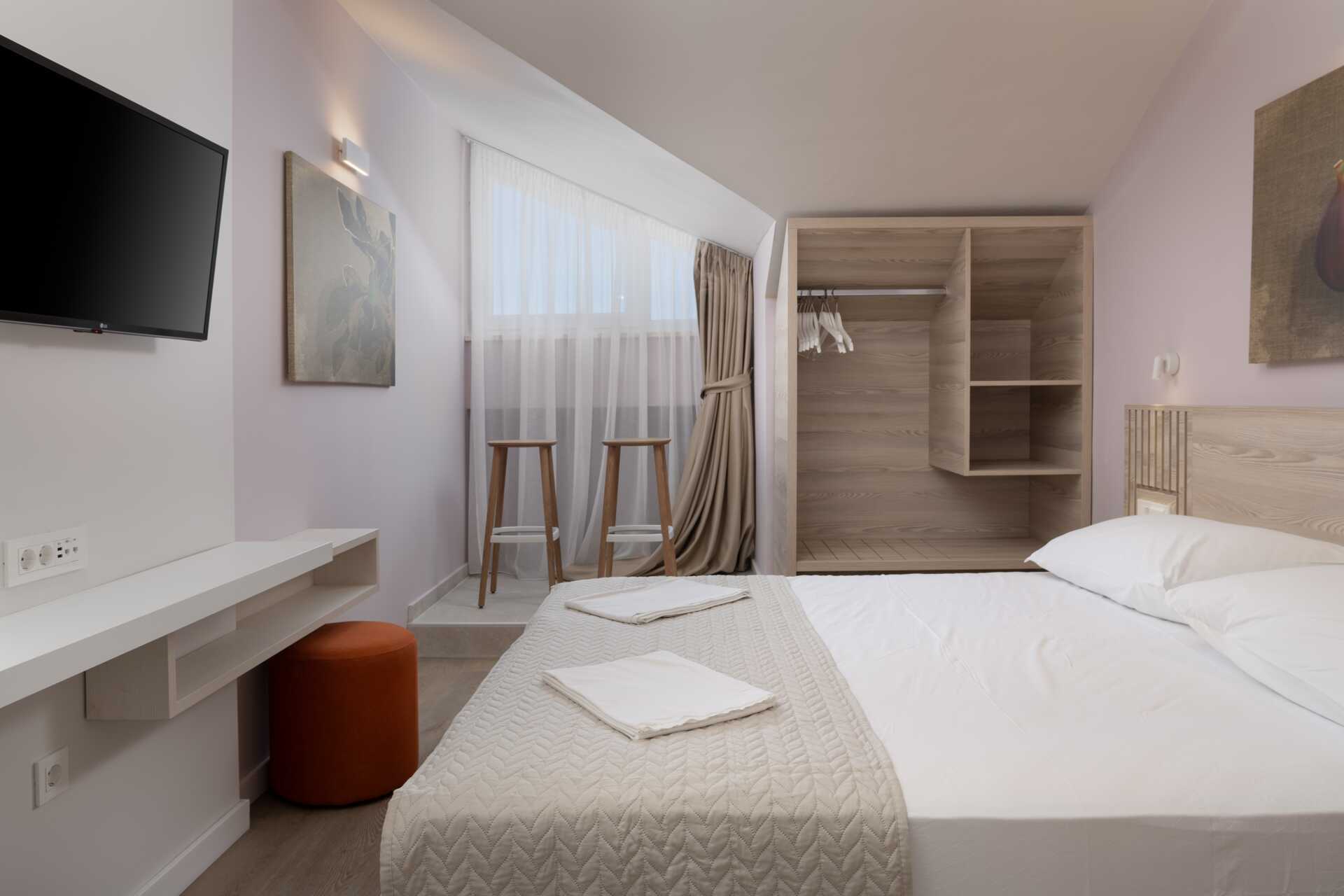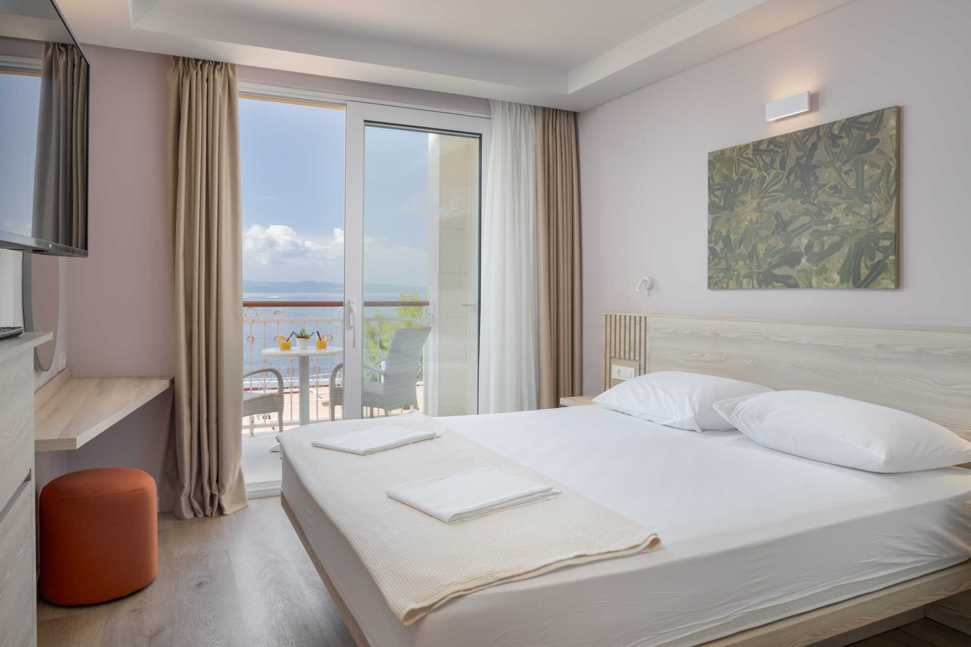 Dobbeltværelse med balkon og havudsigt. Dobbeltværelser og balkoner er i varierende størrelser. En dobbeltseng eller to enkeltsenge. Mulighed for ekstra opredning i sovesofa. Lille køkkenområde med køleskab, el-kedel, kaffemaskine og enkelt køkkenudstyr. Kogepladerne mangler. Gratis wifi, aircondition og deponering. Tv med lokale kanaler. Hårtørrer. Badeværelse med bruser og toilet. Rengøring 7 gange om ugen.
