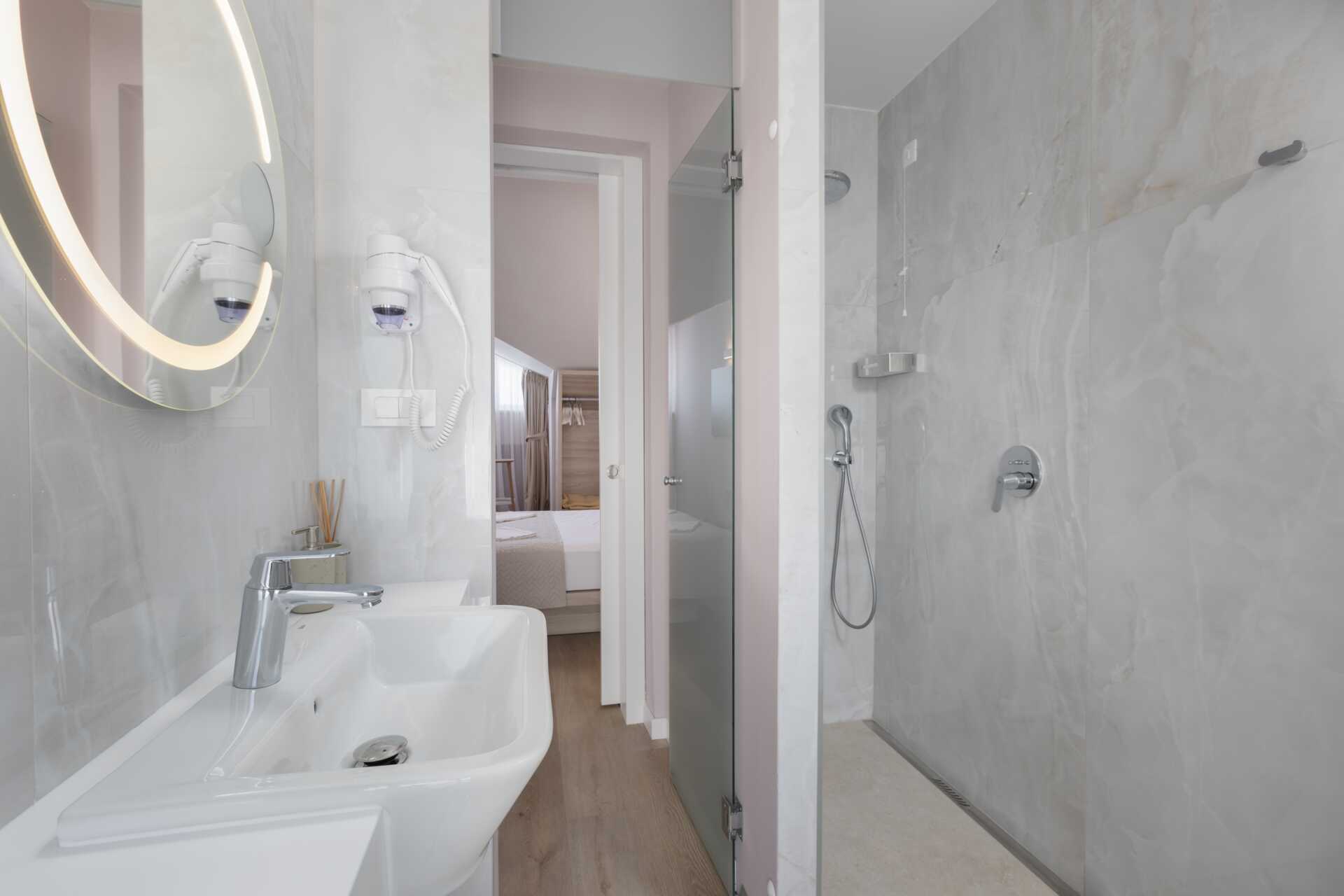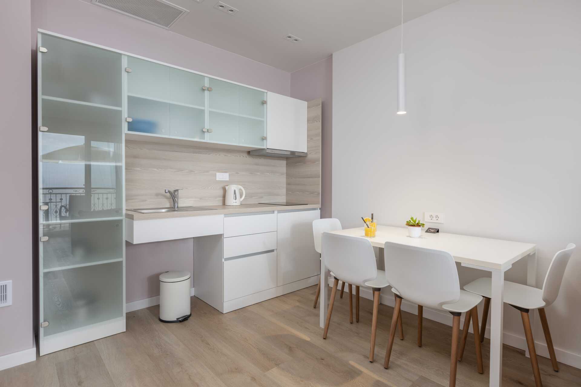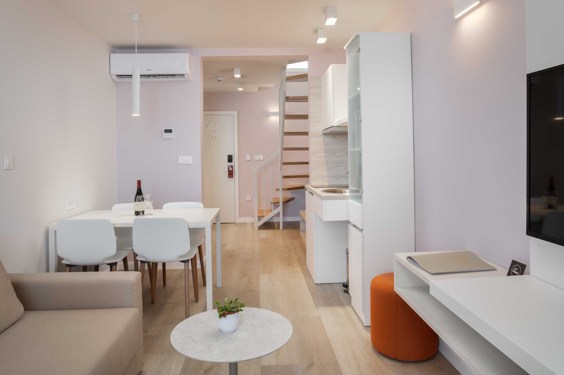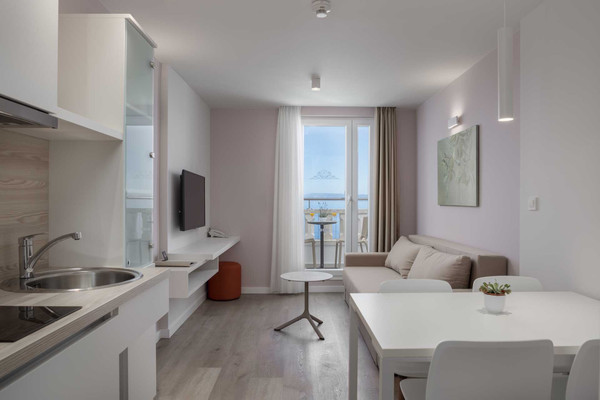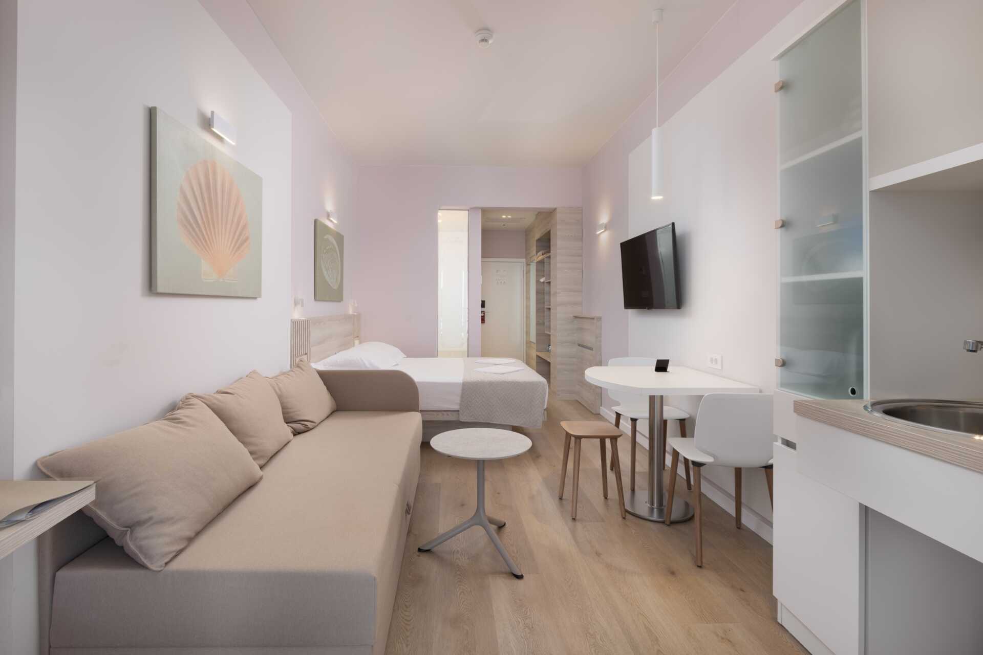 Junior-suiter med balkon eller terrasse i forskellige størrelser, nogle balkoner har havudsigt. Soveværelse og kombineret opholdsrum med lille køkkendel. Nogle 2-værelses lejligheder har trapper. En dobbeltseng eller to enkeltsenge. Mulighed for ekstra opredninger i sovesofa. Lille køkkenområde med køleskab, el-kedel, kaffemaskine og enkelt køkkenudstyr. Kogepladerne mangler. Gratis wifi, aircondition og deponering. Tv med internationale kanaler. Hårtørrer. Badeværelse med bruser og toilet. Rengøring 7 gange om ugen.