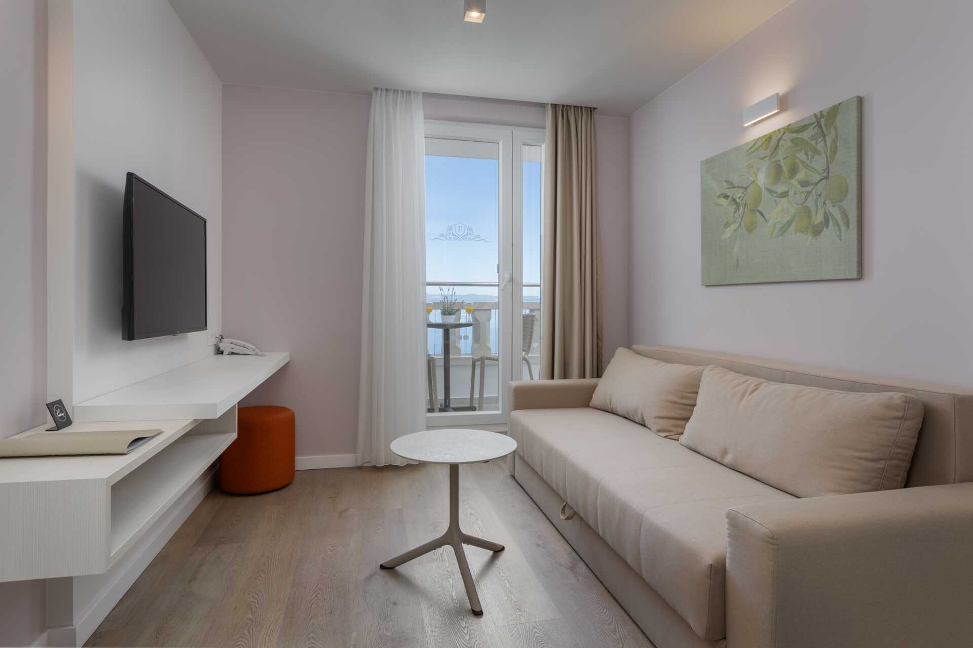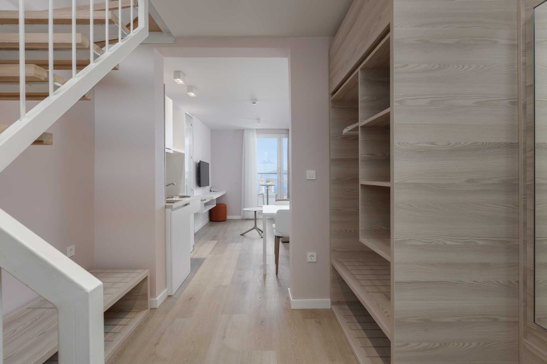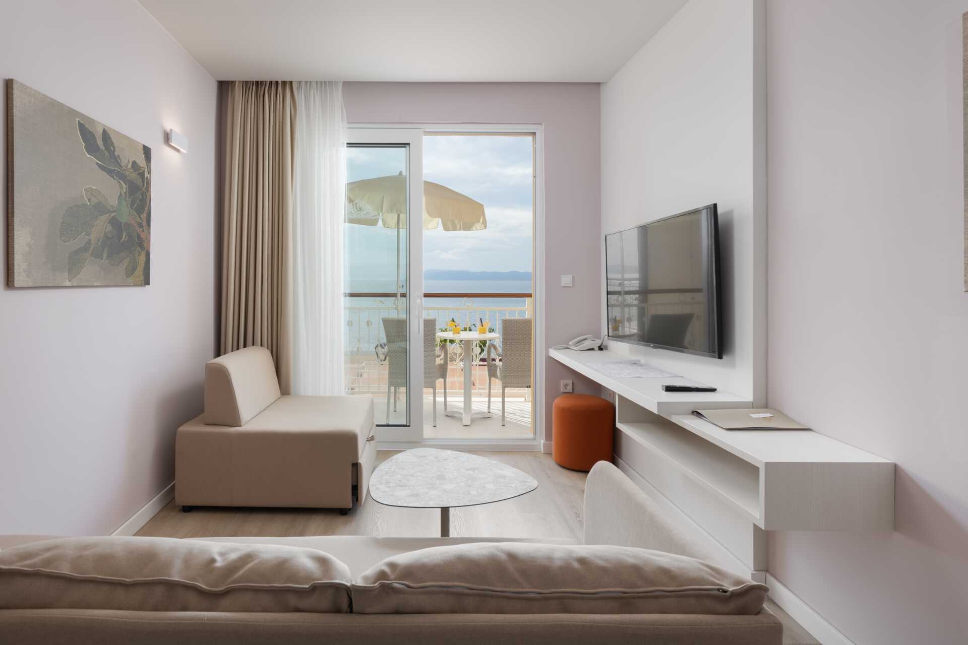 Junior-suiter i etage med lille balkon med havudsigt. I entréplan er der en kombineret opholdsrum med minikøkken og et badeværelse med hårtørrer, bruser og toilet. Ovenpå er der soveværelse med dobbeltseng eller to enkeltsenge. Mulighed for ekstra opredninger i sovesofa i opholdsrummet. Lille køkkenområde med køleskab, el-kedel, kaffemaskine og enkelt køkkenudstyr. Kogepladerne mangler. Gratis wifi, aircondition og deponering. Tv med lokale kanaler. Hårtørrer. Rengøring 7 gange om ugen.