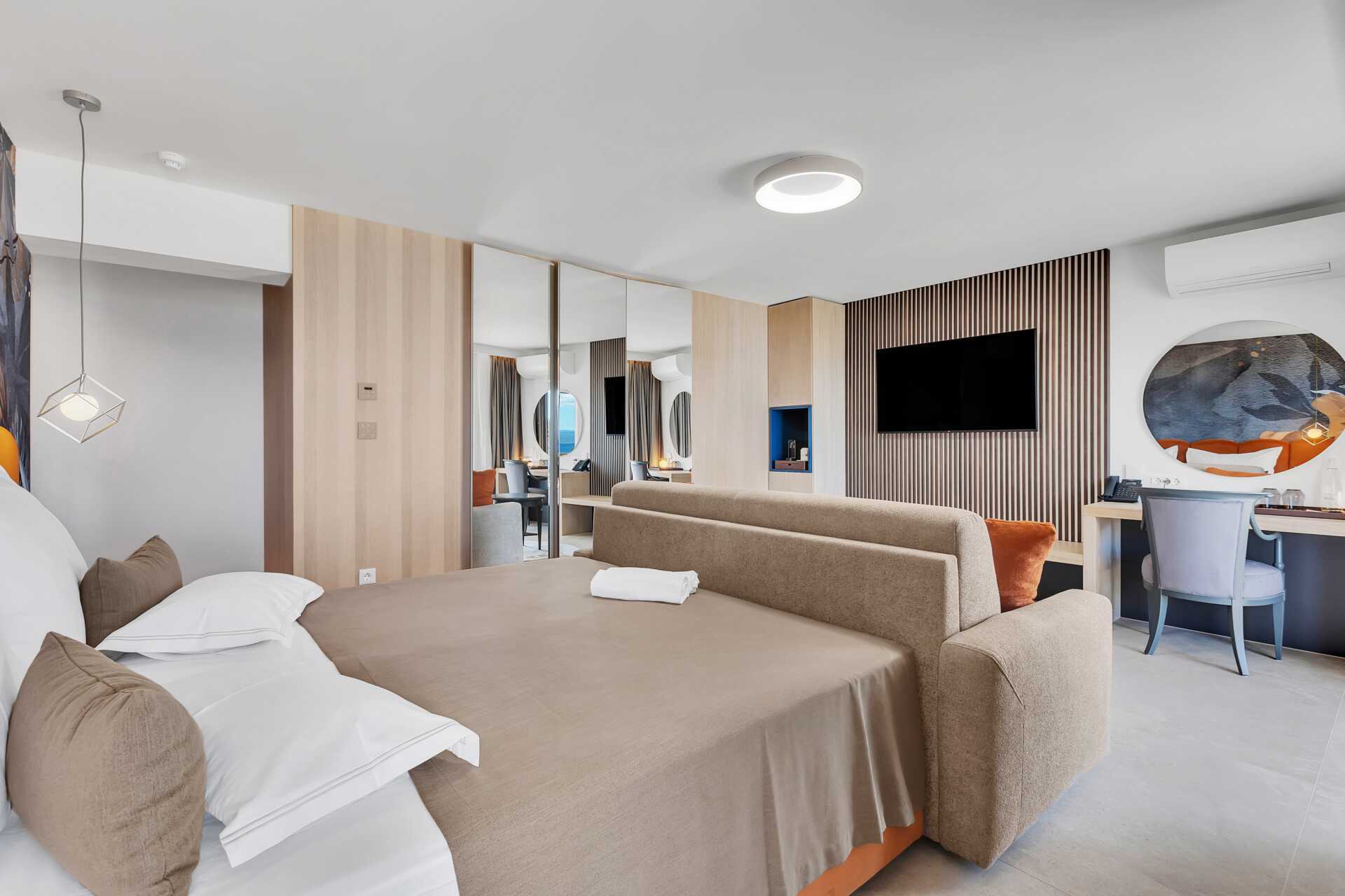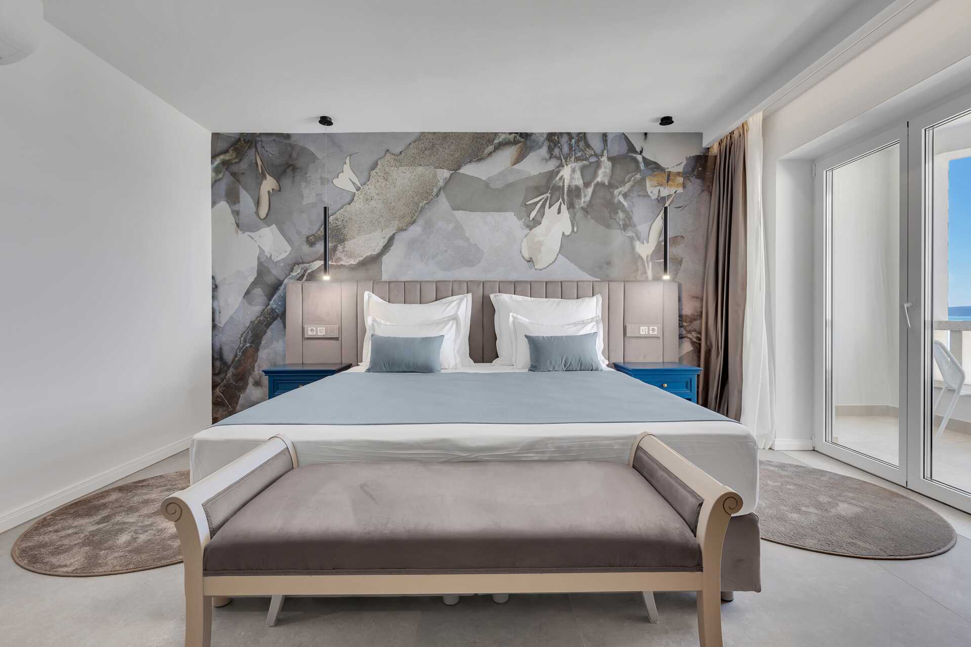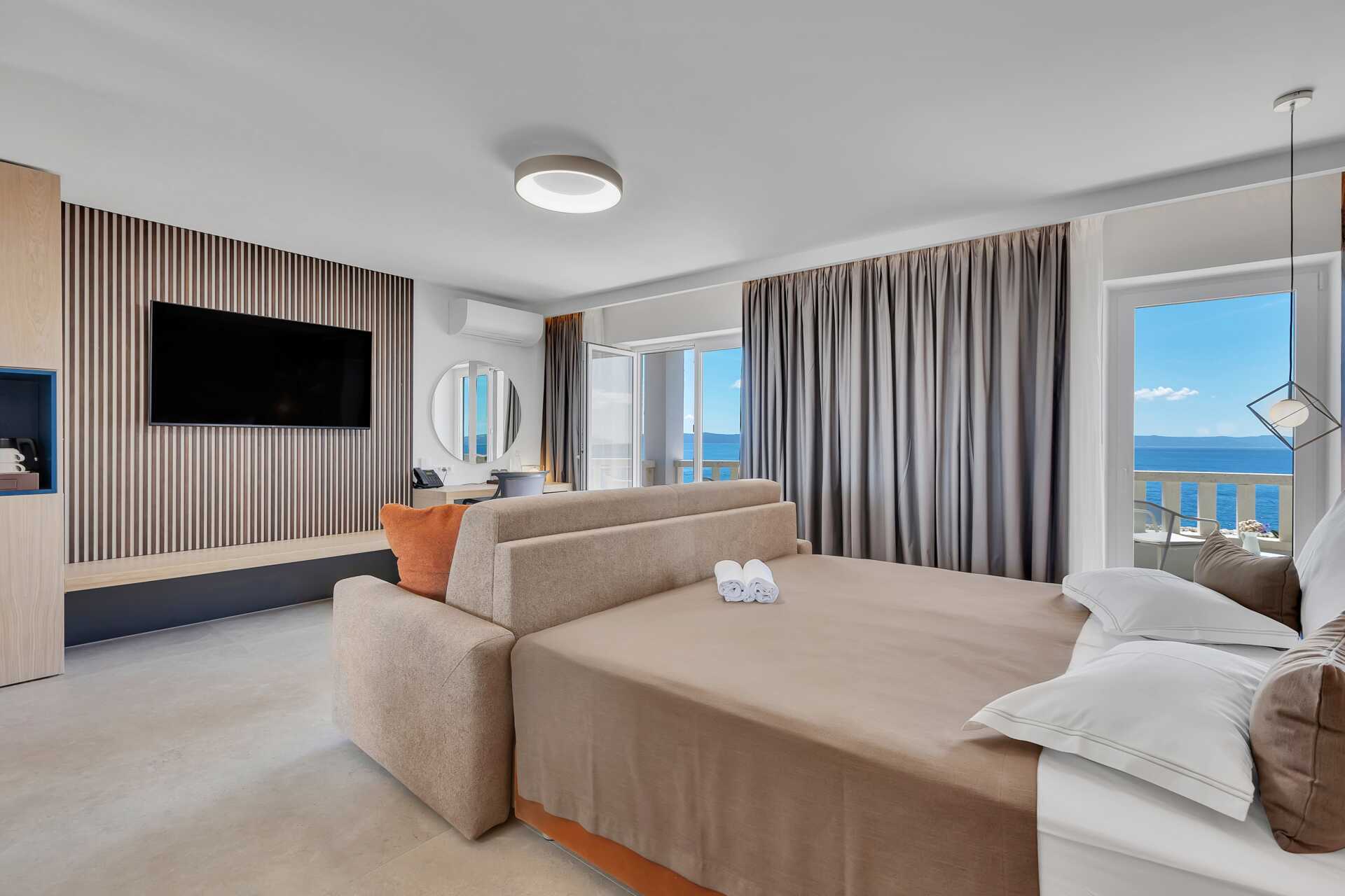 Superior-værelse med balkon og havudsigt. Nogle af værelserne på øverste etage har skrånende lofter, nogle af disse værelser har også blokeret udsigt, når man sidder ned, på grund af høje balkonrækværk. En dobbeltseng. Mulighed for ekstra opredning. Wifi, aircondition og deponering inkluderet. Mini bar. Tv med internationale kanaler og minibar. Væg til væg-tæppe. Hårtørrer. Badeværelse med bruser og toilet. Rengøring 7 gange om ugen.