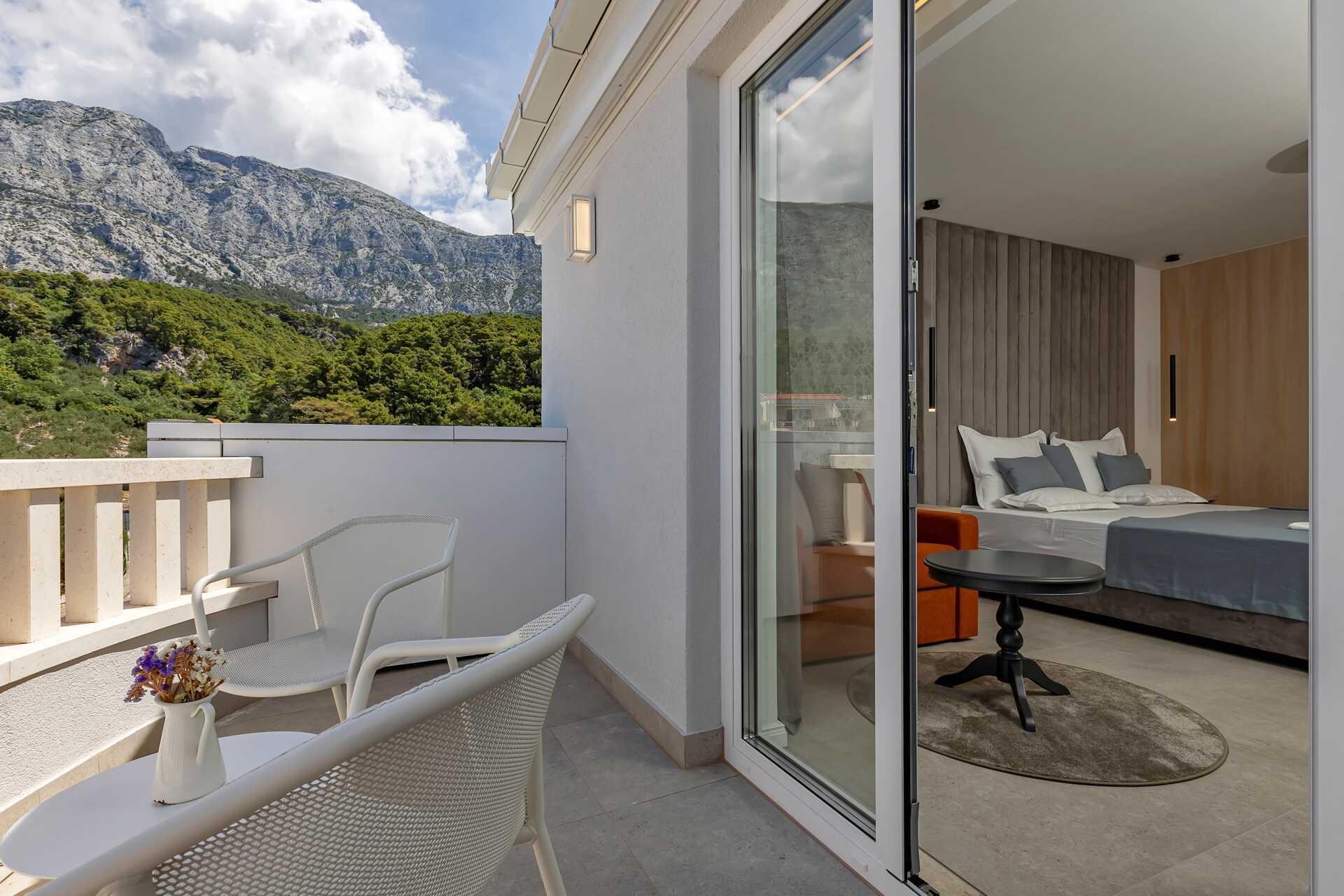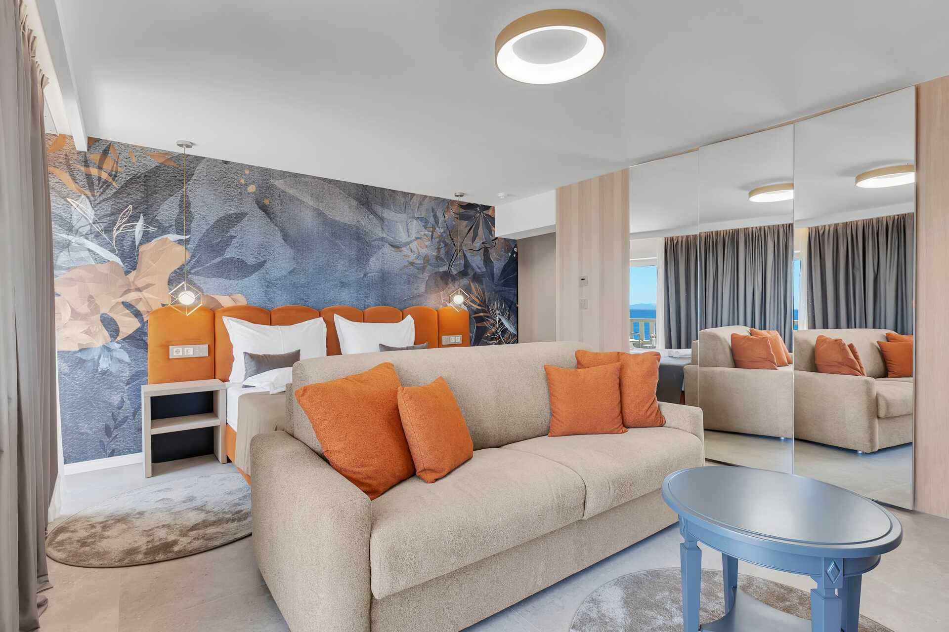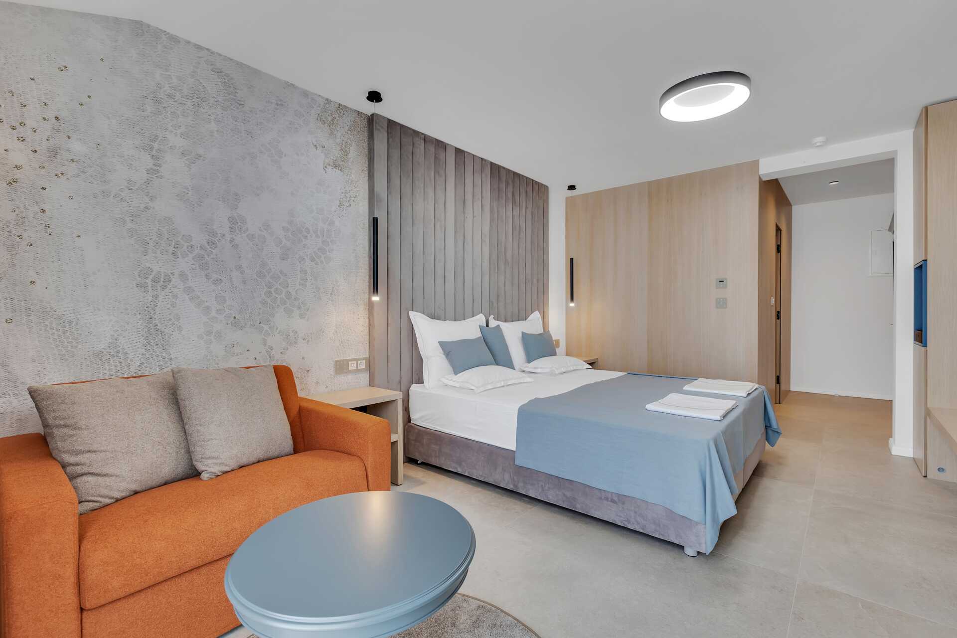 Superior-værelse med balkon og havudsigt. Nogle af værelserne på øverste etage har skrånende lofter, nogle af disse værelser har også blokeret udsigt, når man sidder ned, på grund af høje balkonrækværk. En dobbeltseng. Mulighed for ekstra opredning. Wifi, aircondition og deponering inkluderet. Mini bar. Tv med internationale kanaler og minibar. Væg til væg-tæppe. Hårtørrer. Badeværelse med bruser og toilet. Rengøring 7 gange om ugen.