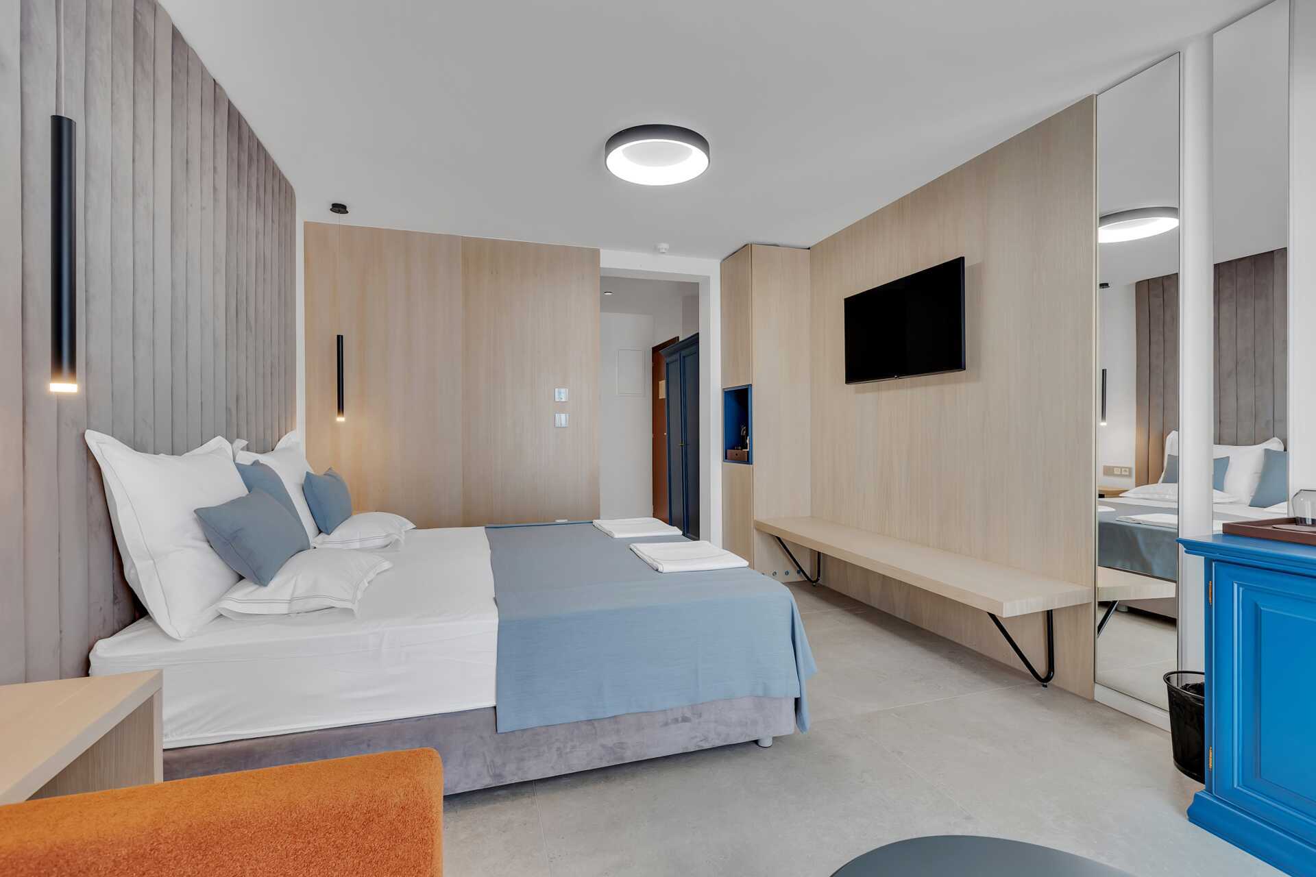 Dobbeltværelser med balkon, nogle med havudsigt og nogle med delvis havudsigt. Nogle af værelserne på øverste etage har skrånende lofter, og nogle af disse værelser har også blokeret udsigt, når man sidder ned på grund af høje balkonrækværk. En dobbeltseng. Gratis wifi, aircondition og deponering. Minibar. Tv med internationale kanaler. Hårtørrer. Badeværelse med bruser og toilet. Rengøring 7 gange om ugen.