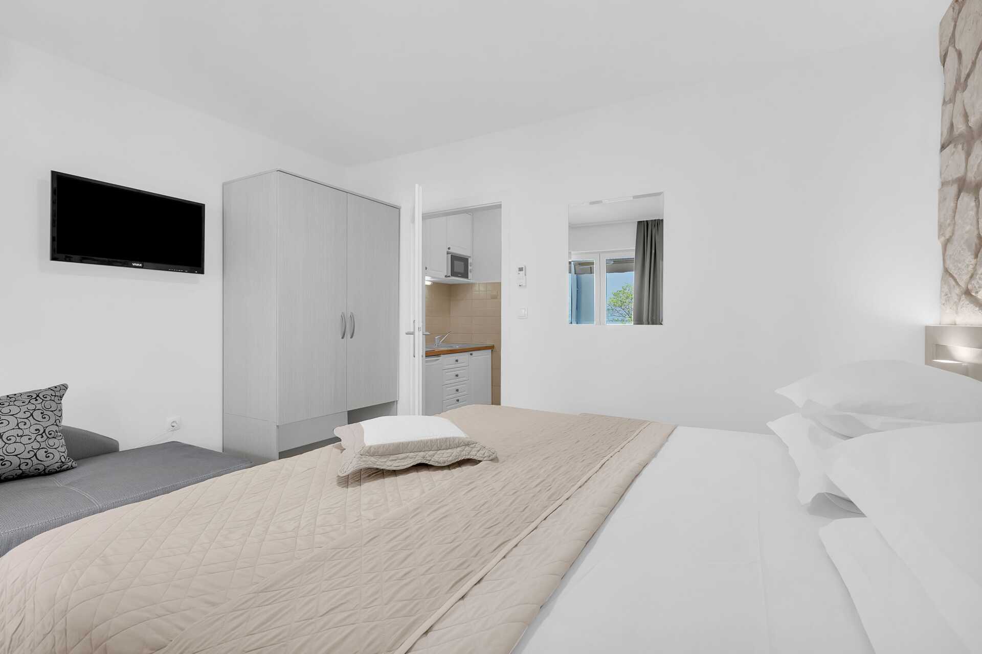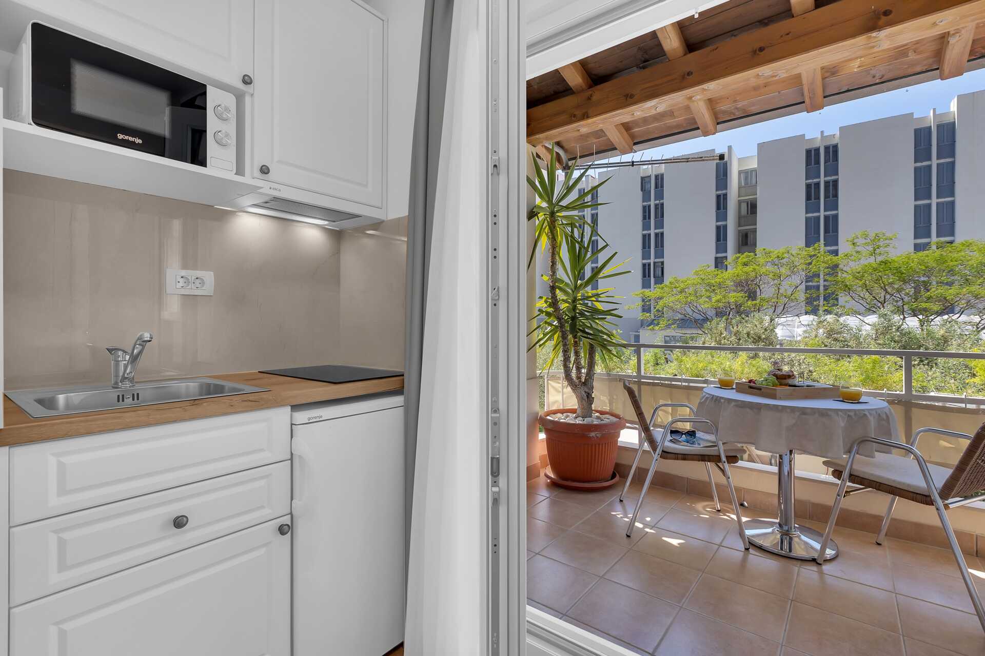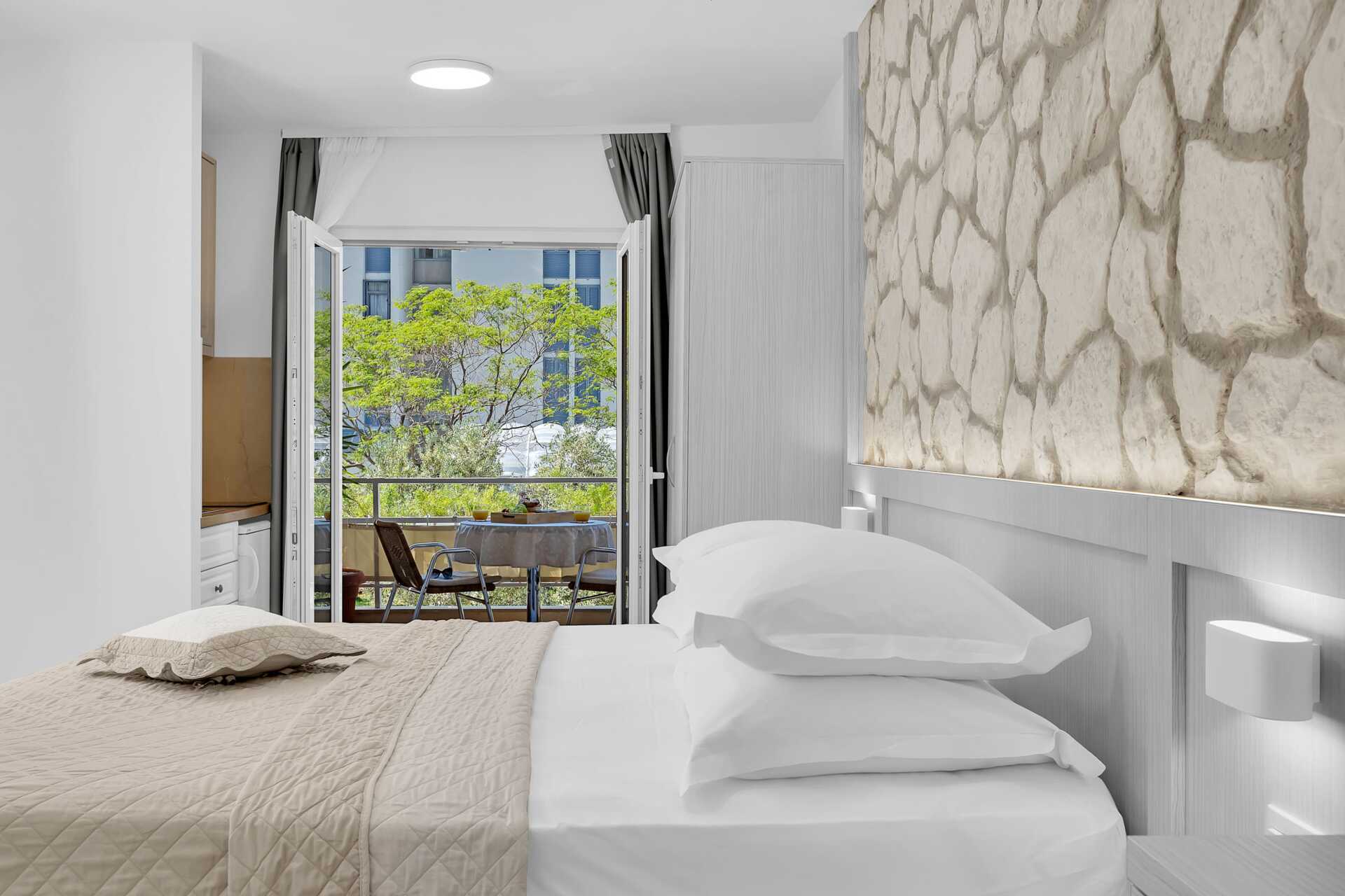 1-værelses lejligheder med balkon. Soveværelse kombineret med minikøkken. En dobbeltseng. Mulighed for ekstra opredning i sovesofa. Minikøkken med kogeplader, køleskab, el-kedel og enkelt køkkenudstyr. Gratis wifi, aircondition og deponering. Tv med internationale kanaler. Hårtørrer. Badeværelse med bruser og toilet. Rengøring 6 gange om ugen.