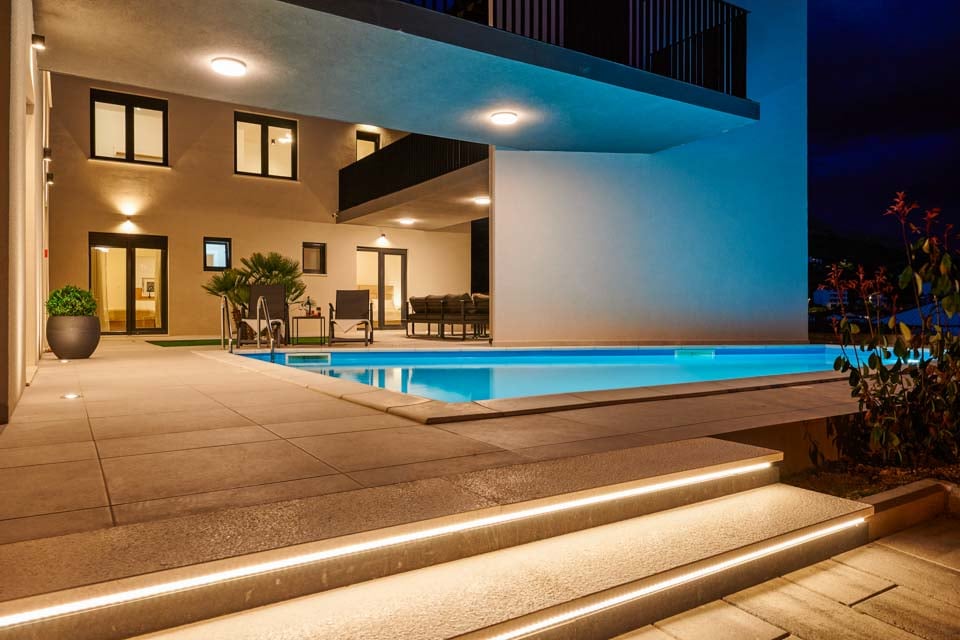 Denne unikt designede villa er enestående med en sandstensfacade poleret som en sten og en udendørs tagterrasse, der tilbyder en fugleperspektiv over den maleriske by Omiš.
