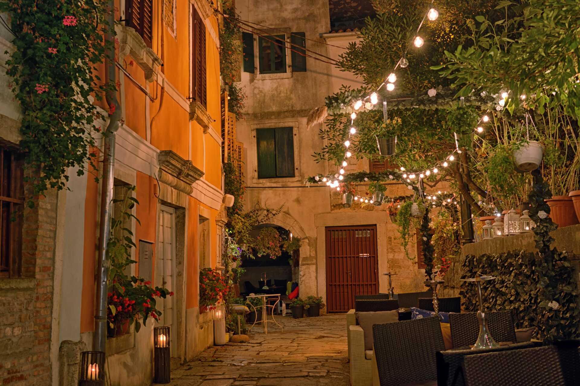 Porecs gamle bydel er det naturlige samlingspunkt for aftenen med et bredt udvalg af caféer, restauranter og barer. I den gamle bydel finder du også “Vinotecas”, som sælger lokale vine og specialiteter, såsom hjemmelavet pasta, olivenolie, trøfler og honning.