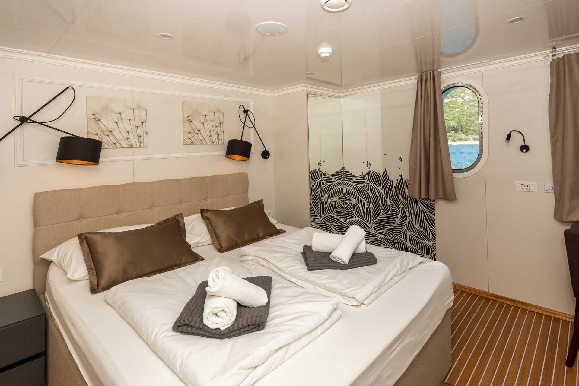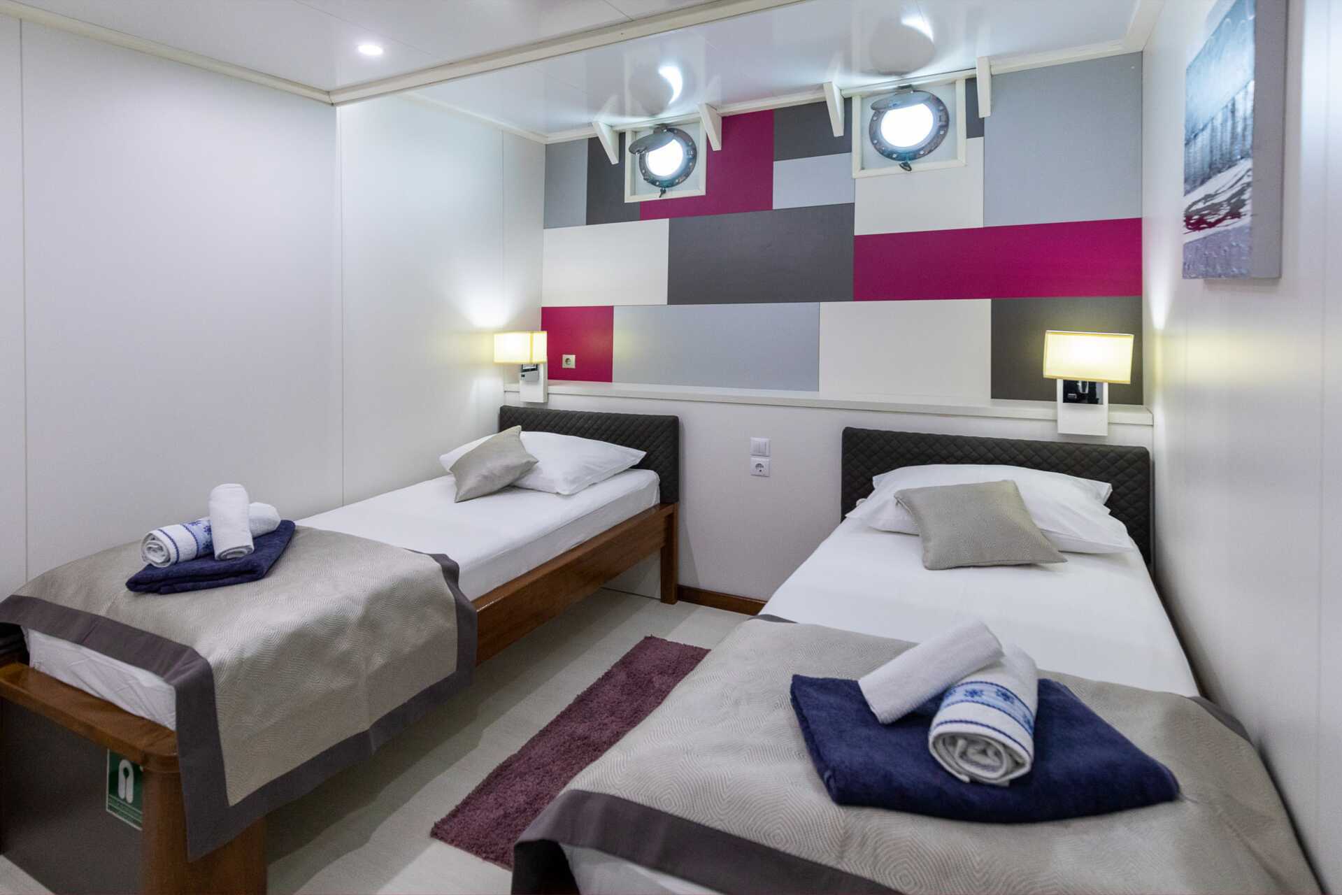 Der er 18-21 kahytter om bord, alle med enten dobbeltseng eller to enkeltsenge. Tv med internationale kanaler. 220V. Aircondition og lille deponeringsboks indgår. Hårtørrer. Moderne badeværelse med bruser og toilet. Garderobe og bagageopbevaring under sengen. Kahytterne varierer i indretning og størrelse, men de er omkring 10–15 kvadratmeter store. Kahytterne på dæk 1 har et lille udluftningsvindue. Håndklæder og sengetøj skiftes en gang midt på ugen.