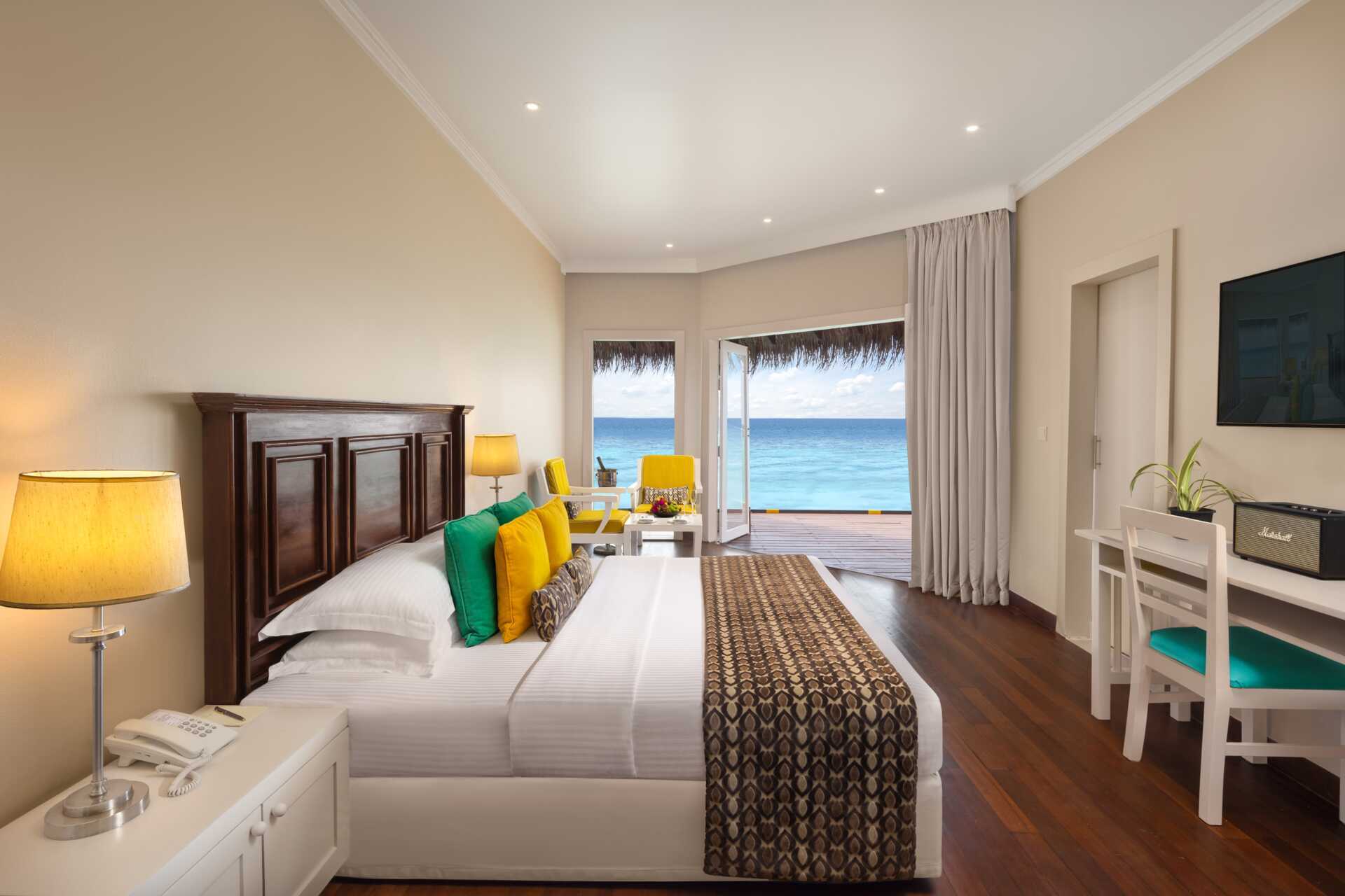 Water villa med soldæk, solstole og stige direkte ud i Det Indiske Ocean. En dobbeltseng. Mulighed for ekstra opredning til én person. Gratis wifi, aircondition og deponering. Køleskab. El-kedel og kaffe/te. Tv med internationale kanaler. Hårtørrer. Badeværelse med bruser og toilet. Rengøring 7 gange om ugen.