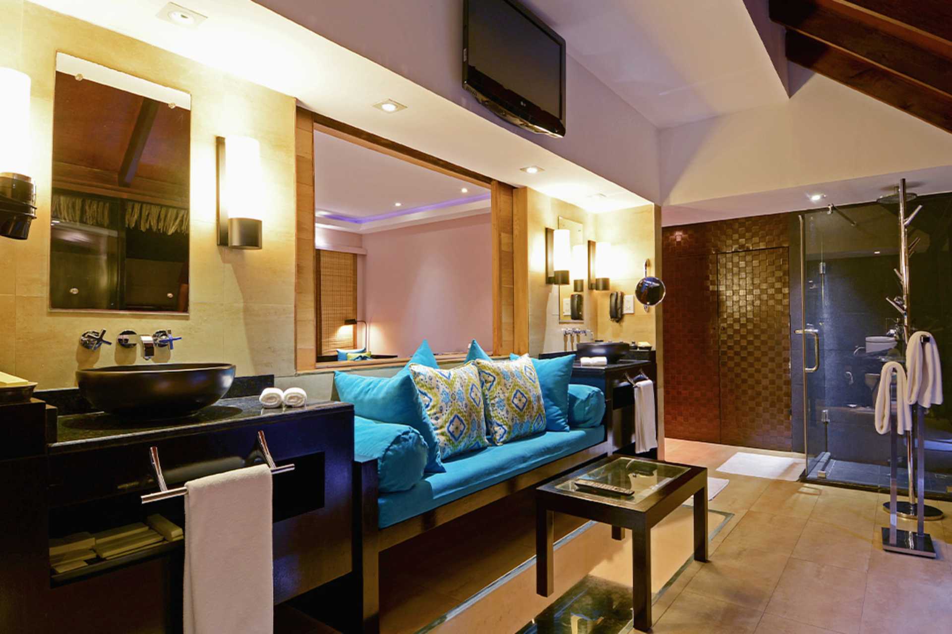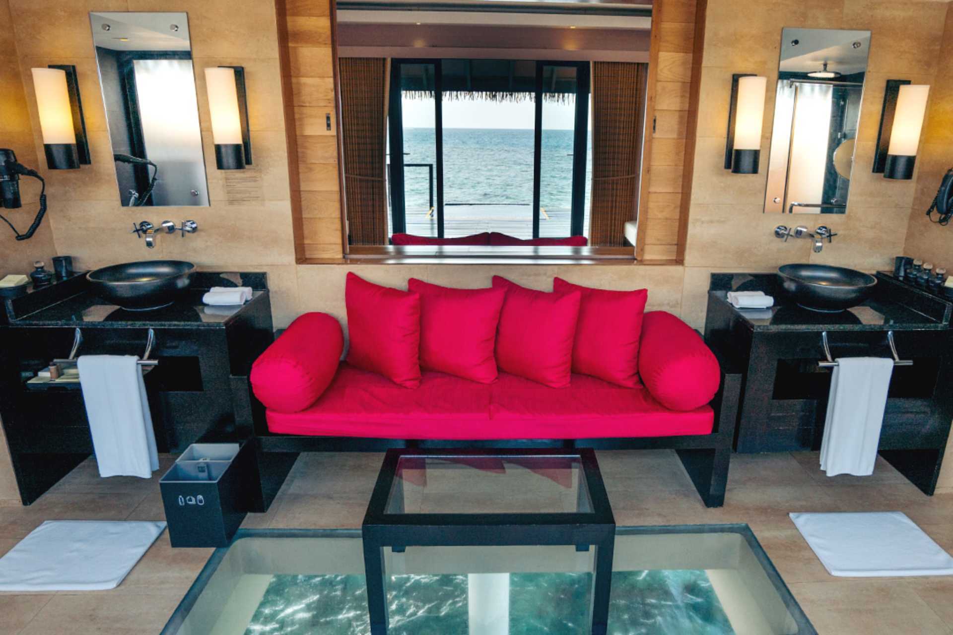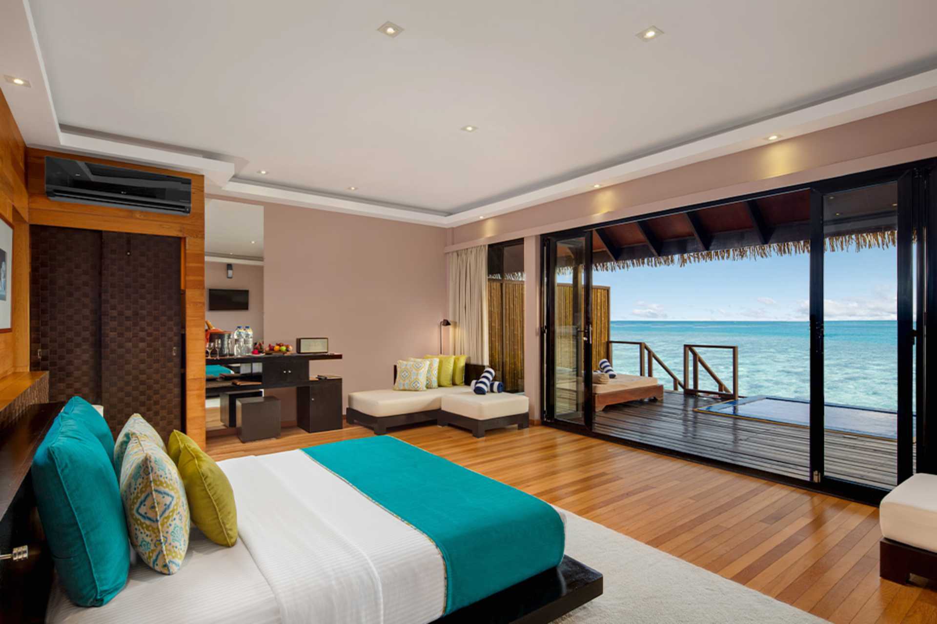 Water Villa med solterrasse og en lille pool (plunge-pool) og stige ned i havet. En dobbeltseng. Gratis wifi, aircondition og deponering. Minibar indgår (fire dåser øl, en lille flaske hvidvin og rødvin, juice, to flasker hver af Coca-Cola, tonic, sodavand og bitter lemon) og genopfyldes én gang dagligt. Værelset har også frisk frugt, chokolade og chips, som genopfyldes dagligt. El-kedel og kaffe/te. Nespresso kaffemaskine - kapsler indgår og genopfyldes hver dag. Tv med internationale kanaler. Hårtørrer. Badeværelse med jacuzzi, separat bruser og toilet. Rengøring 7 gange om ugen.