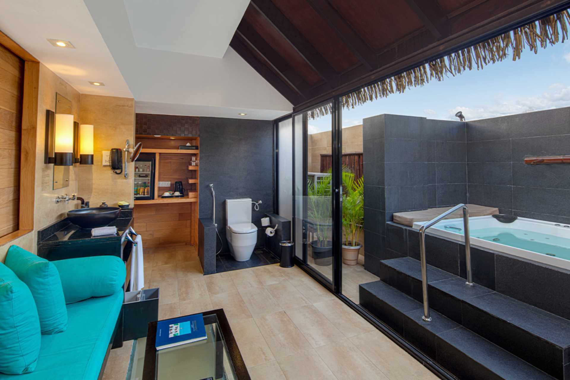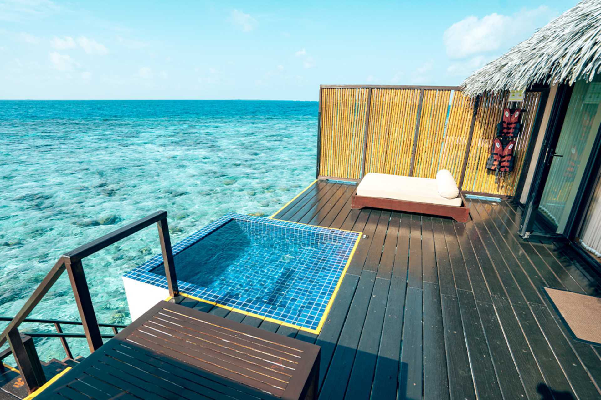 Water Villa Deluxe med solterrasse og en lille pool (plunge-pool) og stige ned i havet.. En dobbeltseng. Gratis wifi, aircondition og deponering. Minibaren er inkluderet (fire dåser øl, en lille flaske hvidvin og rødvin, juice, to flasker hver af Coca-Cola, tonic, sodavand og bitter lemon) og genopfyldes én gang dagligt. Værelset har også frisk frugt, chokolade og chips, som genopfyldes dagligt. El-kedel og kaffe/te. Nespresso kaffemaskine - kapsler indgår og genopfyldes hver dag. Tv med internationale kanaler. Hårtørrer. Badeværelse med jacuzzi, separat bruser og toilet. Rengøring 7 gange om ugen.