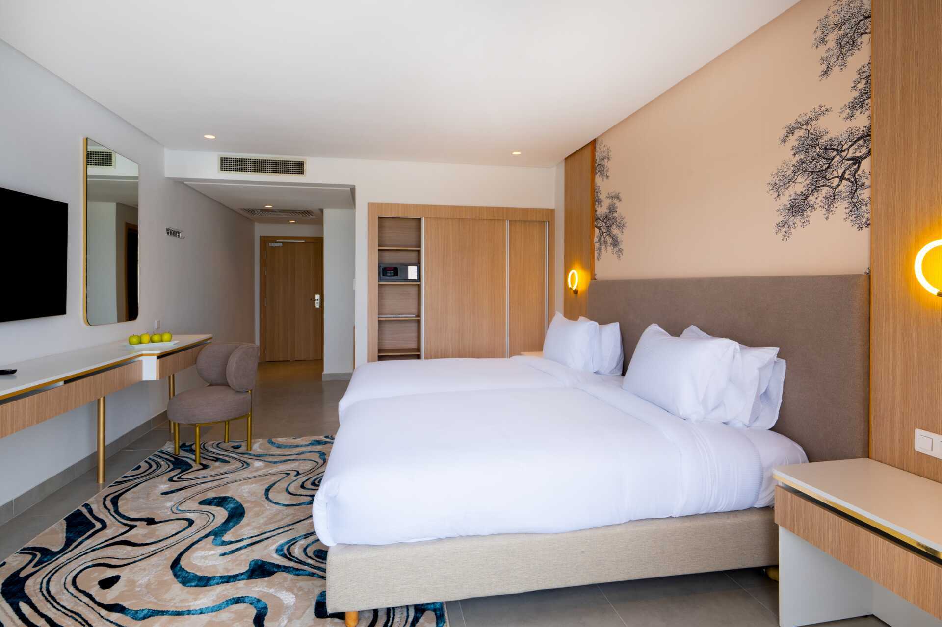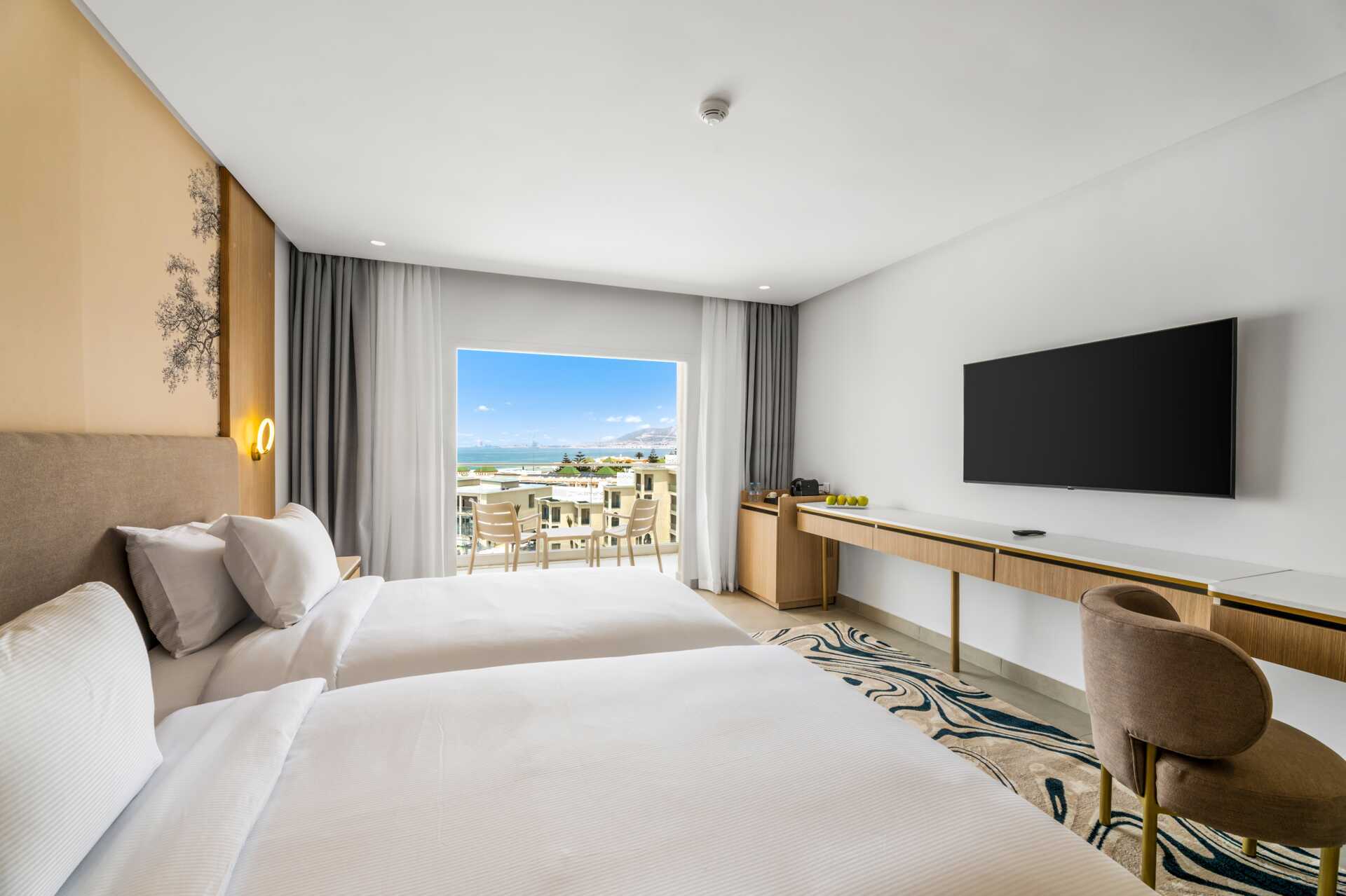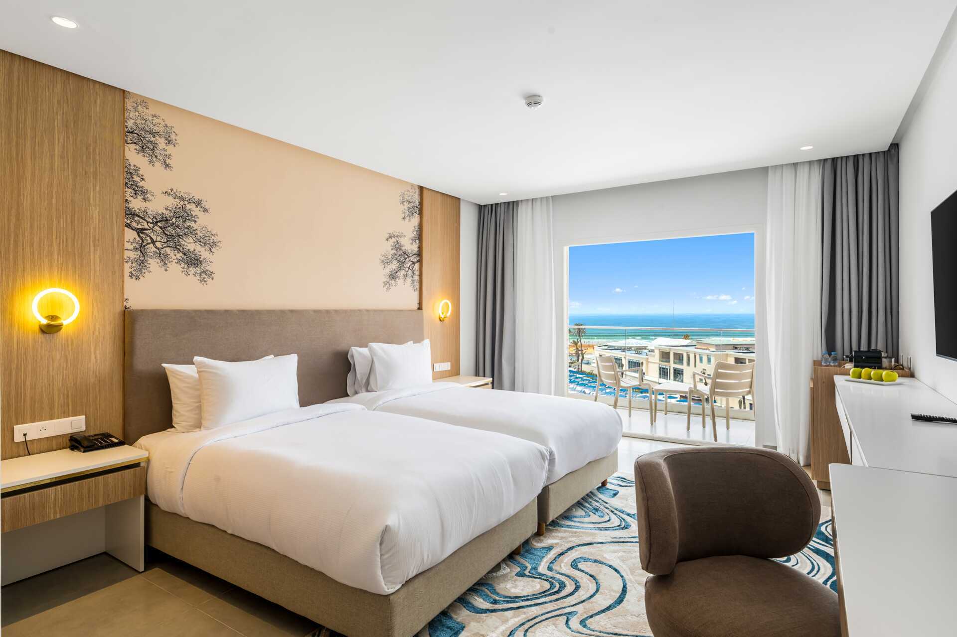 Deluxe-værelse med balkon eller terrasse med enten havudsigt eller delvis havudsigt. En dobbeltseng eller to enkeltsenge. Tv. Gratis wifi, aircondition og deponering. Hårtørrer. Badekar/bruser og toilet. Rengøring 7 gange om ugen.