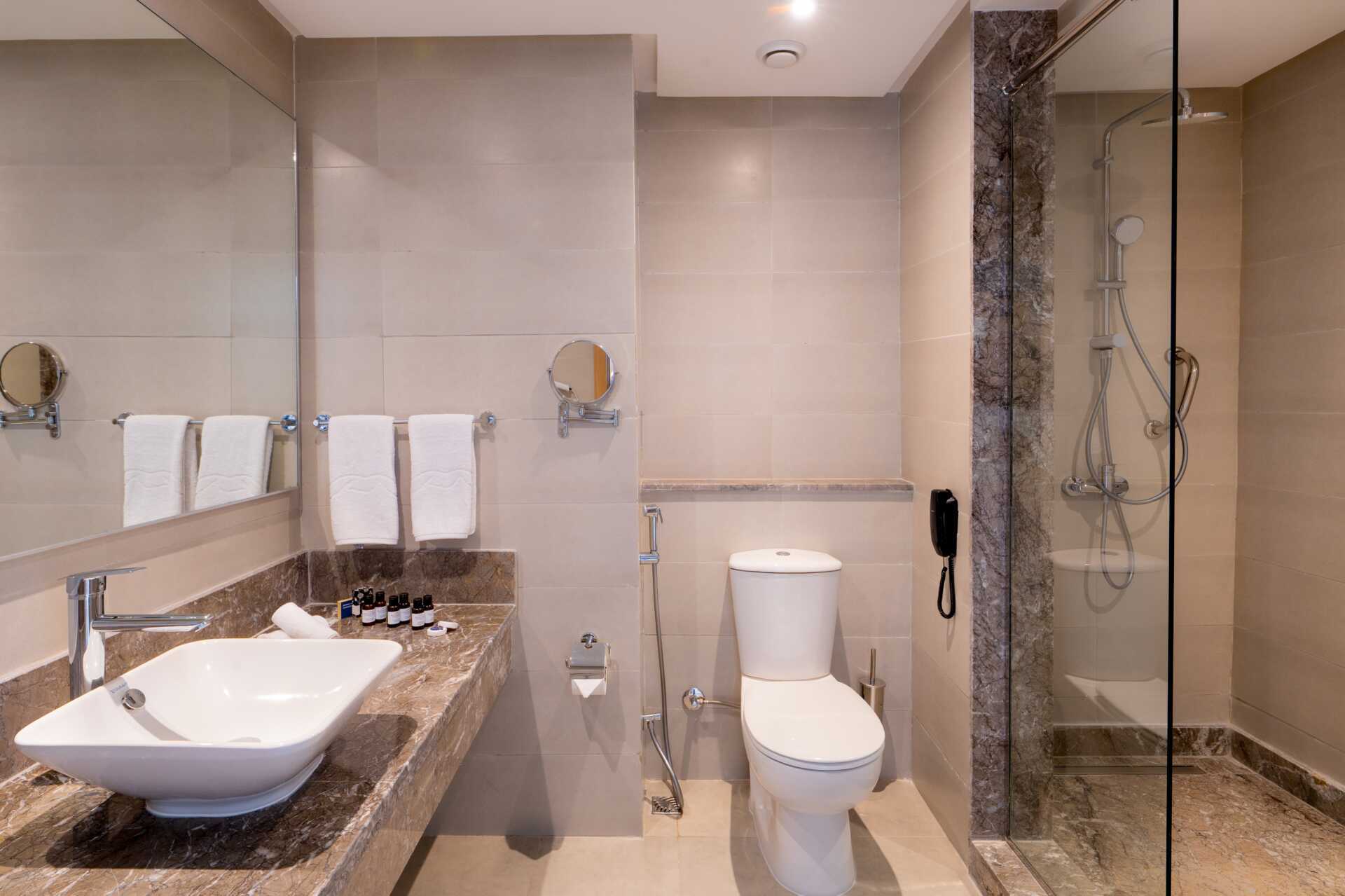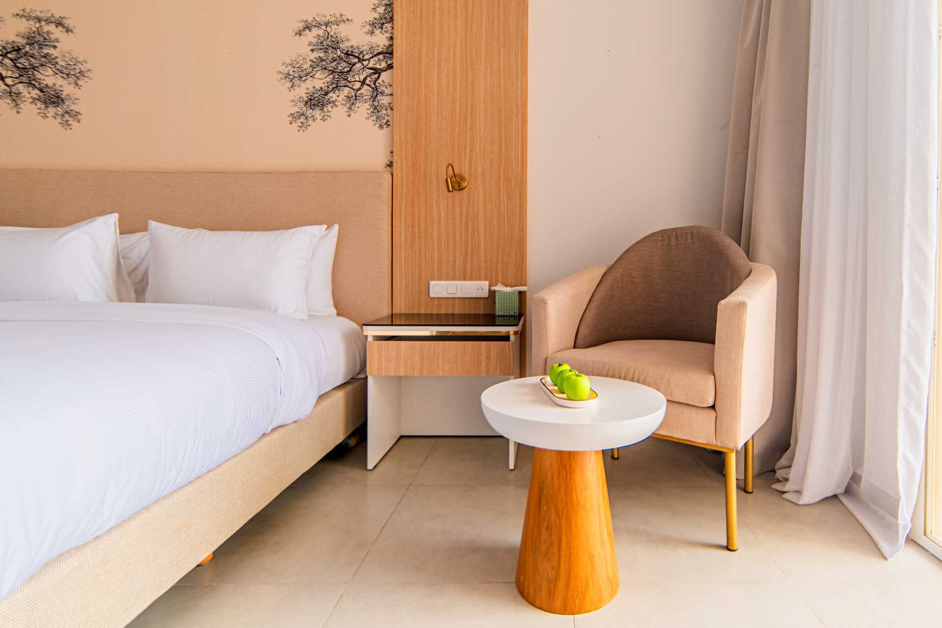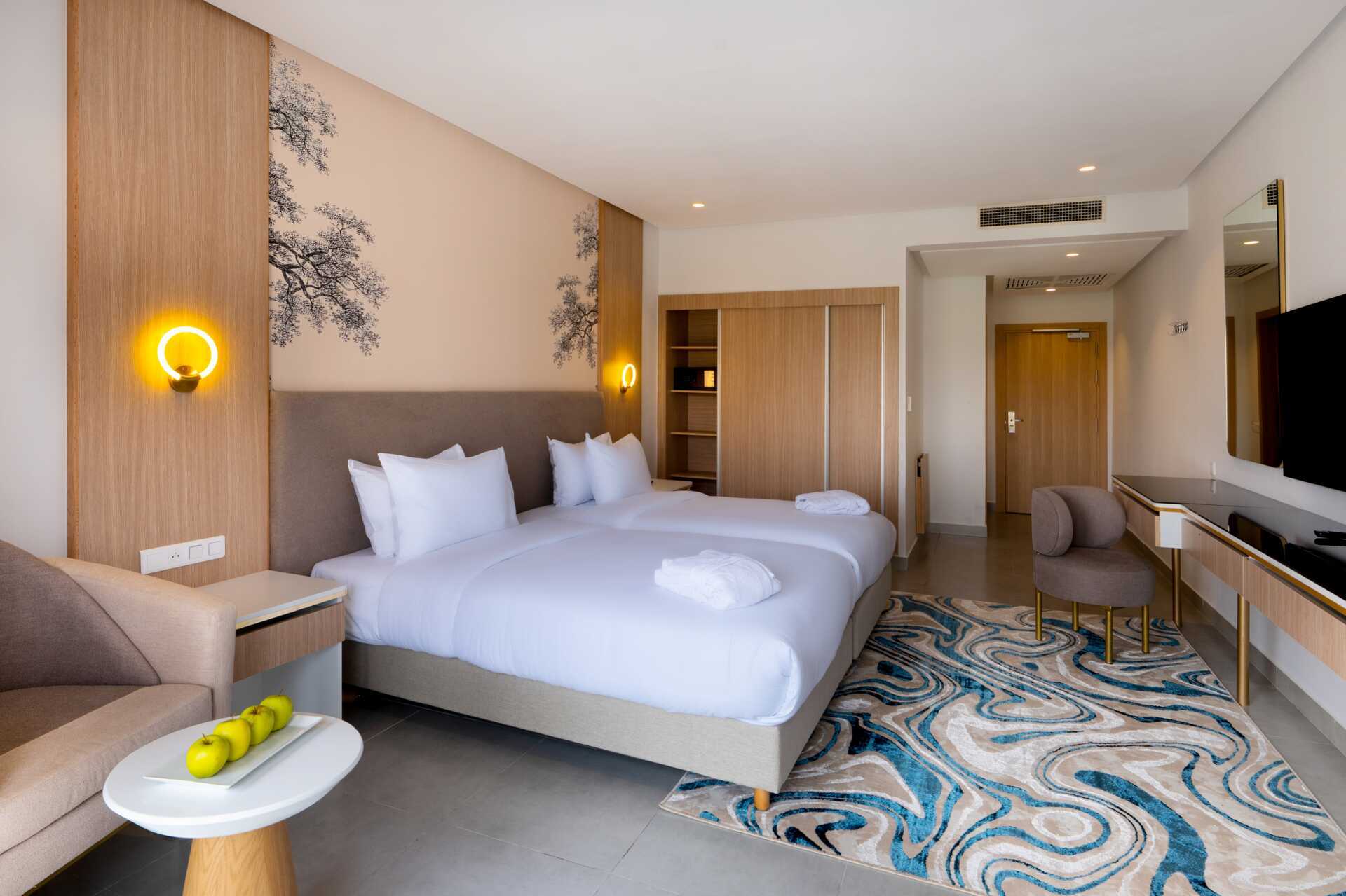 Deluxe-værelse med balkon eller terrasse med enten havudsigt eller delvis havudsigt. En dobbeltseng eller to enkeltsenge. Tv. Gratis wifi, aircondition og deponering. Hårtørrer. Badekar/bruser og toilet. Rengøring 7 gange om ugen.
