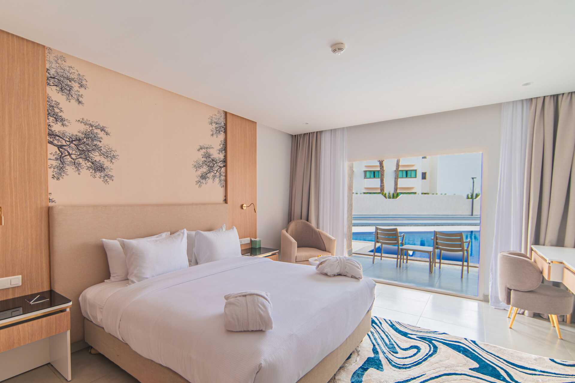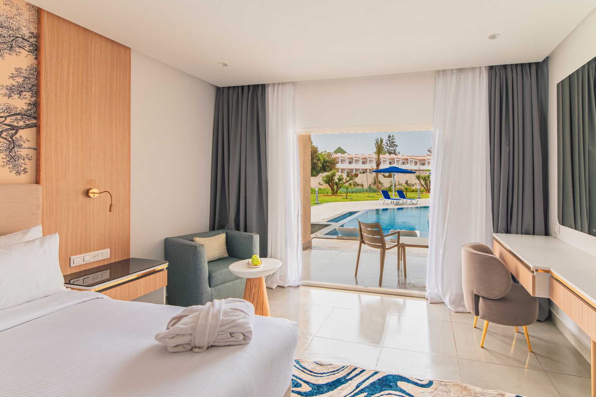 Deluxe-suite med direkte adgang til delt pool. Terrasse med udsigt over pools. En dobbeltseng eller to enkeltsenge og en sovesofa. Tv. Gratis wifi, aircondition og deponering. Hårtørrer. Badekar/bruser og toilet. Rengøring 7 gange om ugen.