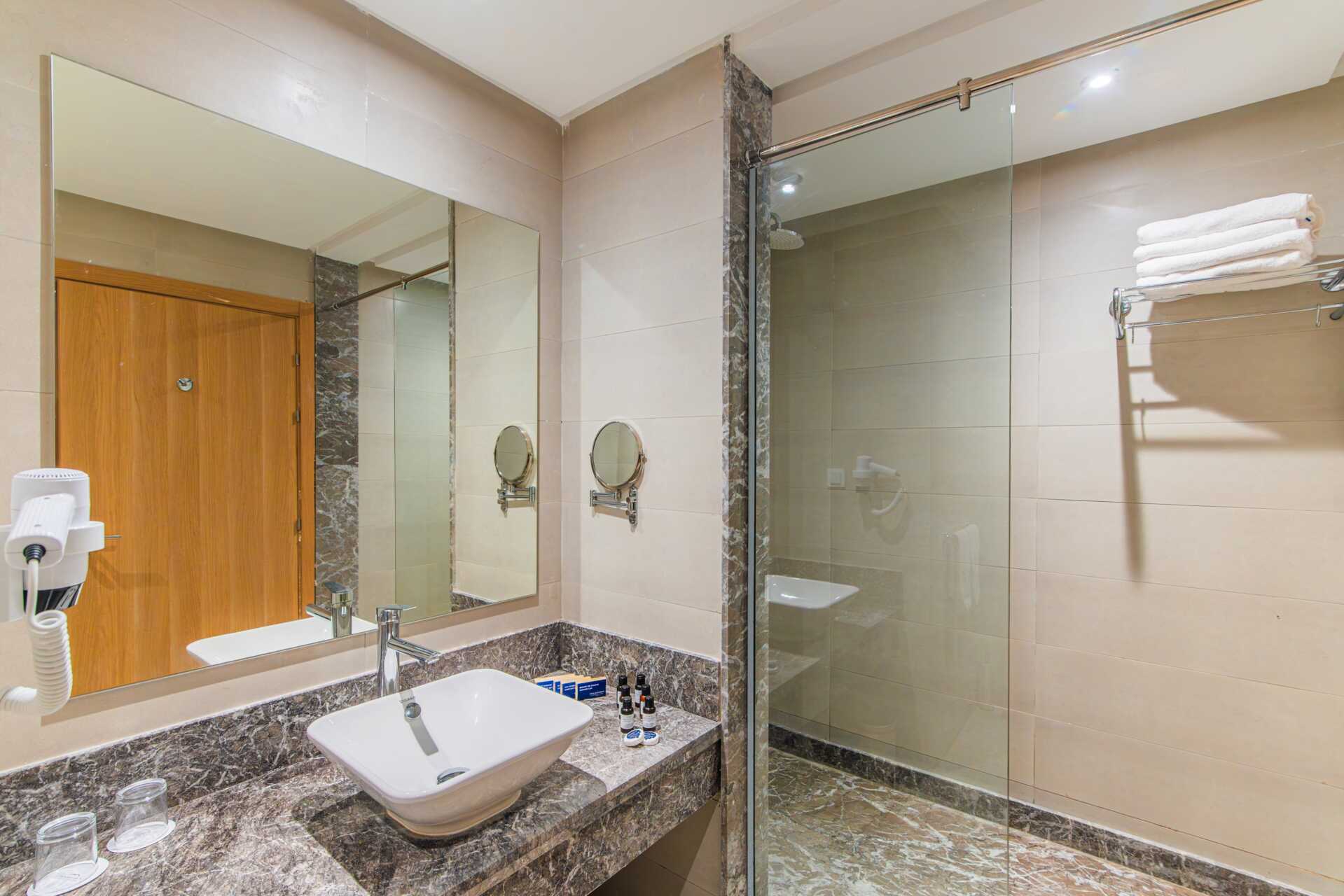 Dobbeltværelse med balkon eller terrasse. En dobbeltseng eller to enkeltsenge. Tv. Gratis wifi, aircondition og deponering. Hårtørrer. Badekar/bruser og toilet. Rengøring 7 gange om ugen.