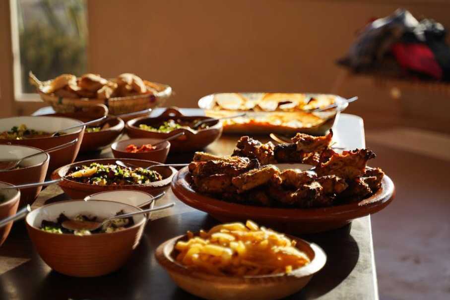 Når sulten melder sig, er der flere enkle strandcaféer at vælge imellem. Menuen er ofte en blanding af klassiske marokkanske retter, men også nogle vestlige favoritter. Her skal du prøve frisk fisk. Autentisk, lækker og med havudsigt!