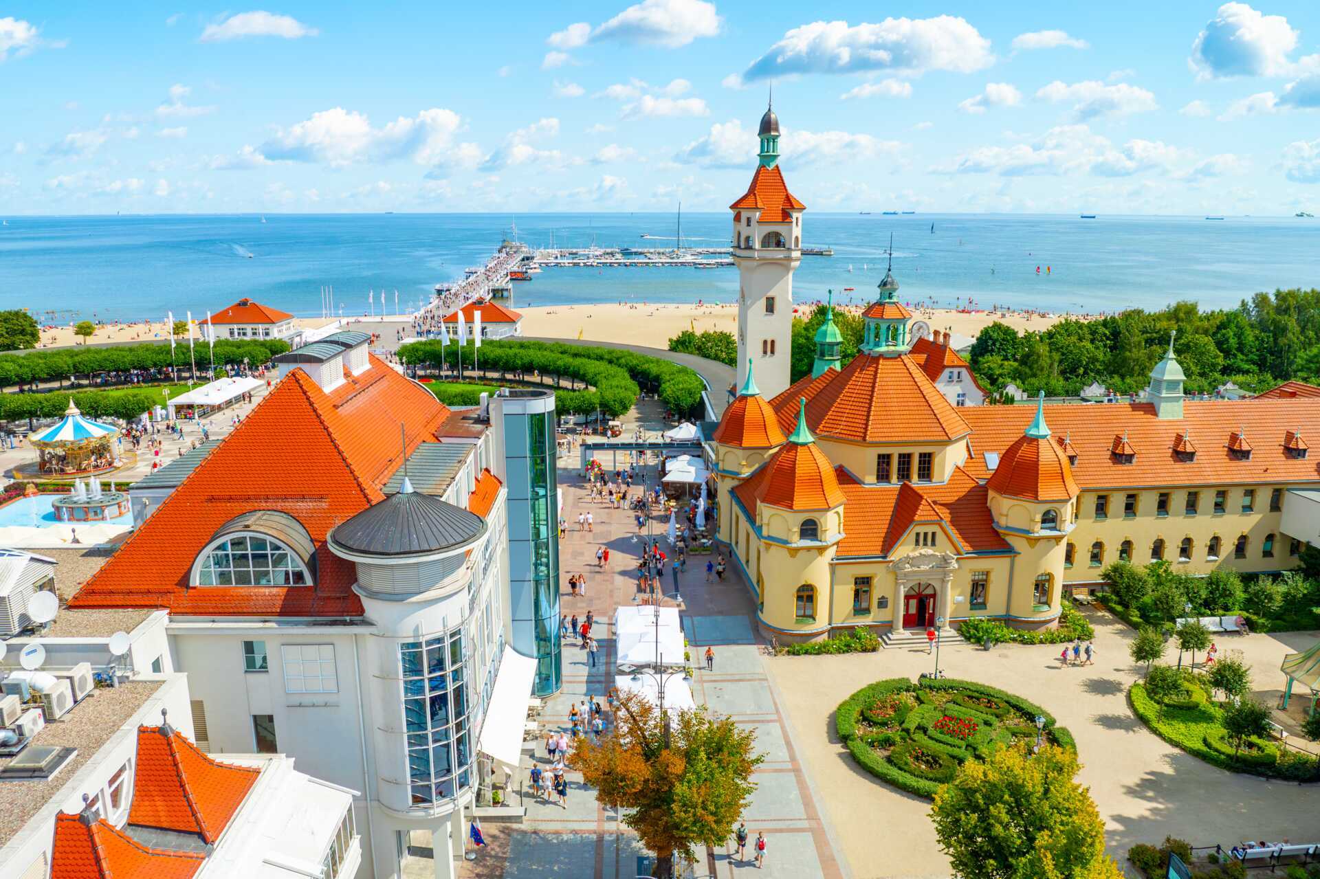 Stranden i Sopot er lang, bred og børnevenlig med blødt sand, der er lige så velegnet til at hænge ud i solstolen som til sandslotte og barfodsture langs vandet. Tag en gåtur ud på den klassiske træmole, der strækker sig direkte ud i havet, forkæl dig med en is eller stop og nyd udsigten. Fra stranden er der kun et stenkast til Sopots centrum, hvor ferielivet ruller lykkeligt videre fra morgen til sen aften. Langs Monte Cassino sameksisterer caféer, restauranter, barer og små butikker, og tempoet er helt tilpas, afslappet. Her er det lige så nemt at slå sig ned til en lang frokost, som det er at tage en sen aftentur tilbage mod havet.