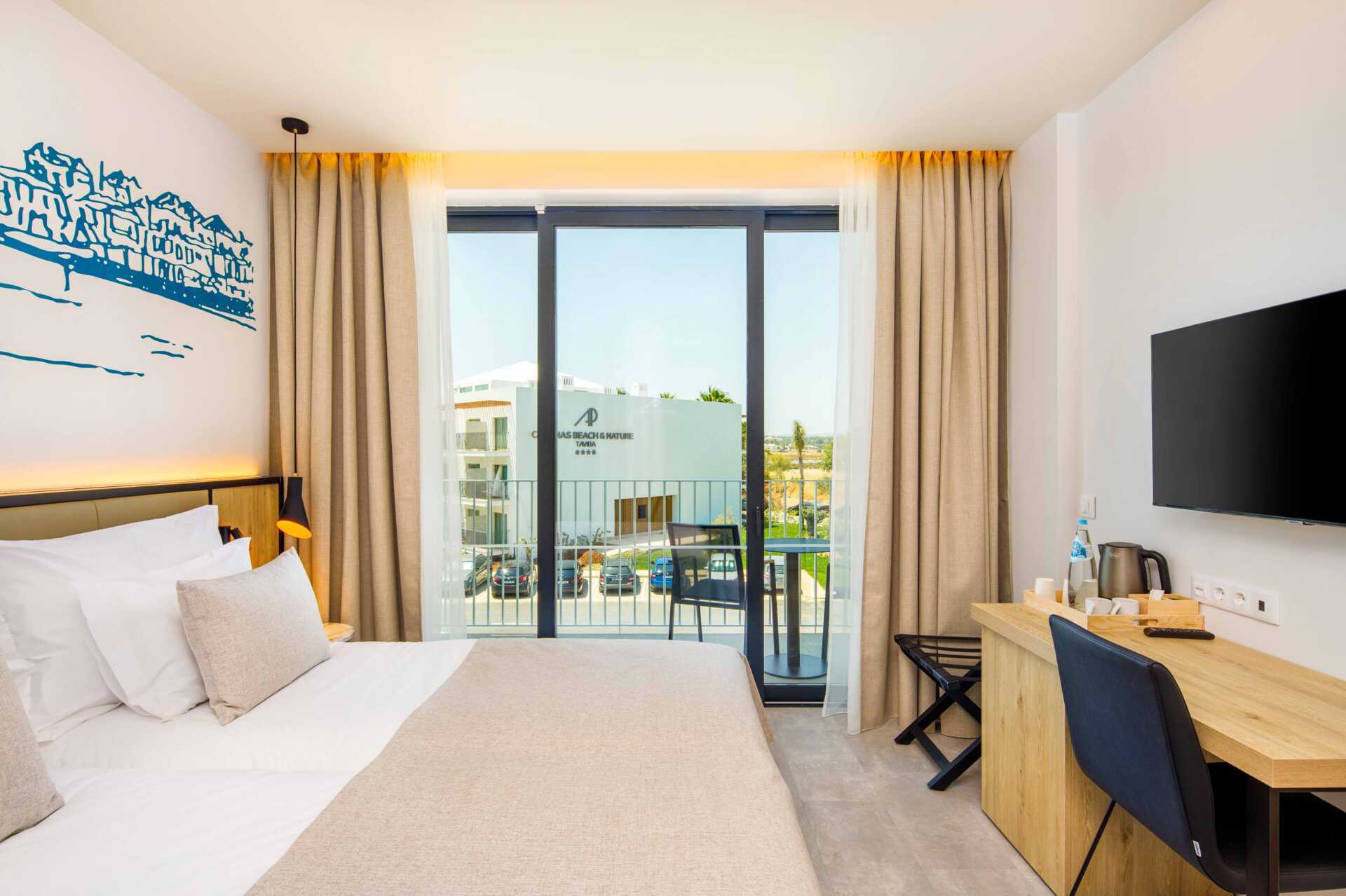 Dobbeltværelser med balkon, nogle med pooludsigt. To enkeltsenge. Gratis wifi og aircondition. Deponering mod depositum. El-kedel og kaffe/te. Tv med internationale kanaler. Hårtørrer. Badeværelse med bruser og toilet. Rengøring 7 gange om ugen.