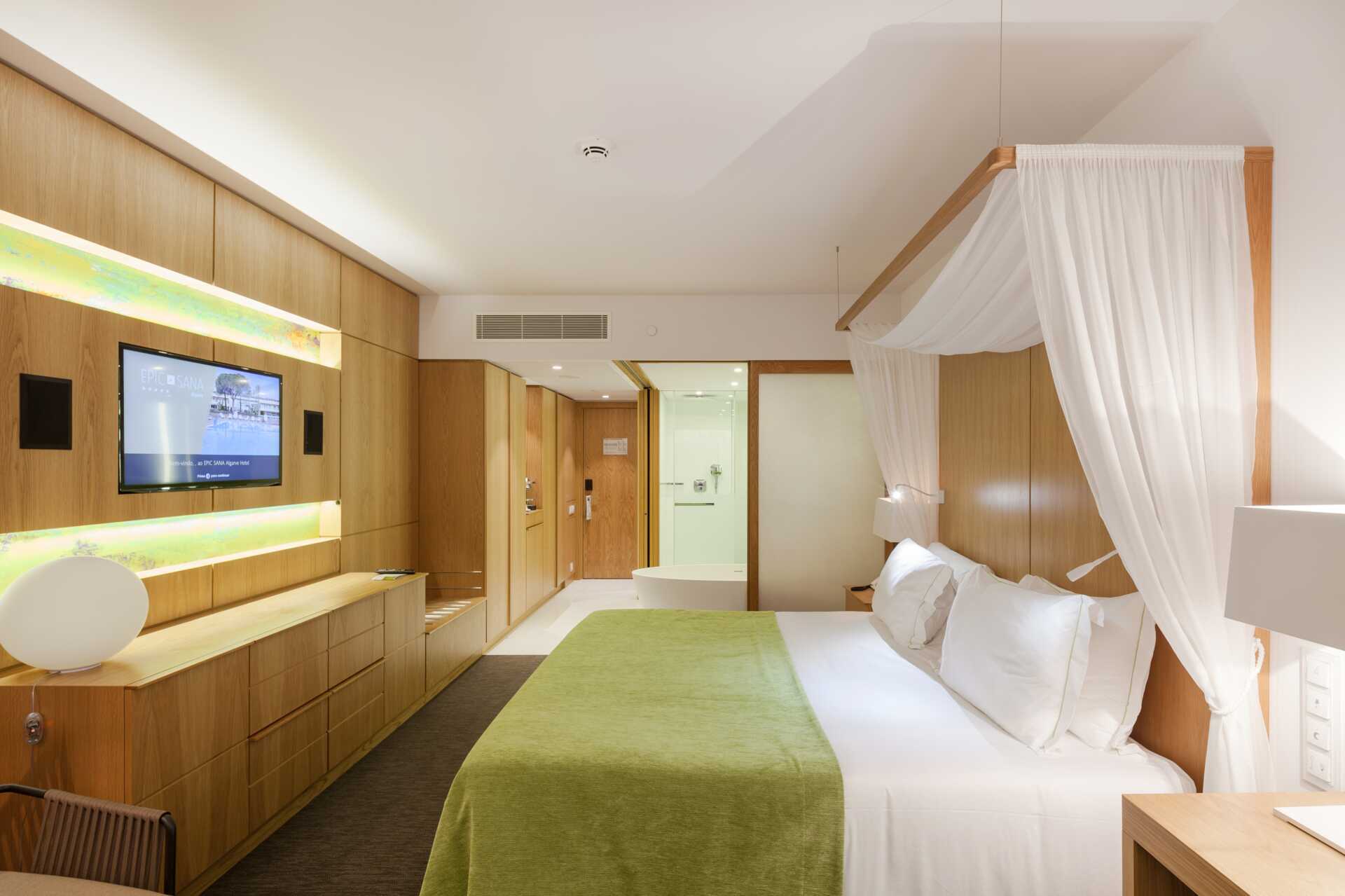 Deluxe-værelser med balkon eller terrasse, nogle vender mod havet og nogle vender mod poolen, men grønne planter skygger for udsigten. Gratis wifi, aircondition og deponering. To enkeltsenge eller en dobbeltseng. Minibar. Nespresso kaffemaskine med kapsler. Tv med internationale kanaler. Hårtørrer. Badekåber og tøfler. Badeværelse med badekar eller bruser samt toilet. Rengøring 7 gange om ugen. Børn under to år tæller med i det maksimale antal personer på værelset.