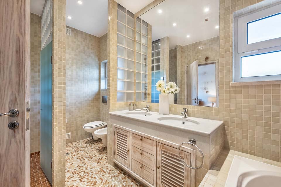 Toilet, Dobbelt håndvask, Bidet, Brusekabine, Badekar