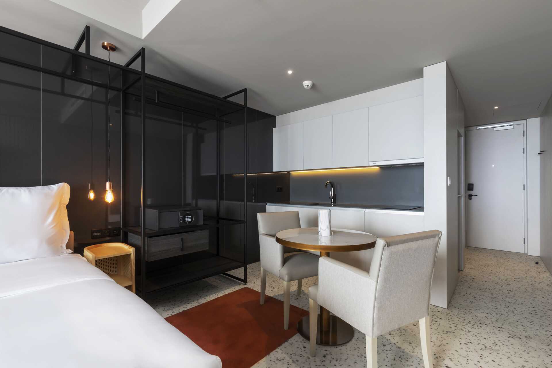 1-værelses lejligheder med balkon. Soveværelse kombineret med minikøkken. En dobbeltseng eller to enkeltsenge. Minikøkken med kogeplader, køleskab, el-kedel og enkelt køkkenudstyr. Gratis wifi og aircondition. Deponering mod betaling. Tv med internationale kanaler. Hårtørrer. Badeværelse med bruser og toilet. Rengøring 7 gange om ugen. Børn under to år tæller med i det maksimale antal personer på værelset.