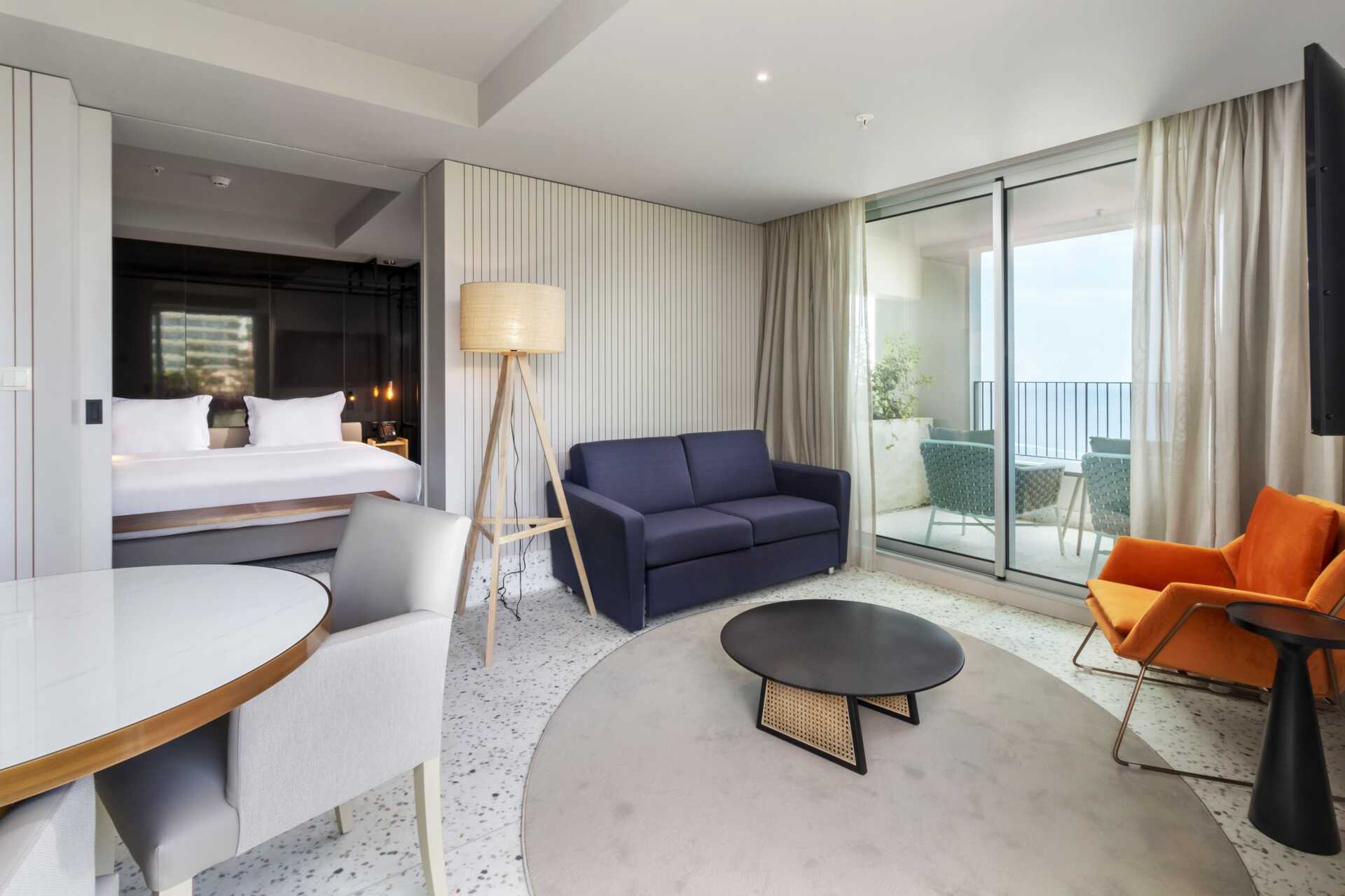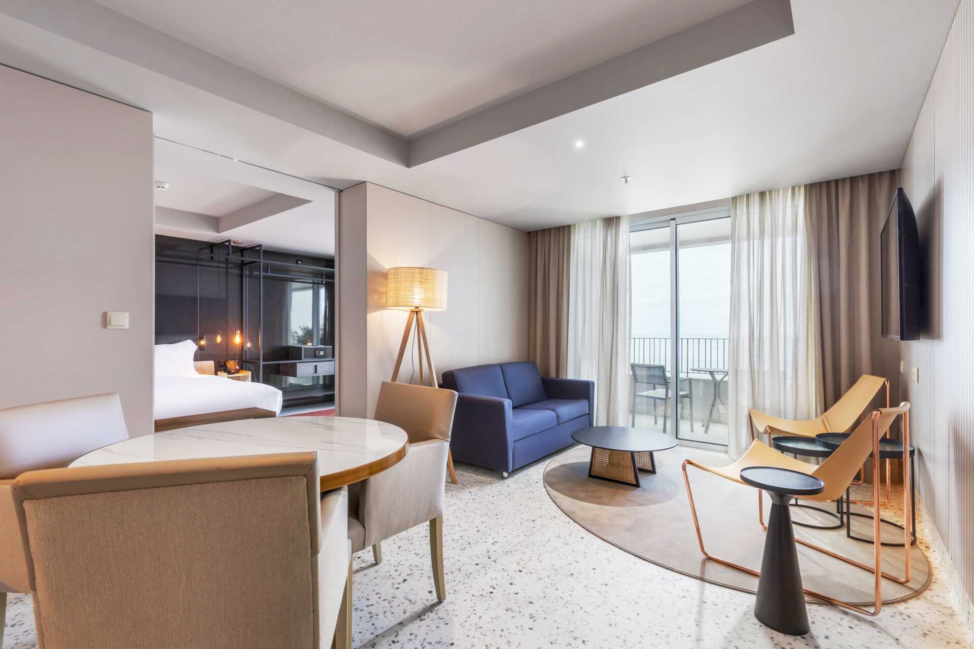 Suite med balkon. Suiterne består af et soveværelse og et opholdsrum, der kan adskilles med en skydedør. En dobbeltseng eller to enkeltsenge. Mulighed for ekstra opredninger i sovesofa. Børn i alderen 3 til 13 år kan bookes i suiten med plads til to børn i en ekstra opredninger. Gratis wifi og aircondition. Deponering mod betaling. Minibar. El-kedel og kaffe/te. Tv med internationale kanaler. Badekåber og tøfler. Hårtørrer. Badeværelse med bruser og toilet. Rengøring 7 gange om ugen. Børn under to år tæller med i det maksimale antal personer på værelset.